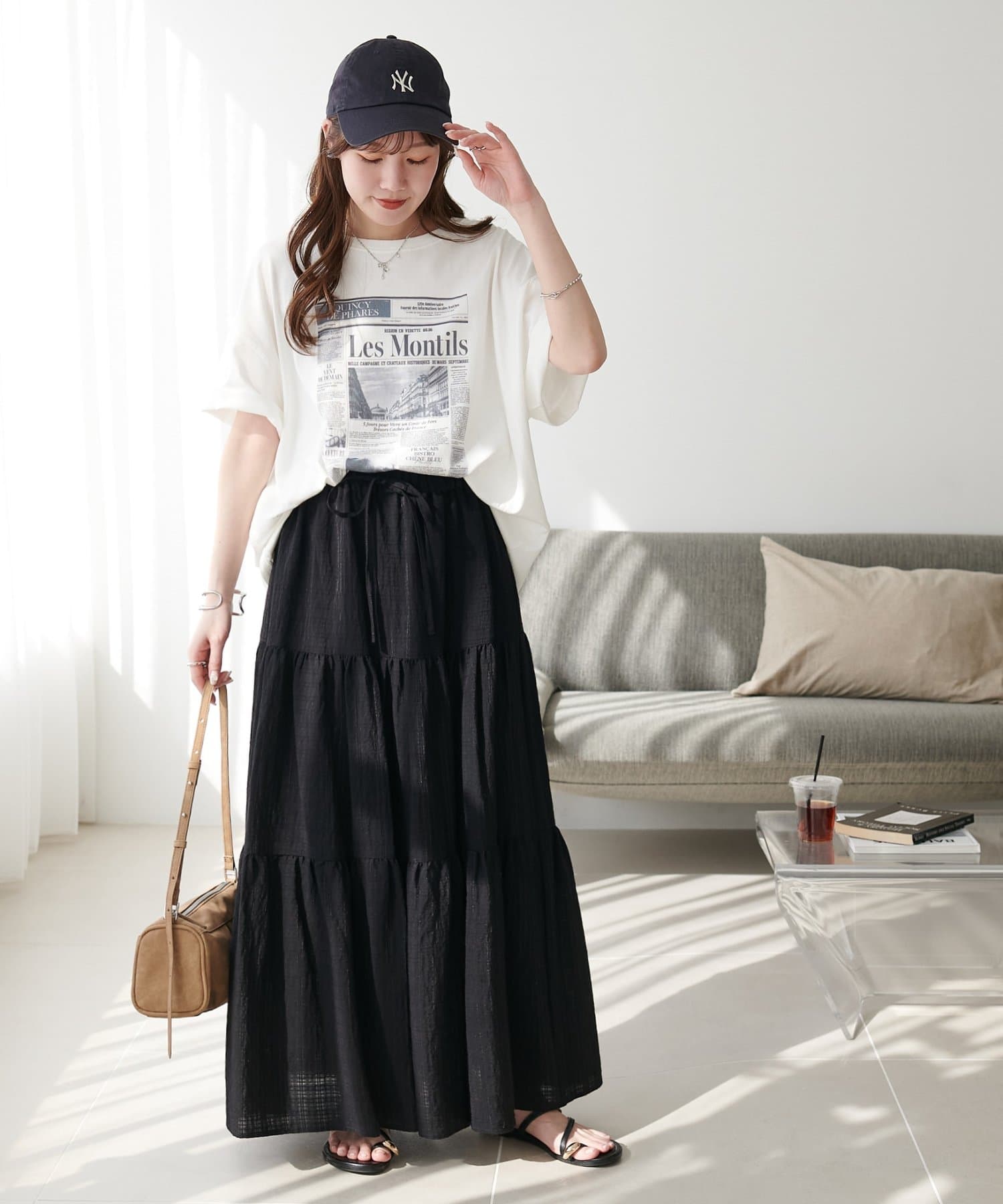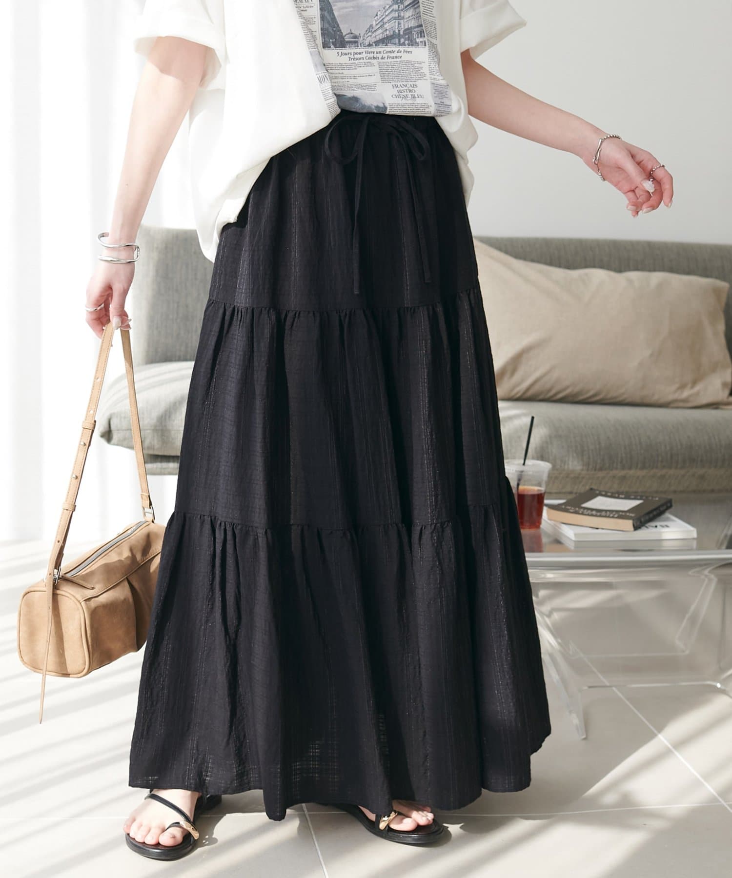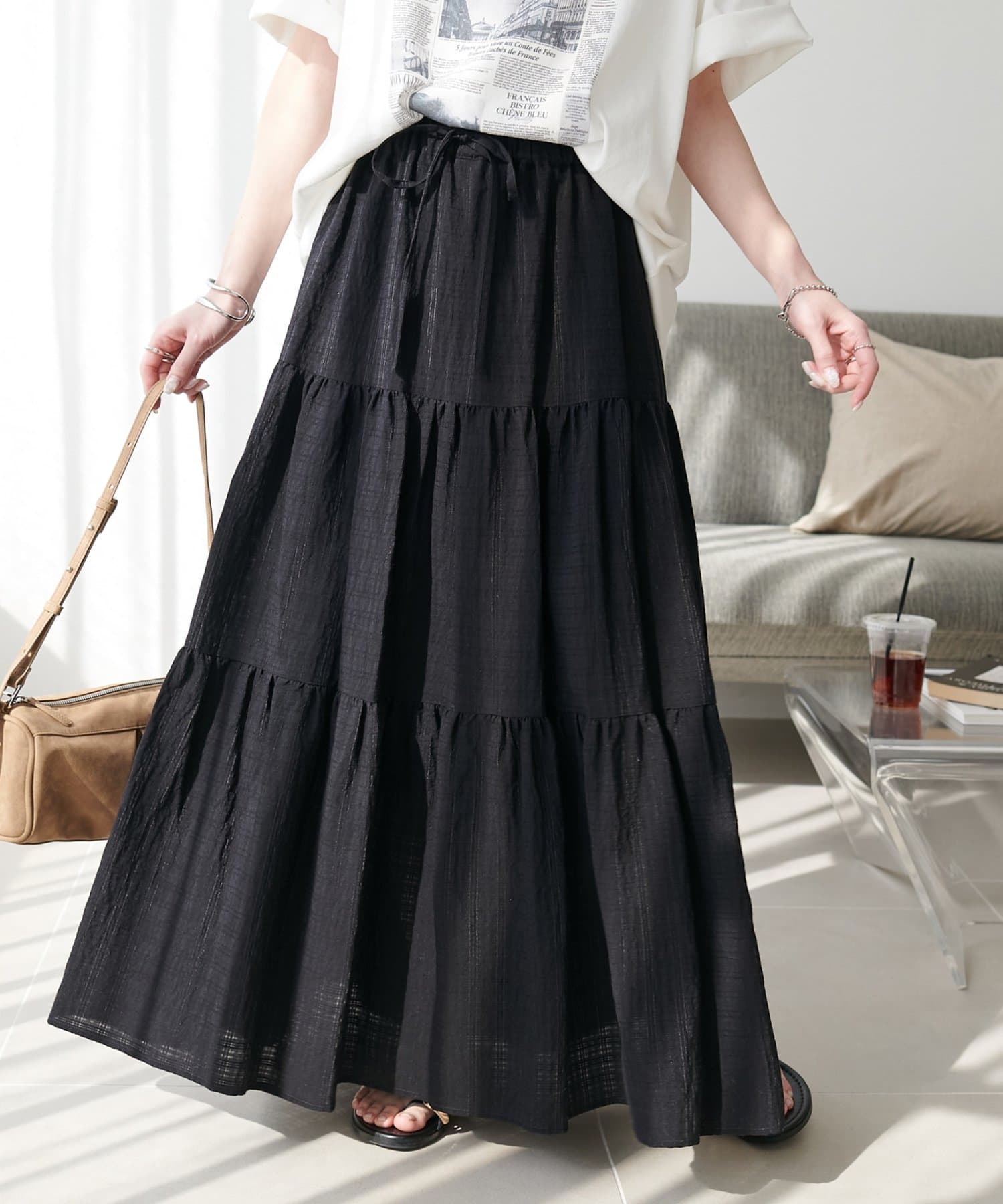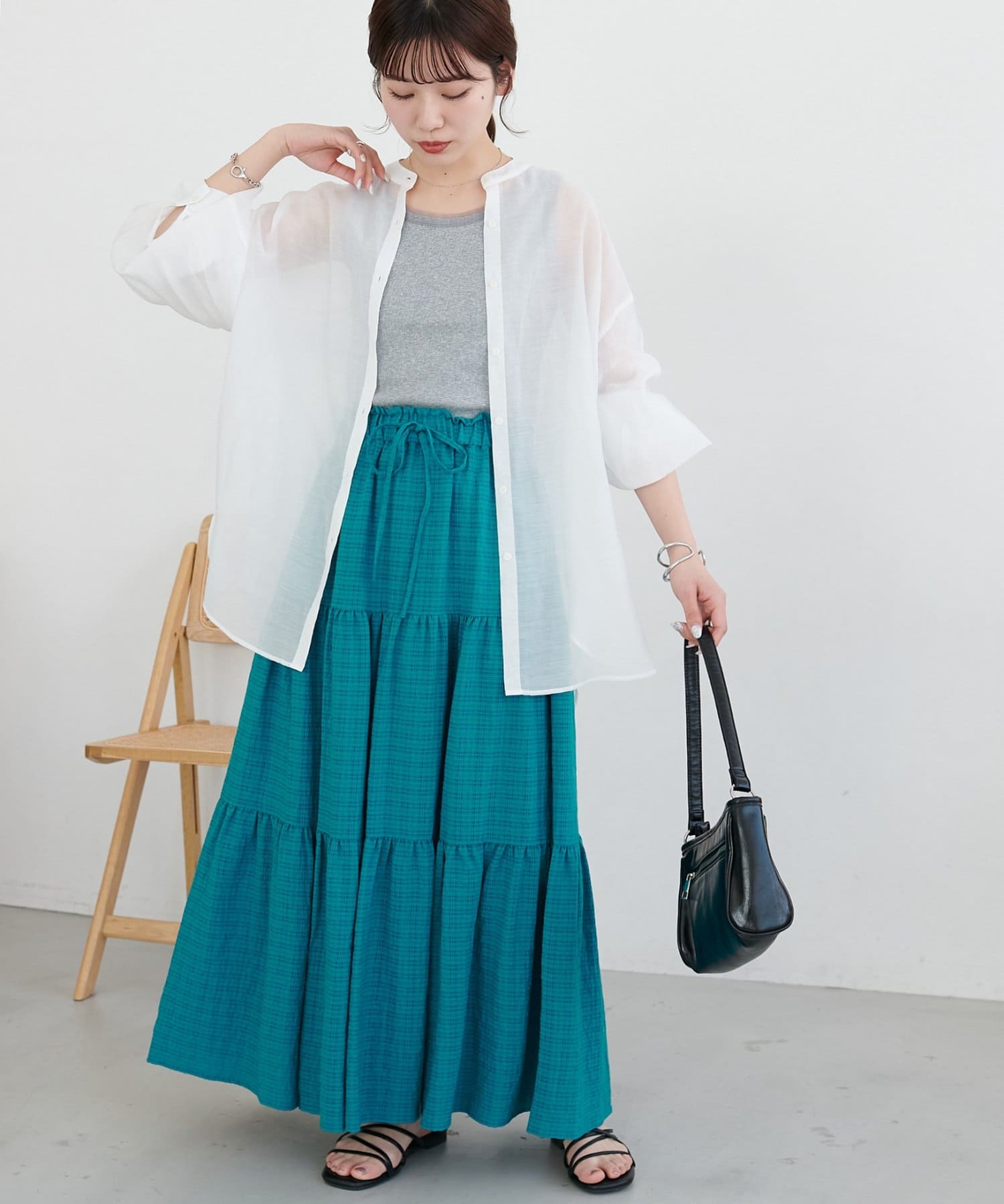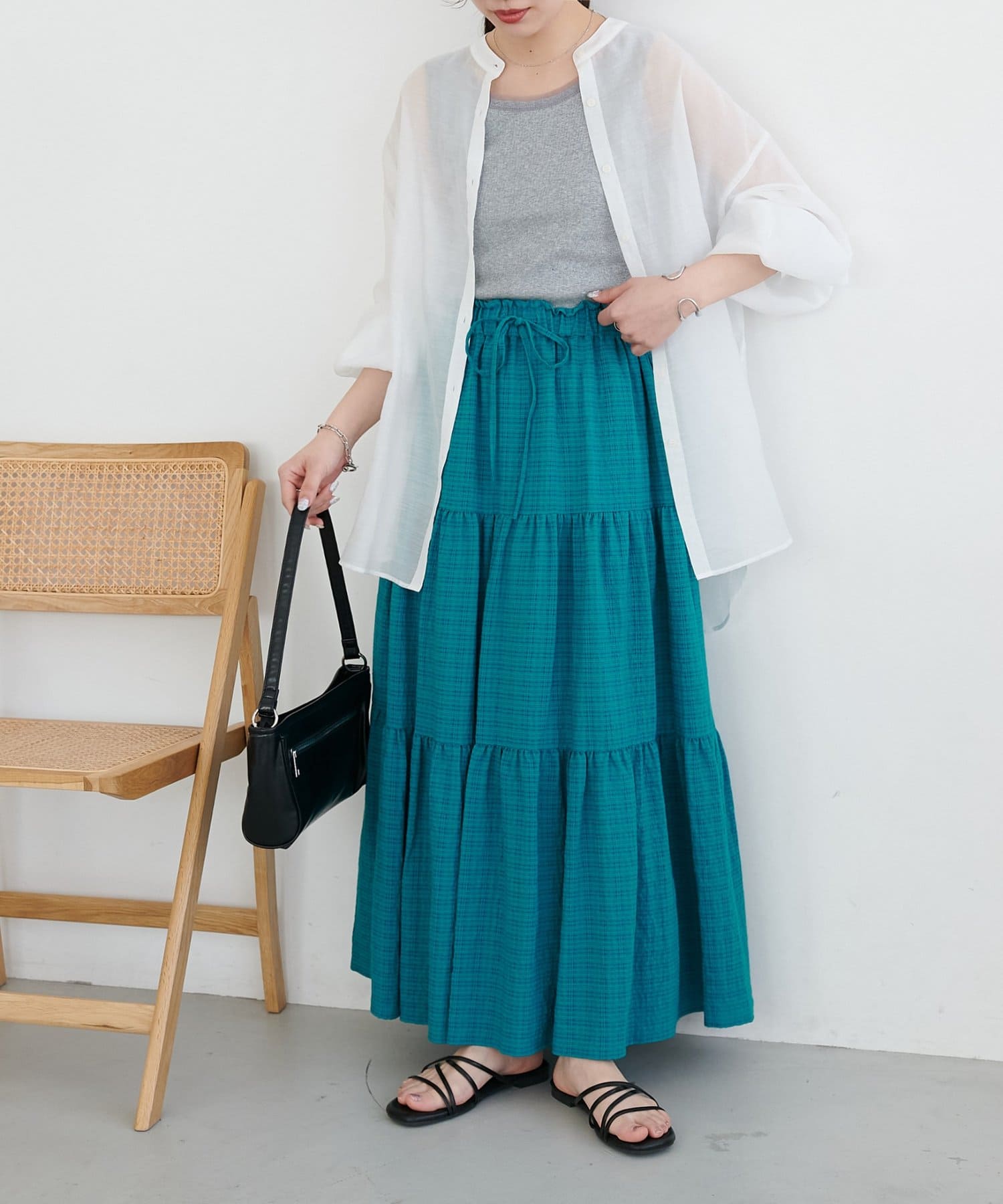 軽やかな揺れ感が魅力、大人のシアーチェックティアードスカート