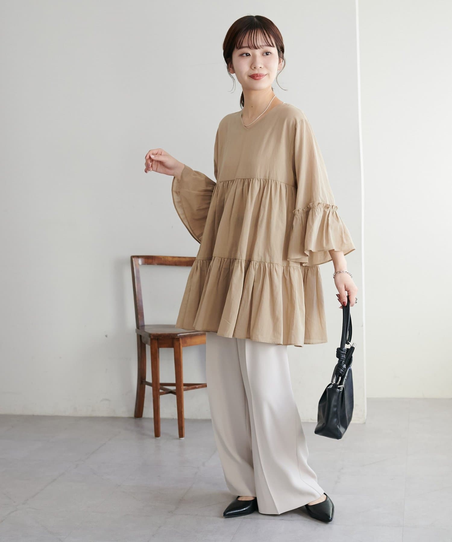 ・テーパードパンツや細身パンツと合わせて、甘さを抑えた大人コーデに