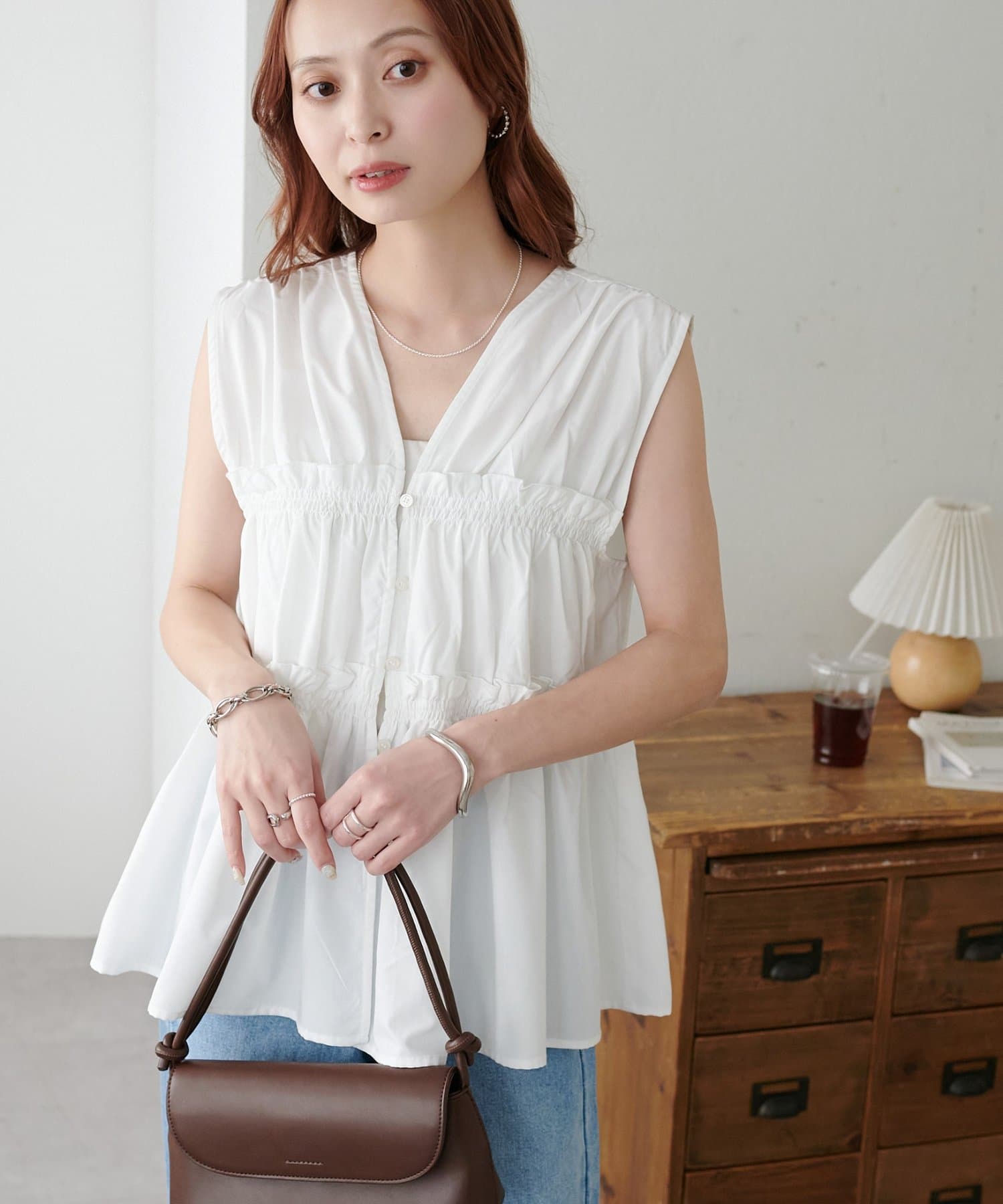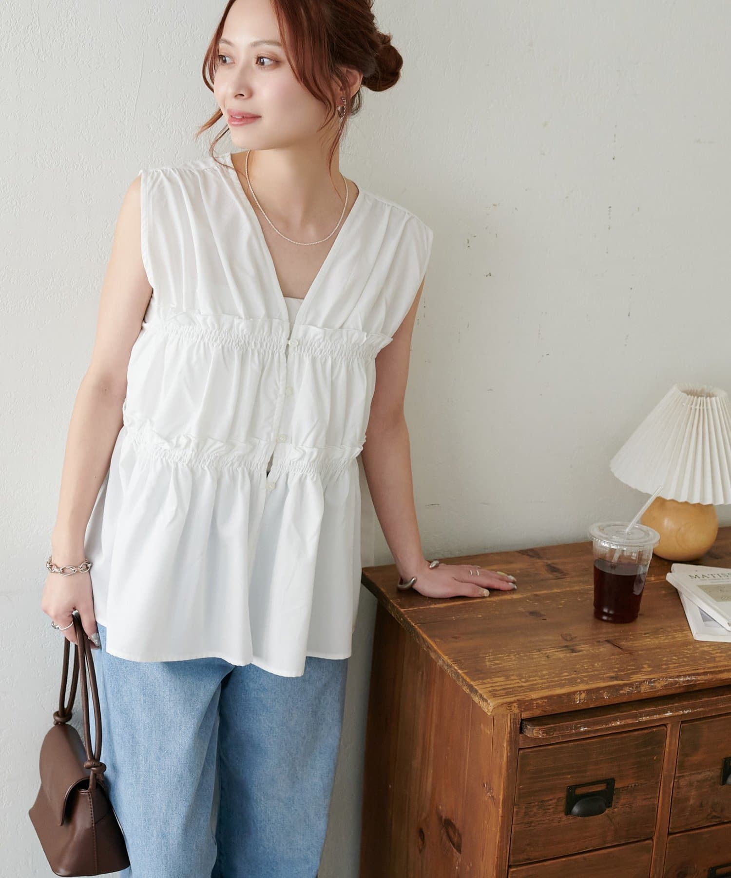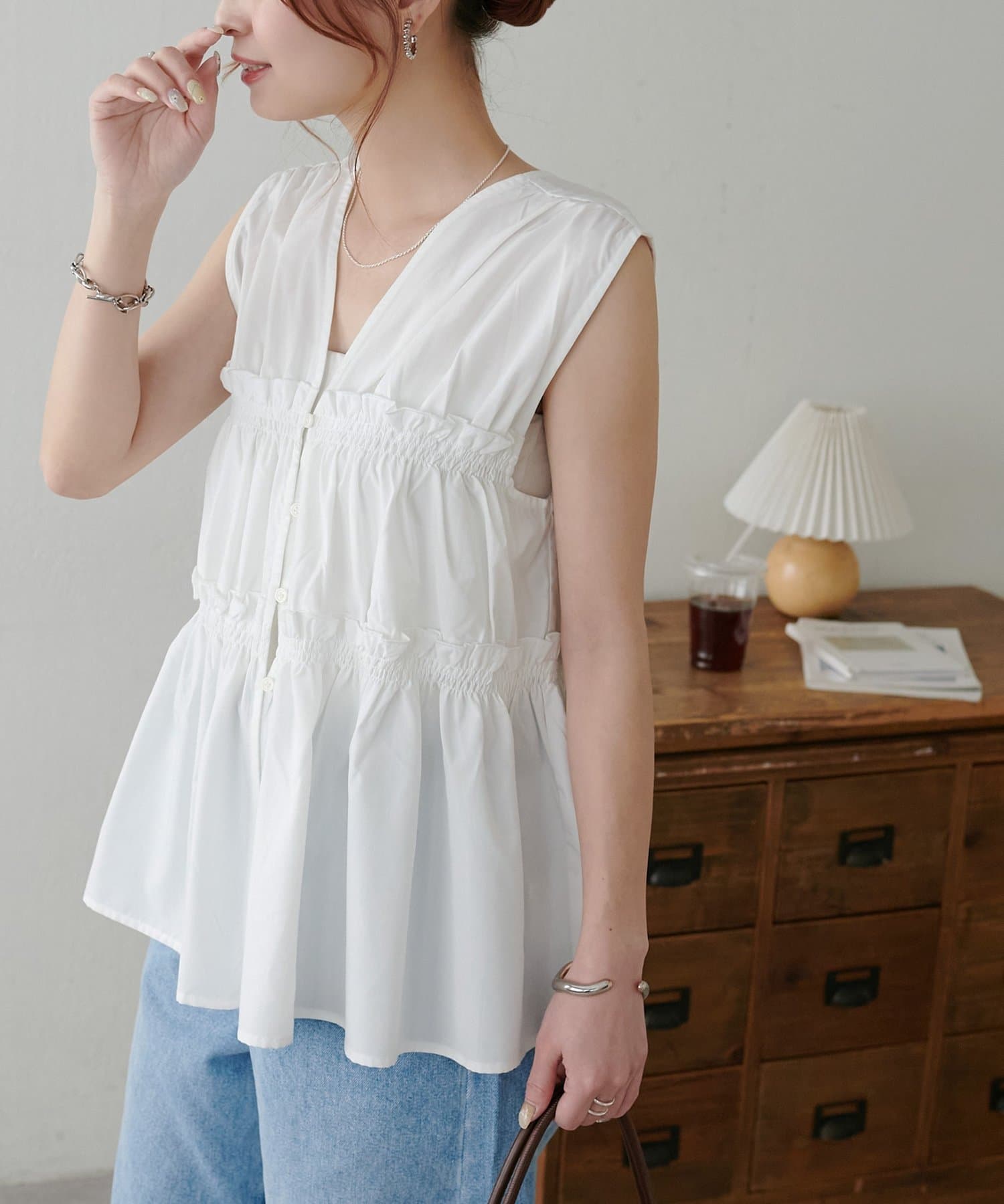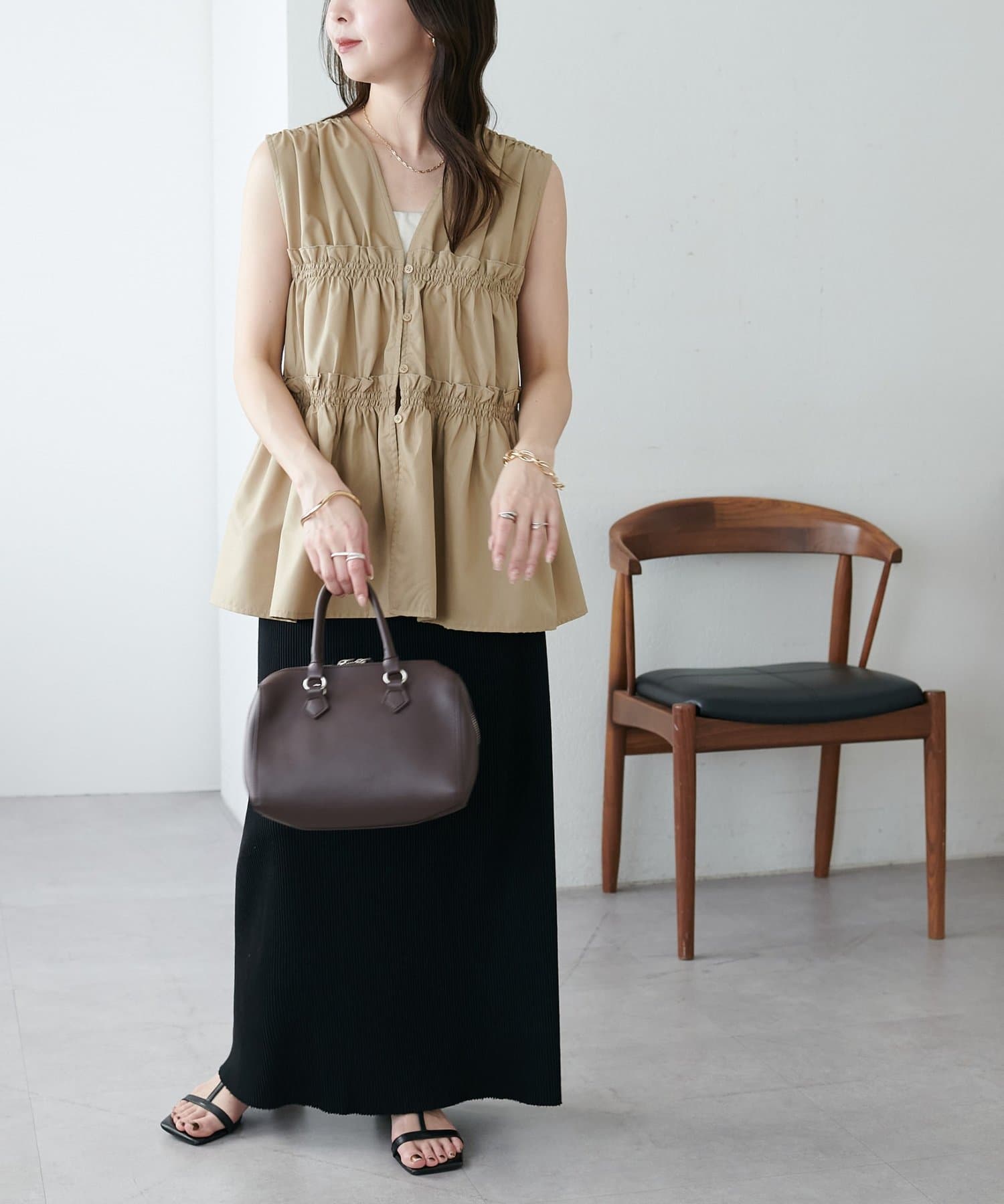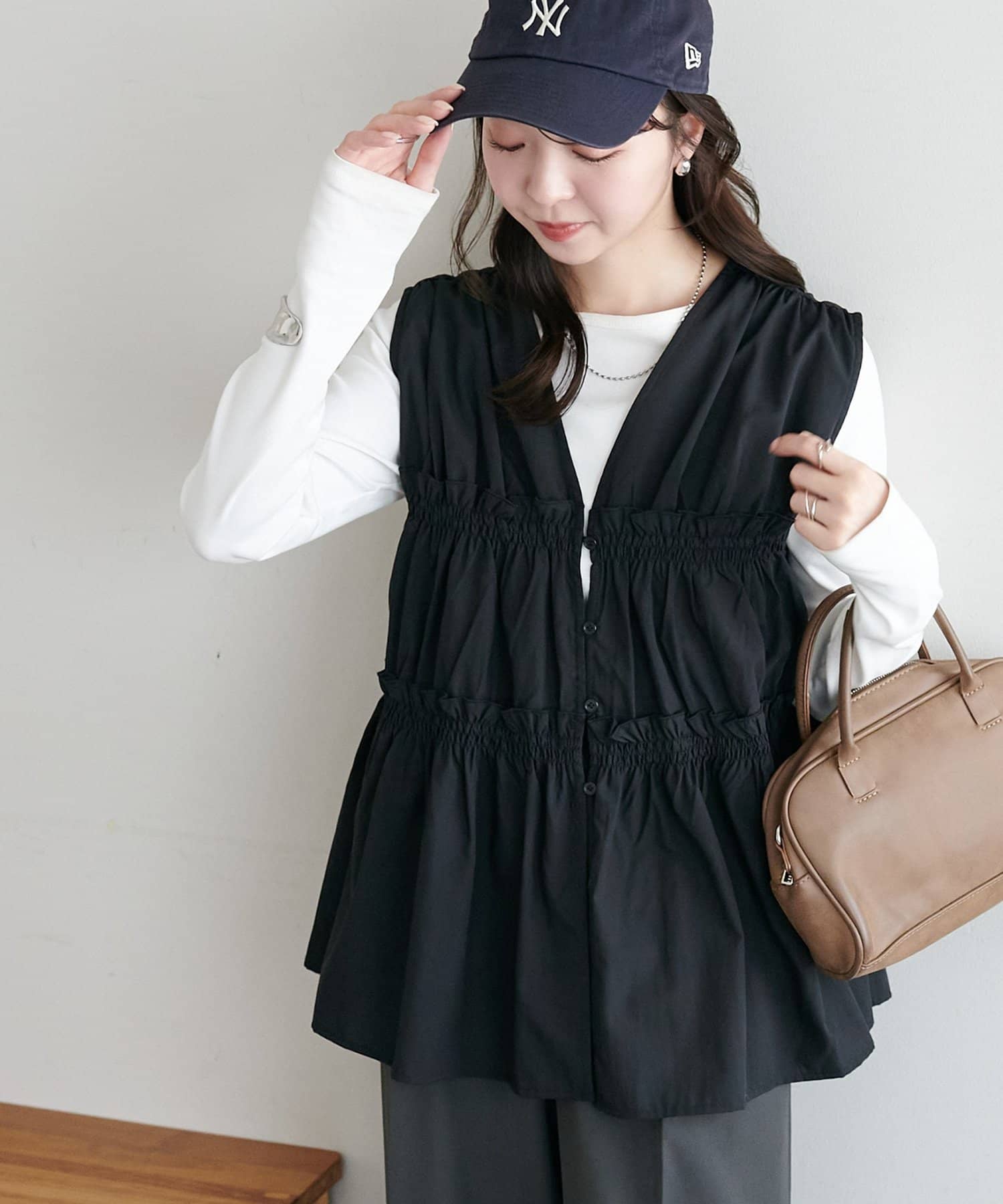 ・ワンピースの上にジレとしてレイヤードすると、いつもの着こなしがぐっと新鮮な印象に仕上がります。