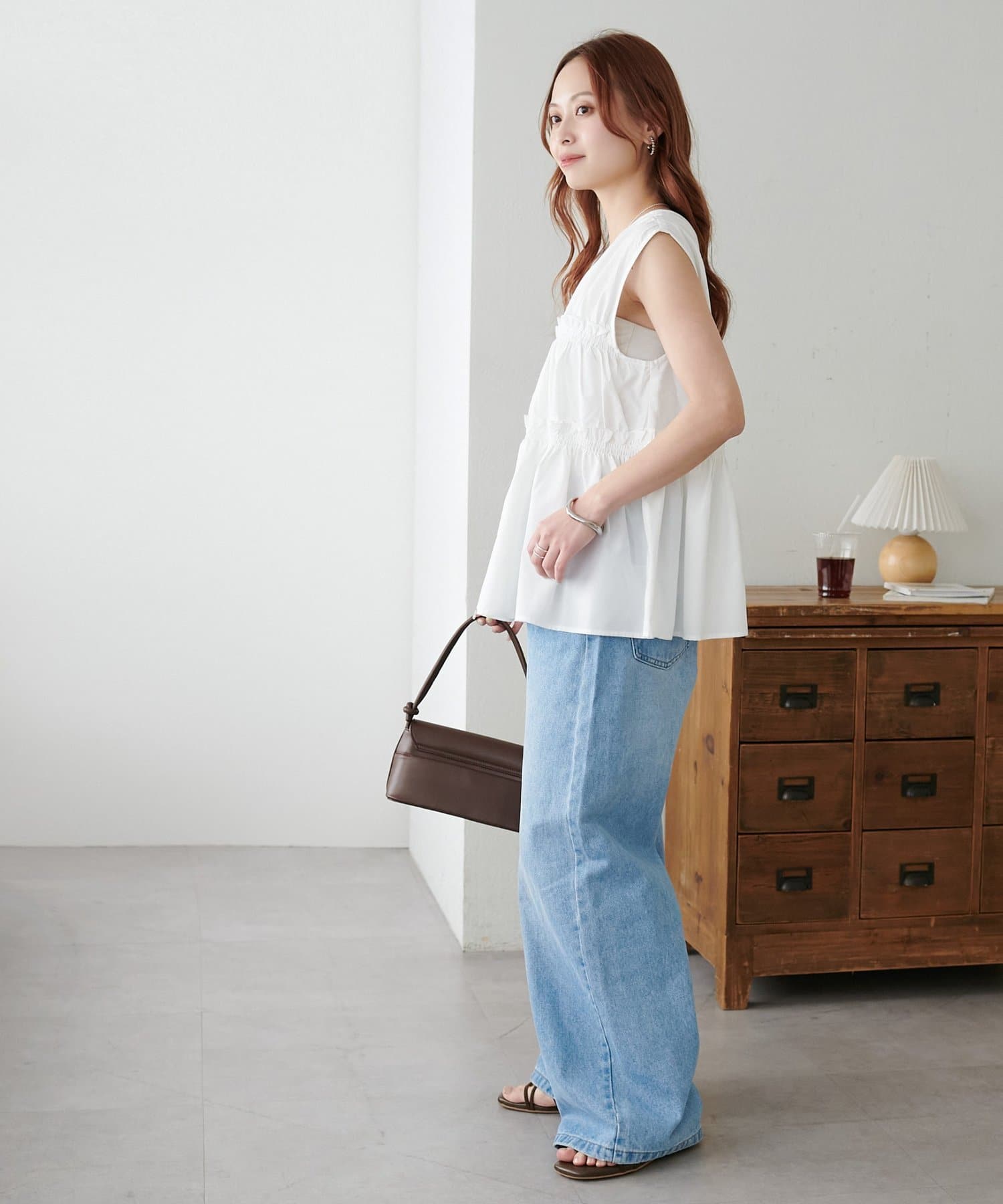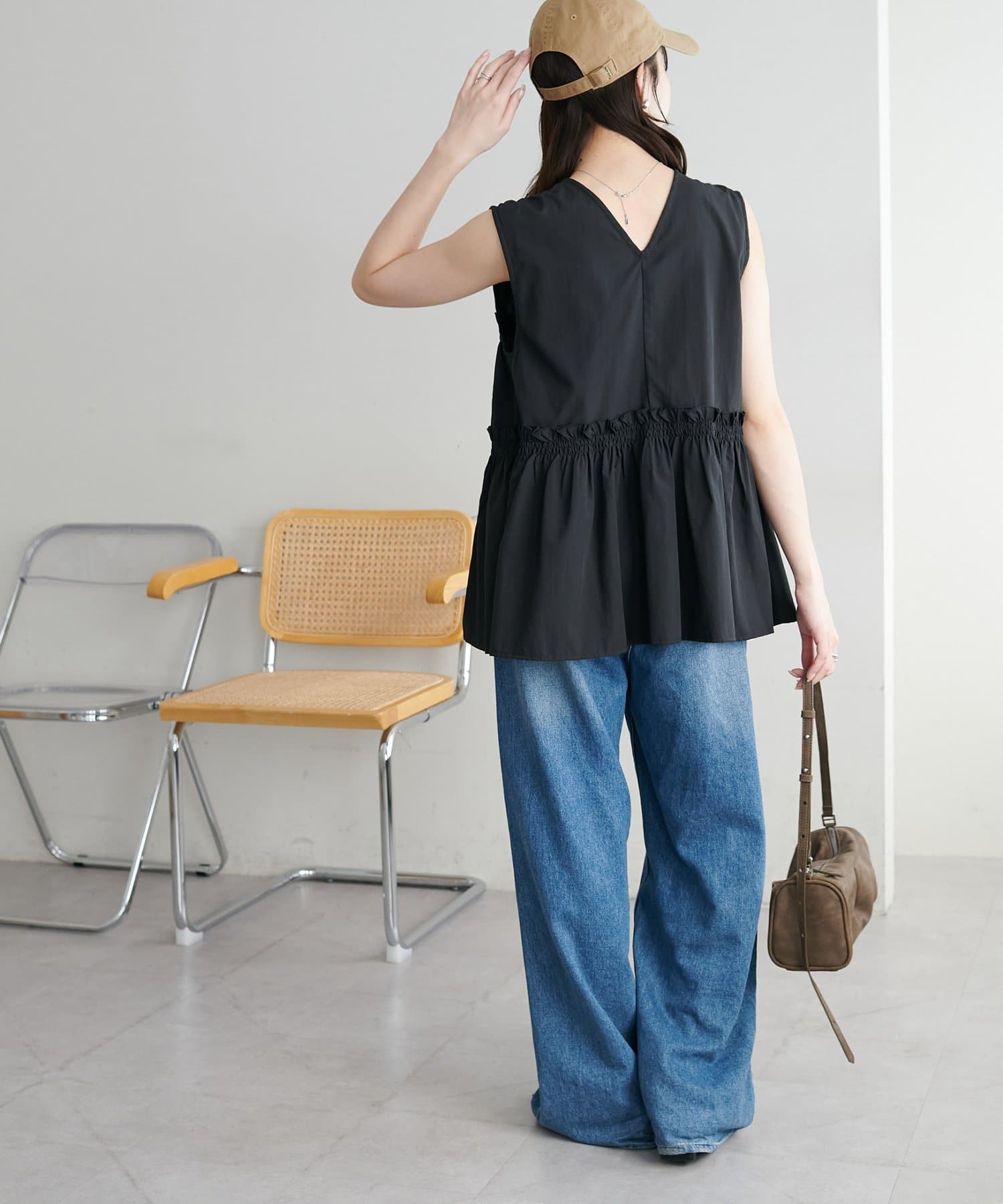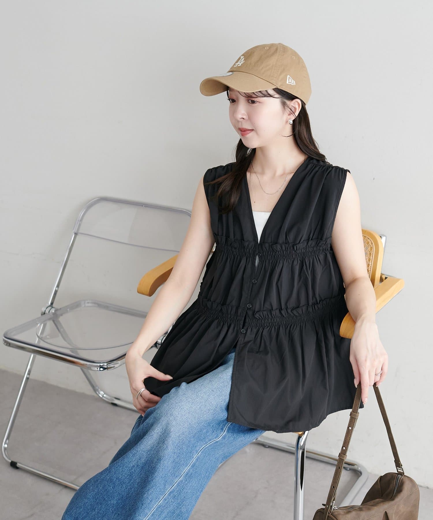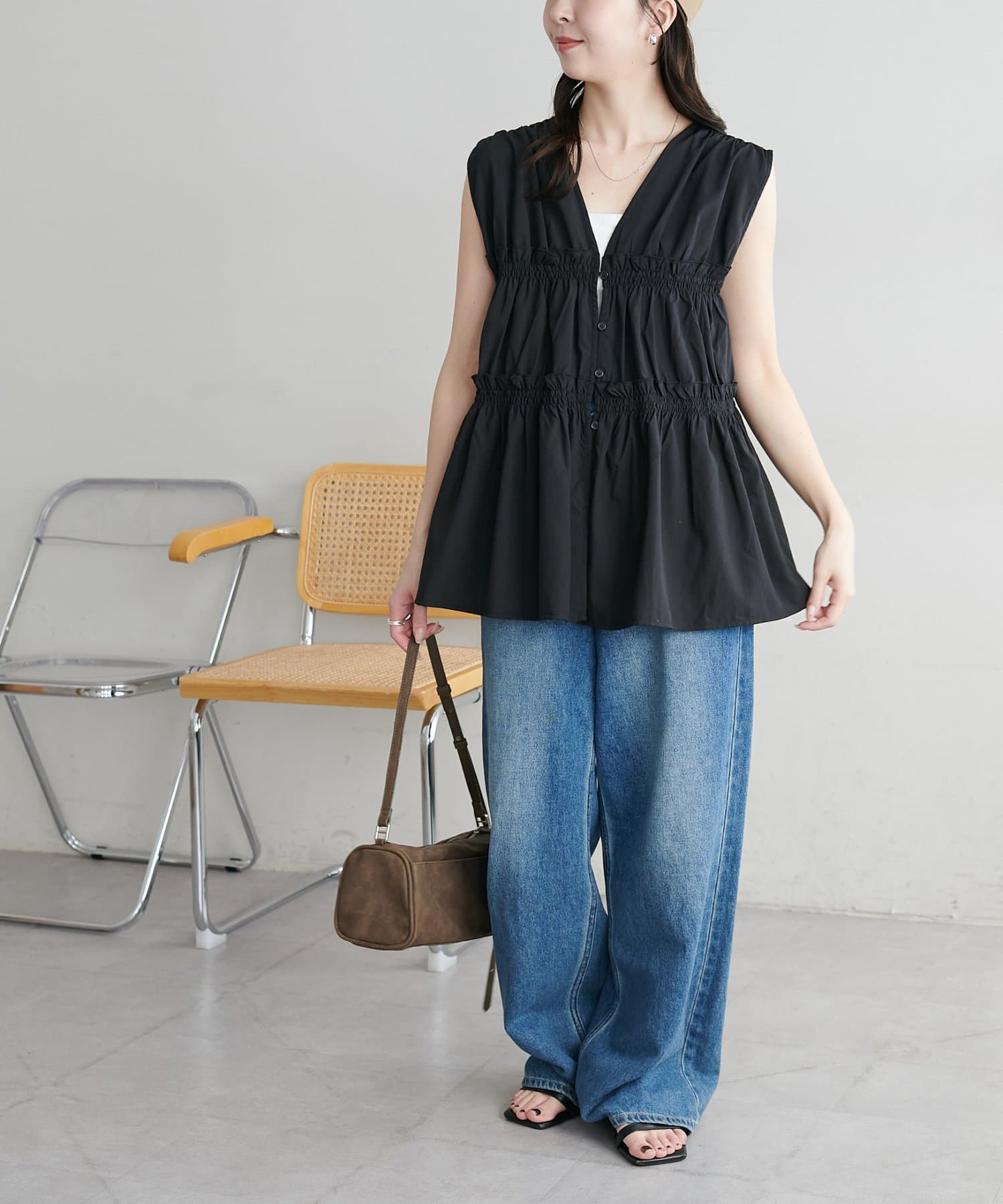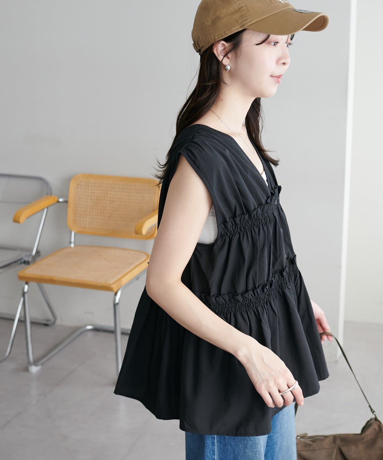 シャーリングや深めのVネックデザインで目線が上がり、小柄でもバランス良く着こなせました!