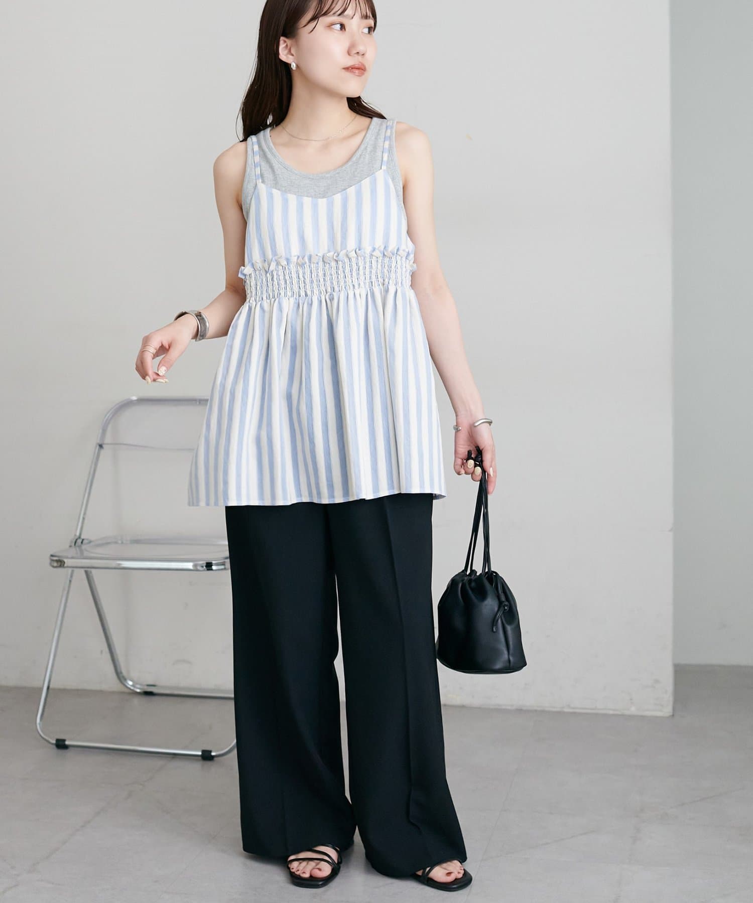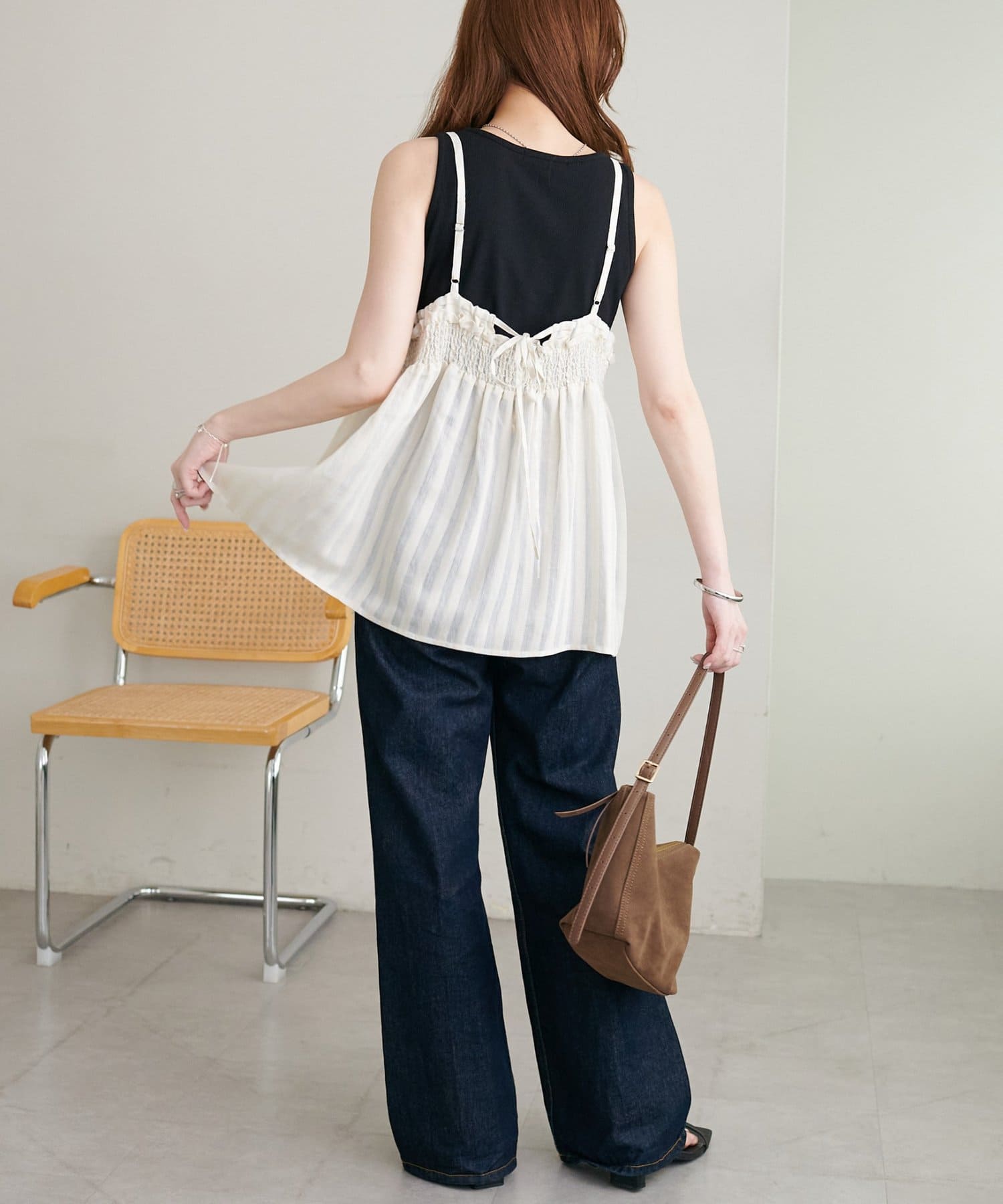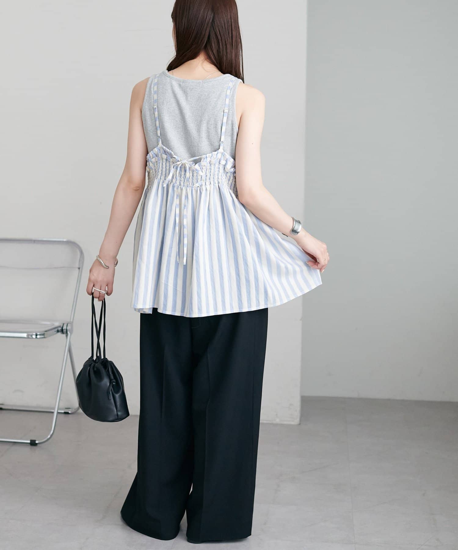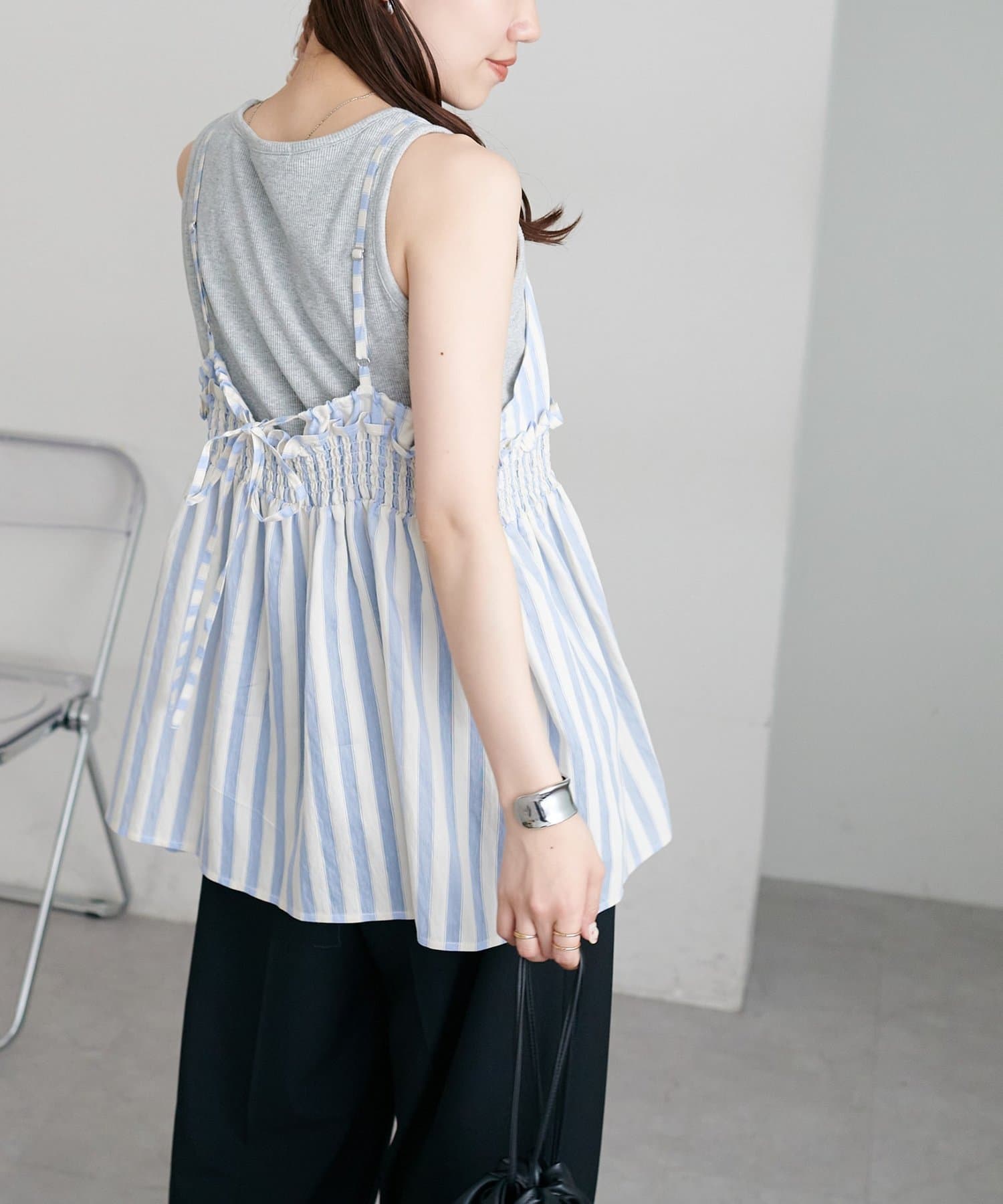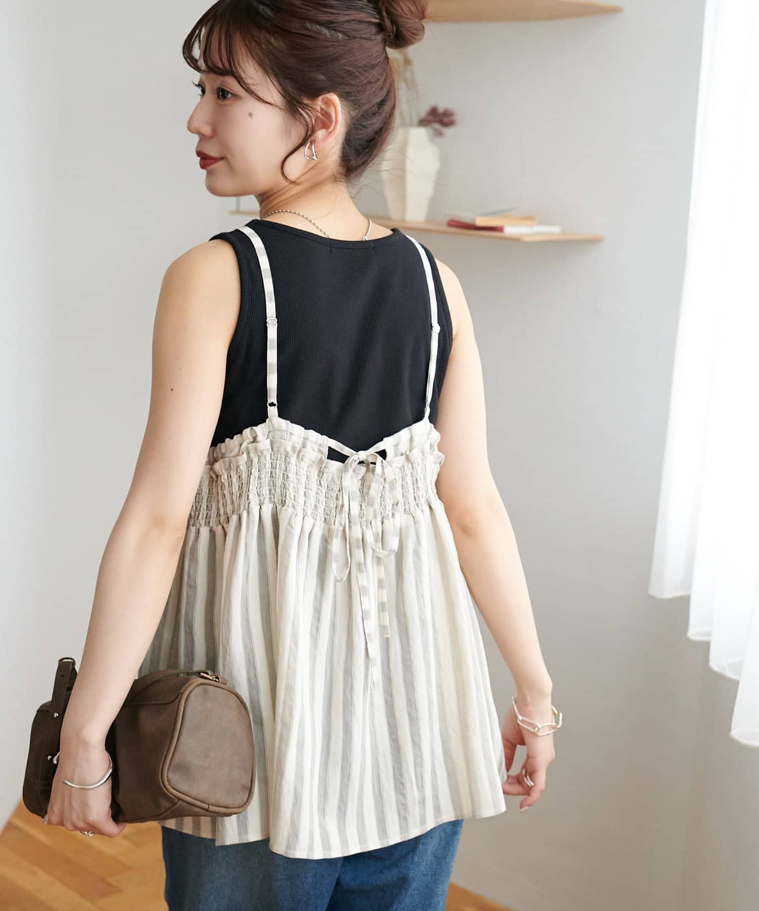 164cmスタッフ:薄手のカットソーを中に着てもごわつかないサイズ感で、レイヤードスタイルが楽しめます。肩紐の華奢さが、上半身をすっきりと見せてくれます♪