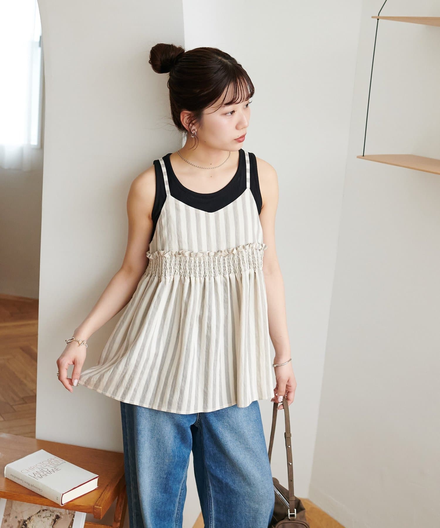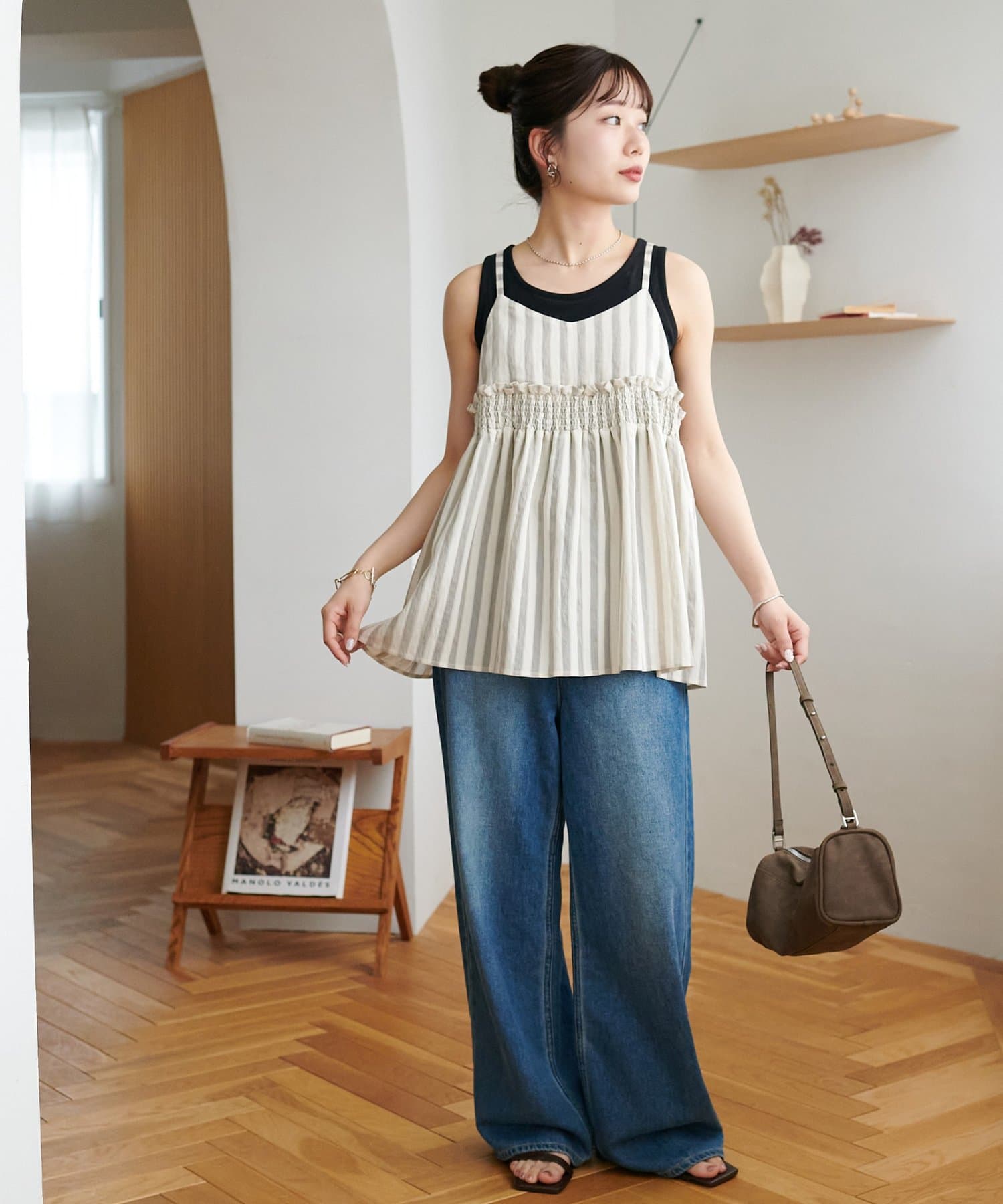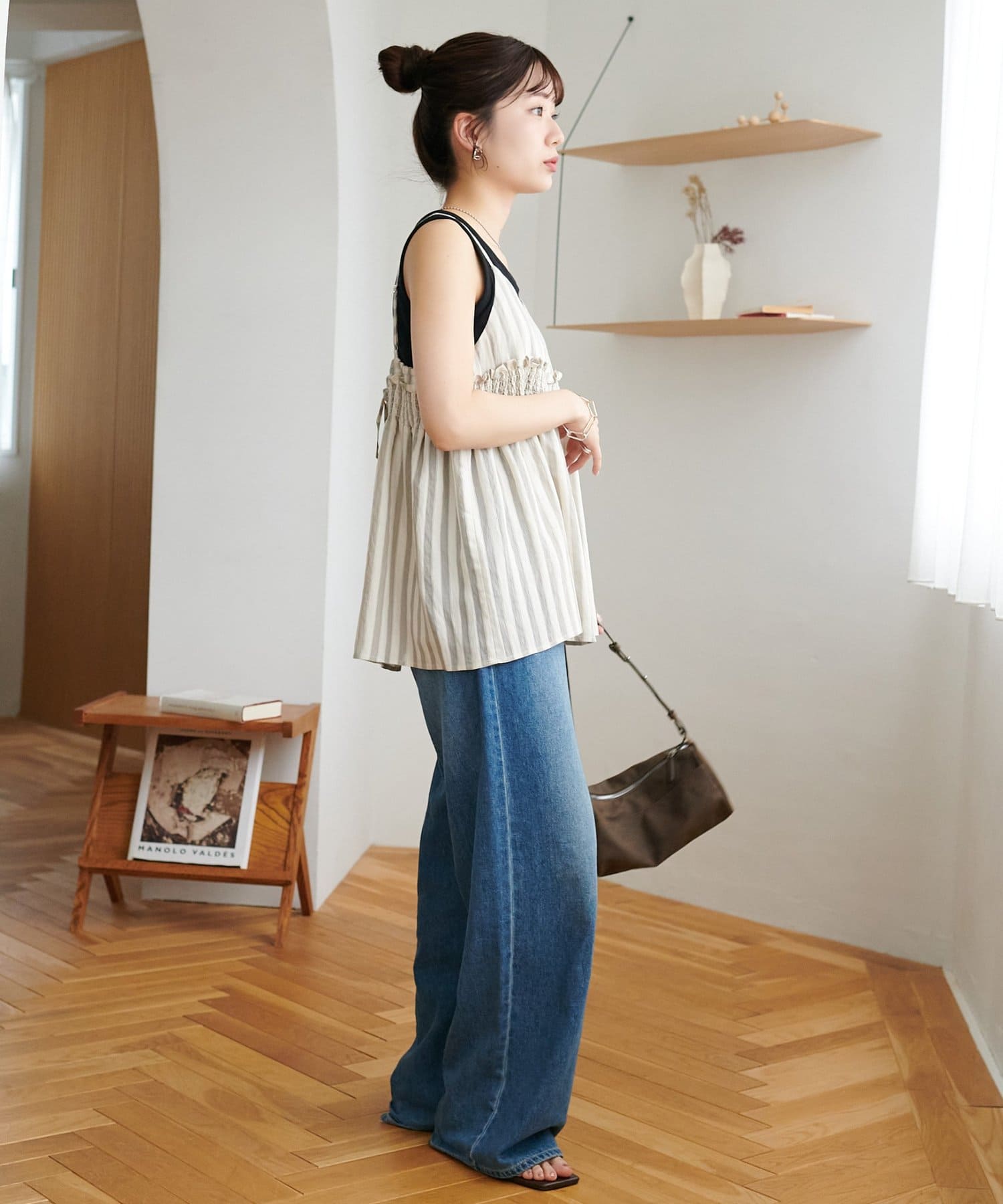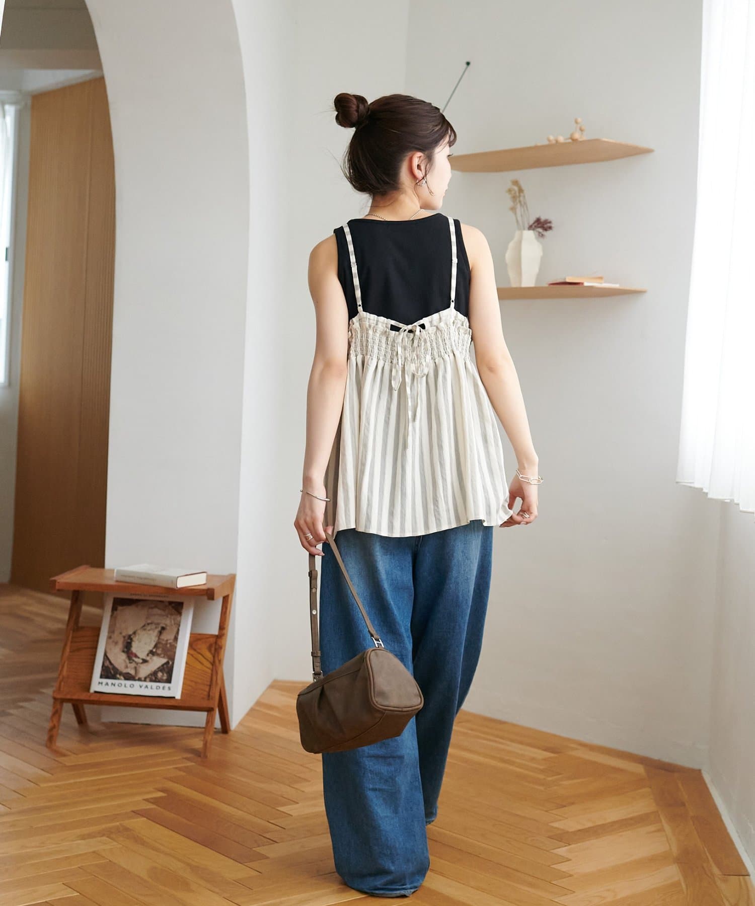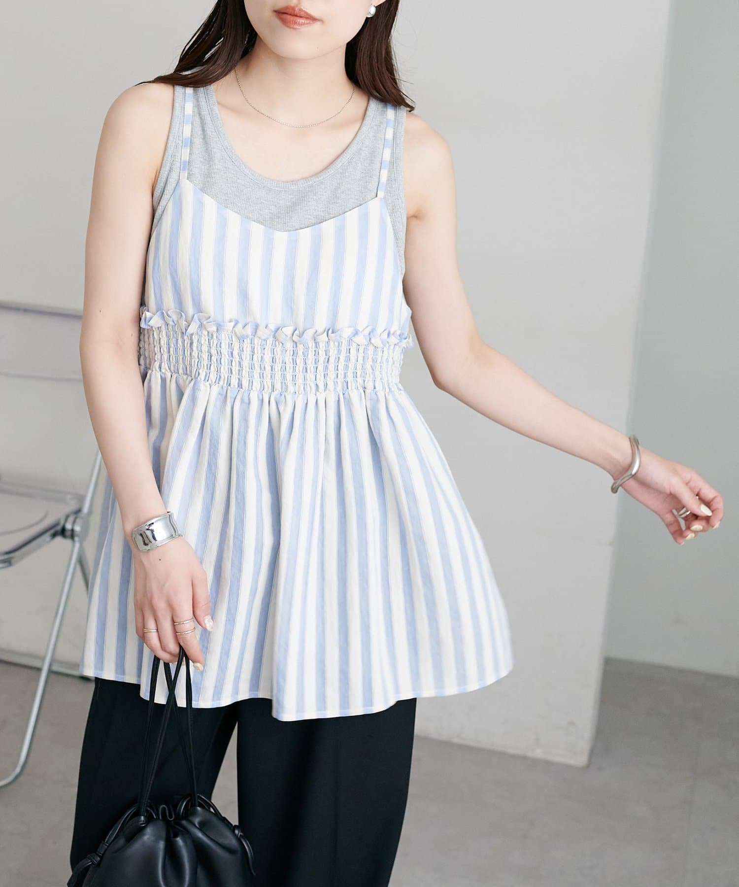 164cmスタッフ:薄手のカットソーを中に着てもごわつかないサイズ感で、レイヤードスタイルが楽しめます。肩紐の華奢さが、上半身をすっきりと見せてくれます♪
