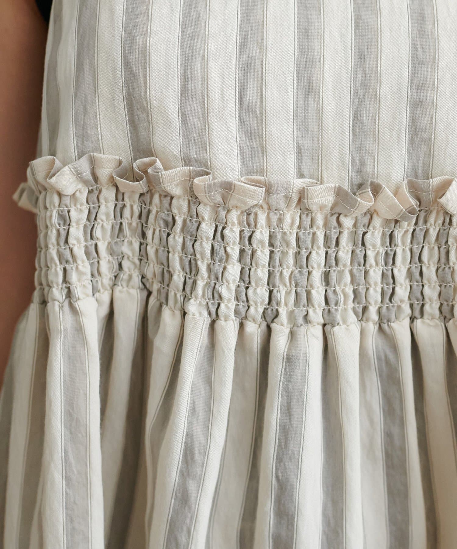 ・胸下にあしらわれた幅広のシャーリングデザインが着こなしのアクセント