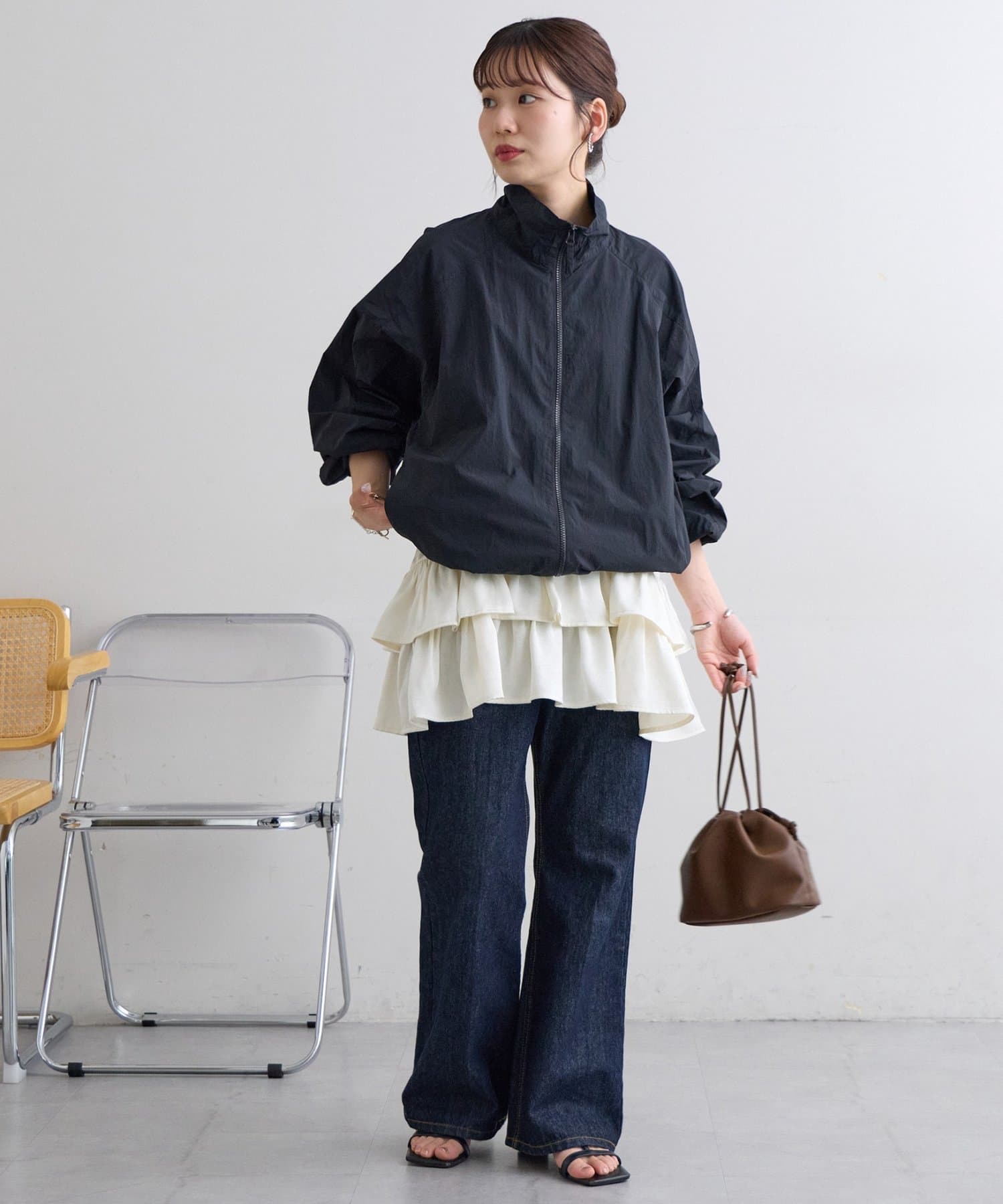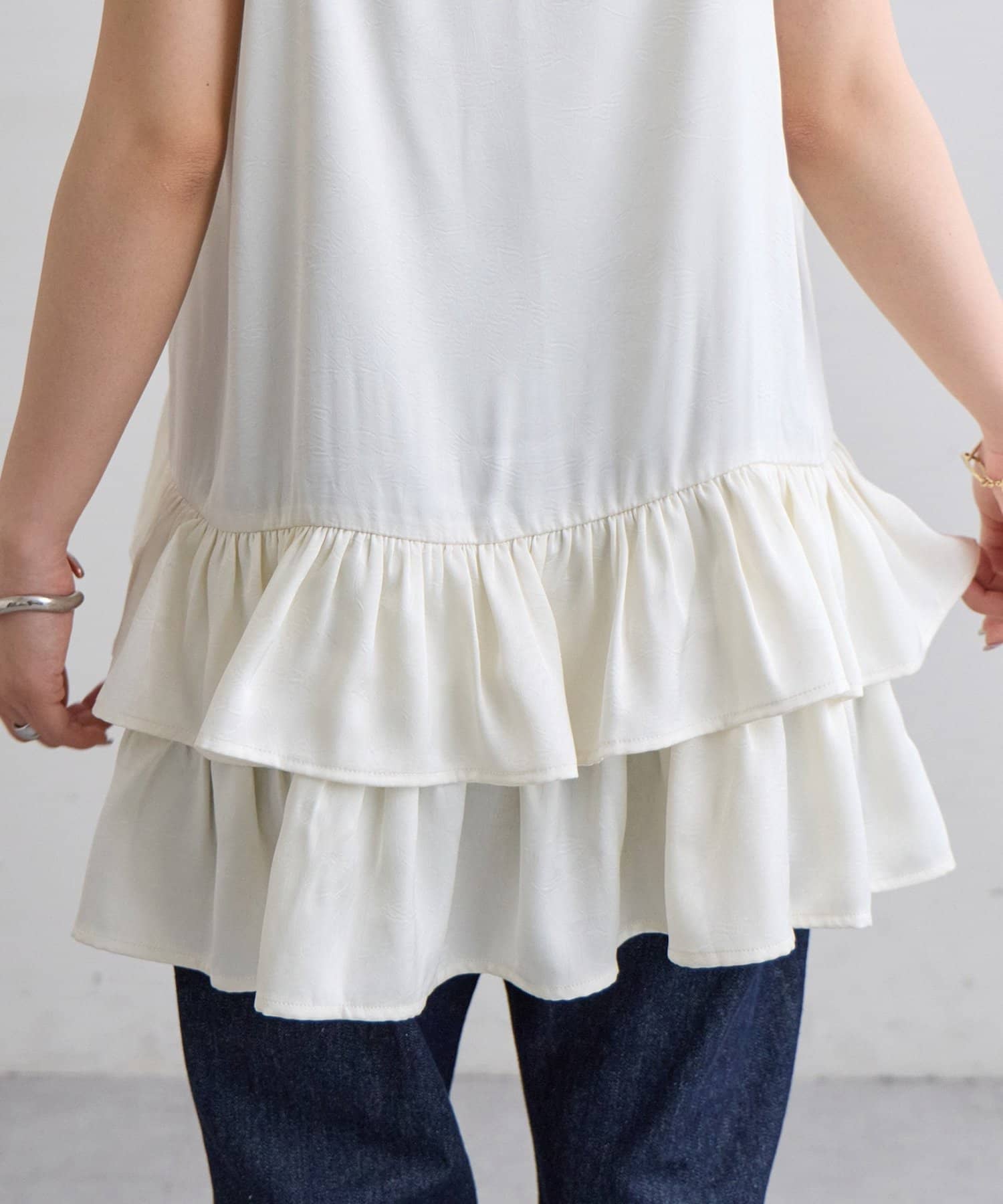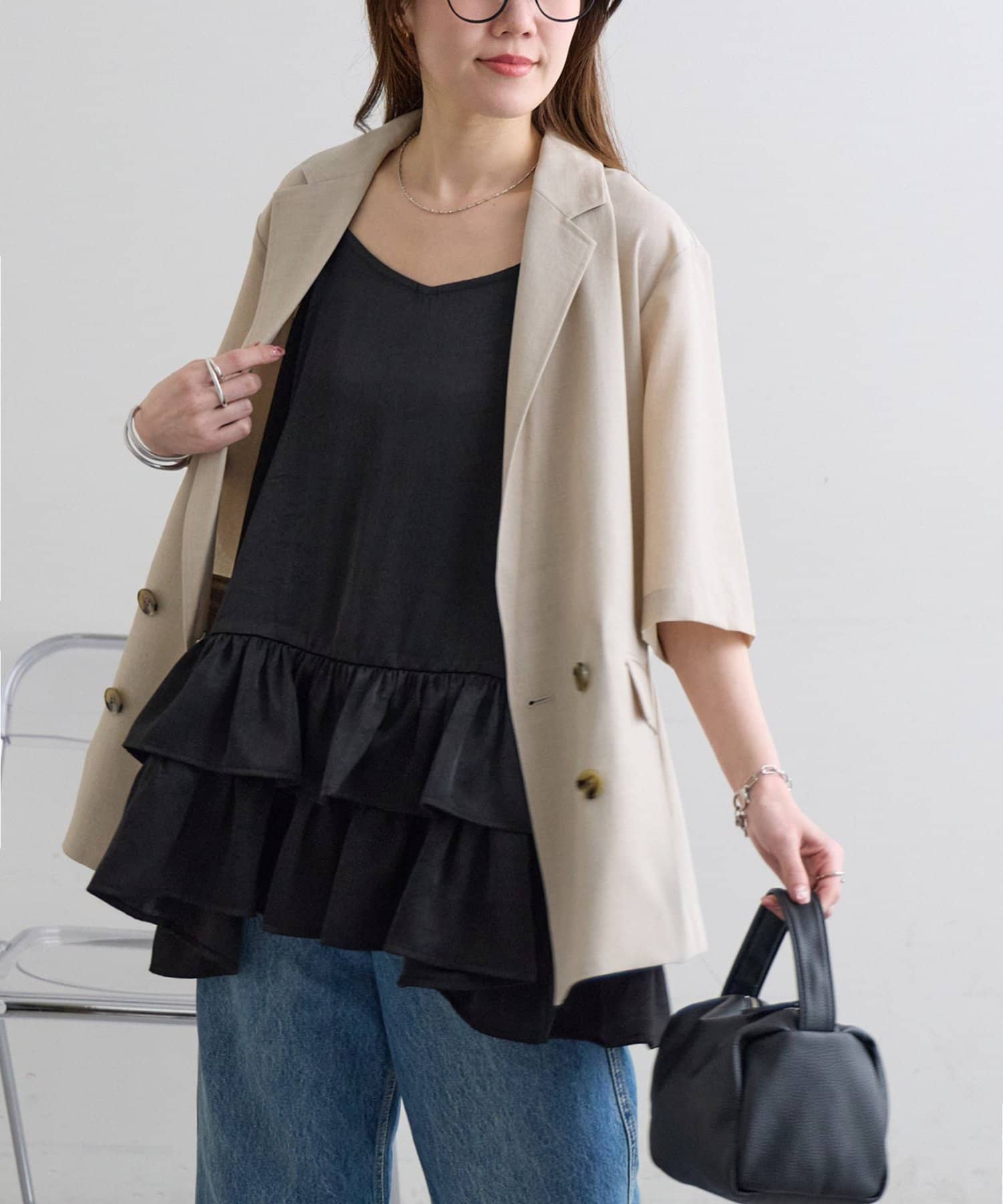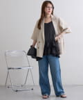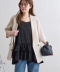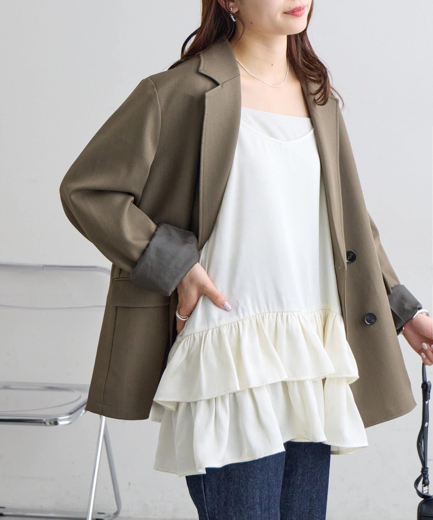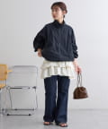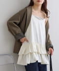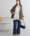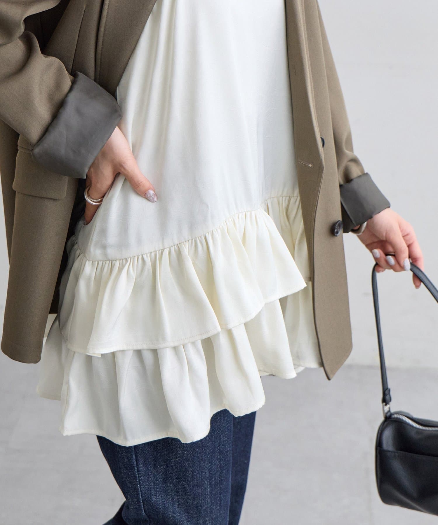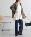 160cmスタッフ:着丈はヒップがしっかり隠れる長さで、安心感がありました。身幅もゆったりしているので、体のラインを全く拾わず、リラックスして着用できます。甘めのデザインですが、ジャケットを羽織ってフリルをちら見せすると、大人っぽく洗練された印象になりました。