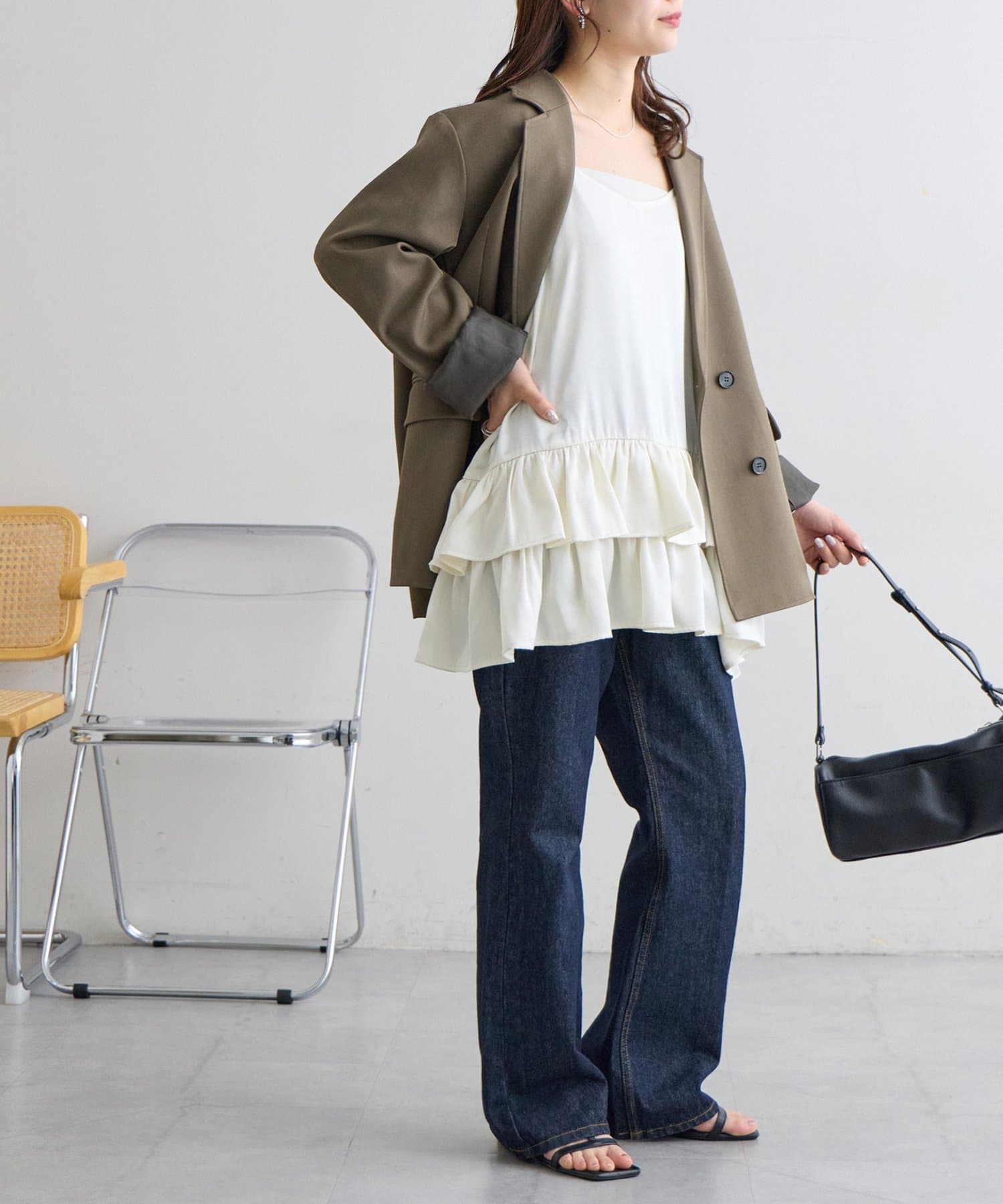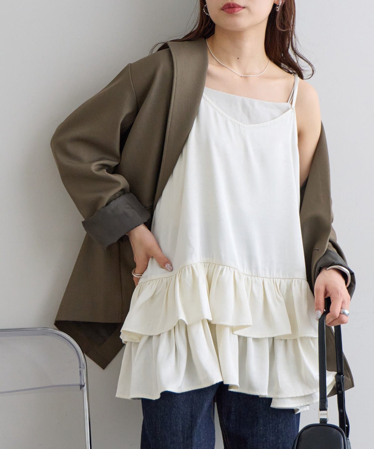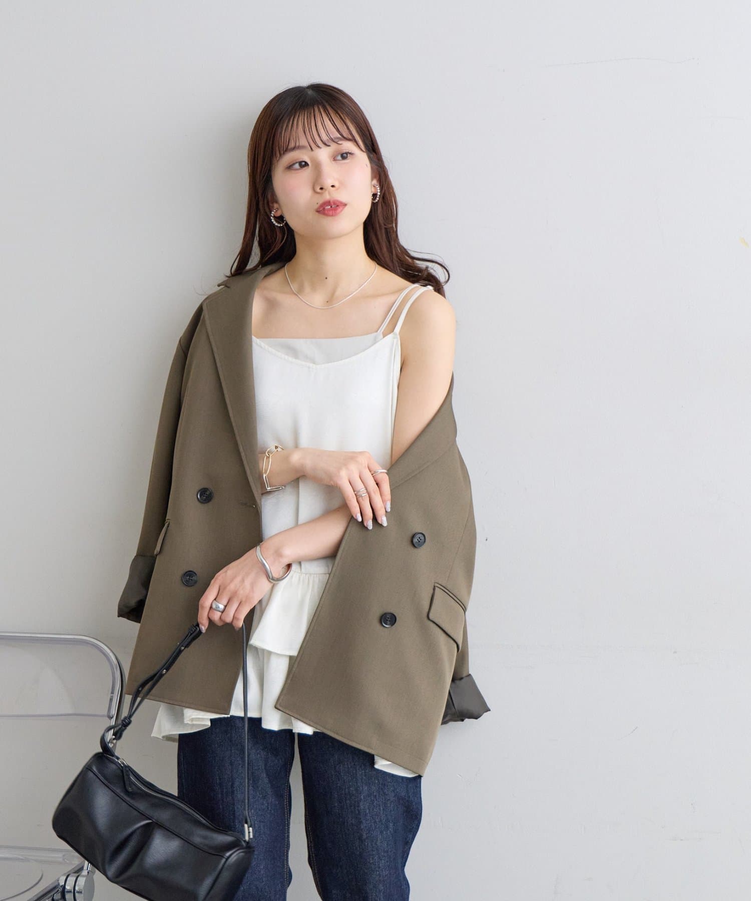 ・テーラードジャケットを肩掛けすれば、甘辛ミックスのこなれたスタイリングに