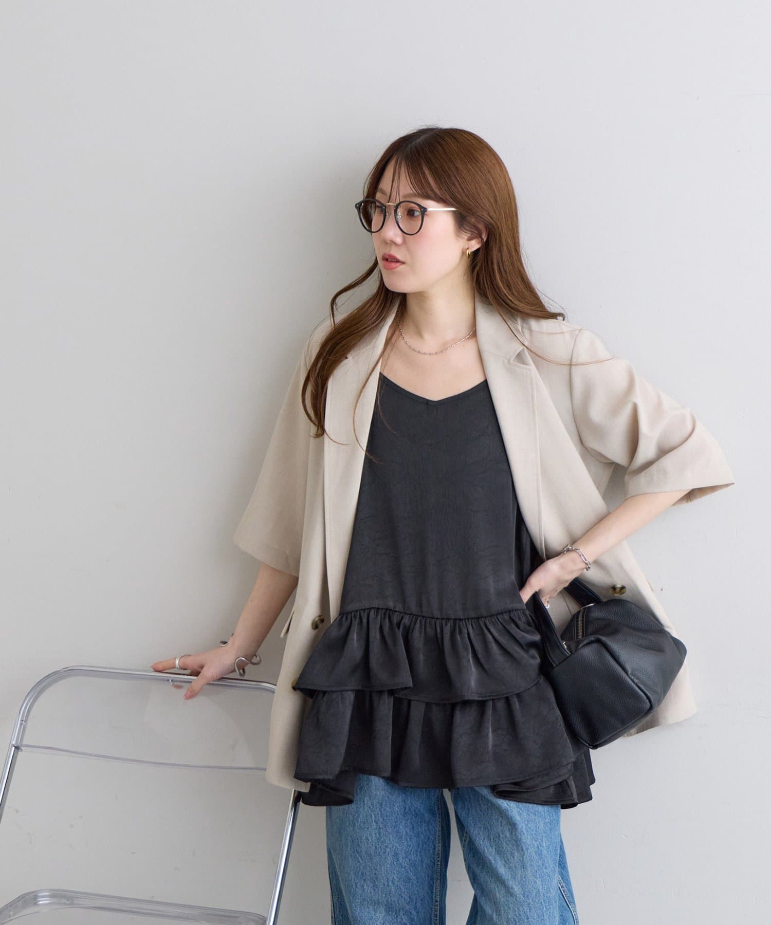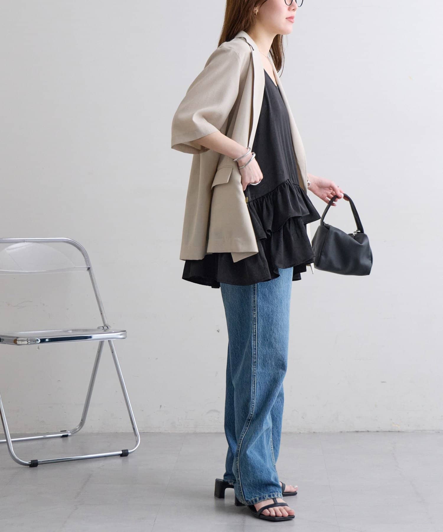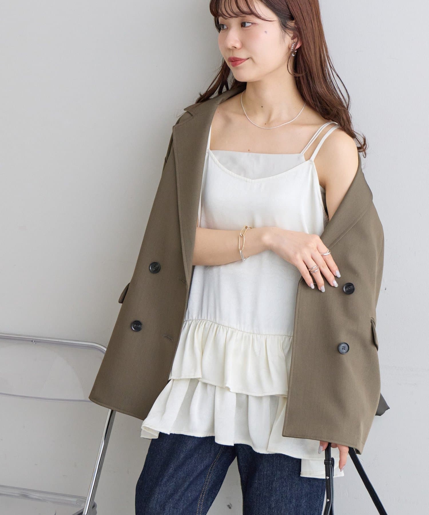 ・テーラードジャケットを肩掛けすれば、甘辛ミックスのこなれたスタイリングに