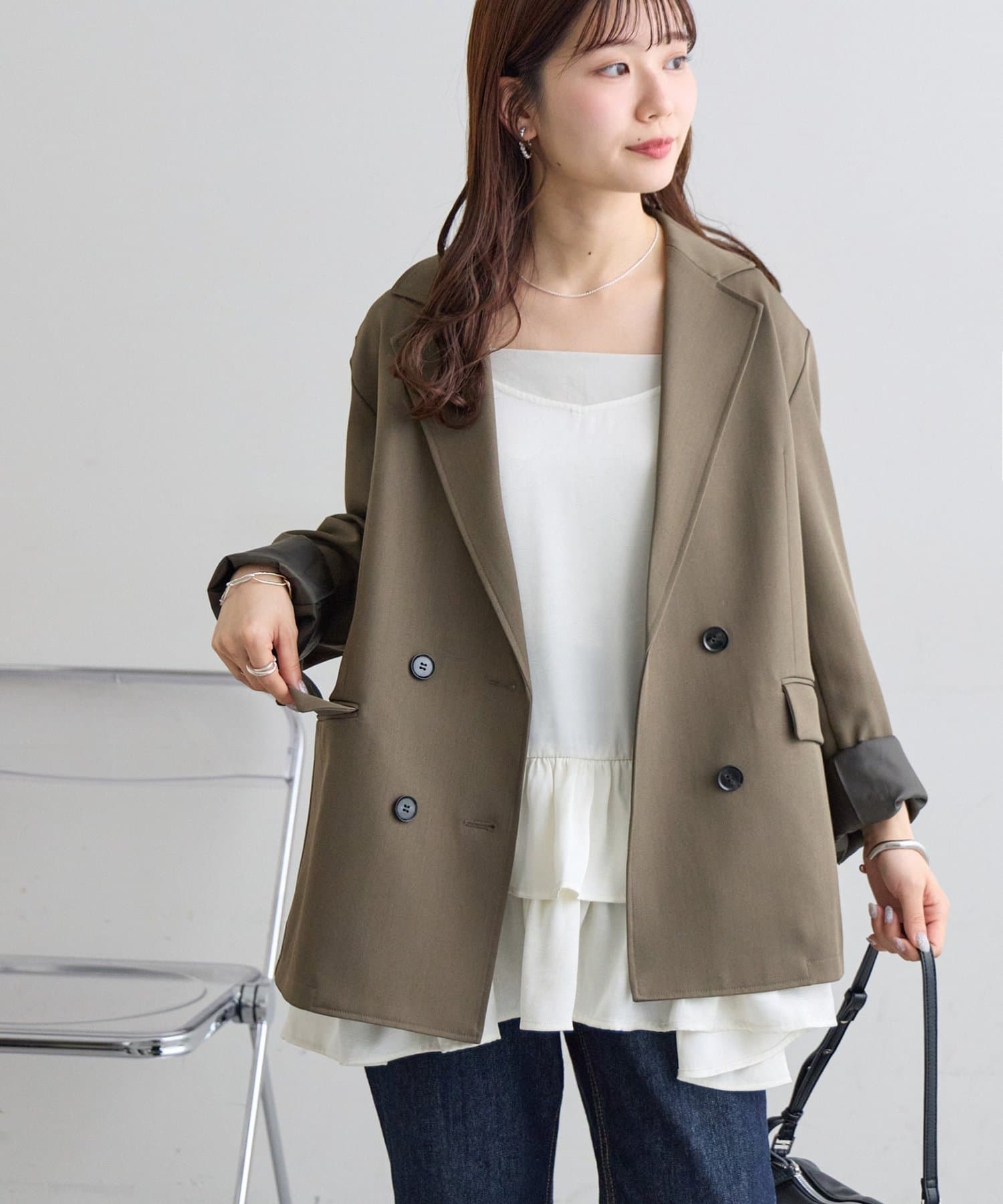 ・インナーにシンプルなTシャツやリブカットソーを重ねるレイヤードスタイルは、カジュアルダウンしたい時にぴったり!