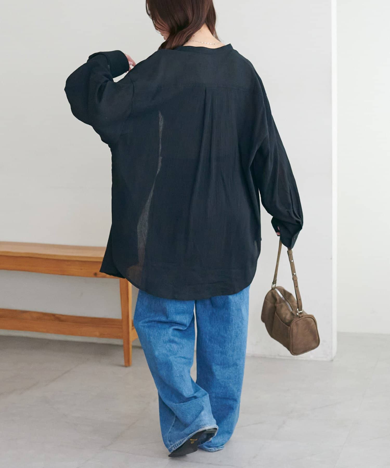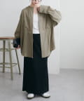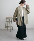 149cmスタッフ着用:お尻がすっぽり隠れる丈感で、羽織りとしても万能な一枚!袖は少し長めなので、カフスを折り返したり、たくし上げて手首を見せるとバランス良く着こなせました。