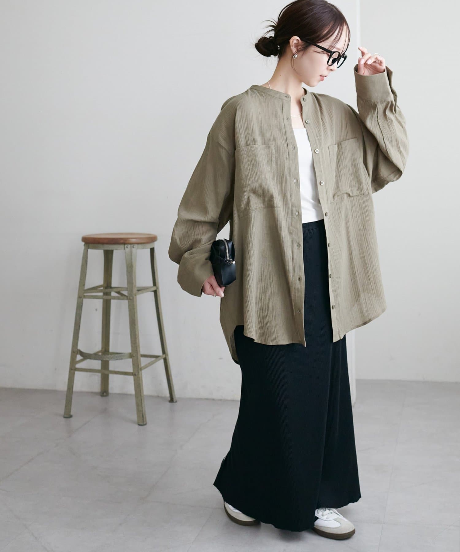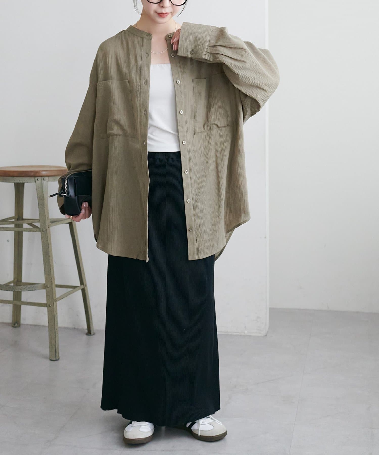 164cmスタッフ着用:肌離れの良いさらりとした素材感で、汗ばむシーズンも快適に着られそう!腰回りが隠れる丈感で、気になる部分を自然にカバーしてくれるのも◎きれいめのIラインスカートと合わせて、縦のラインを強調した大人っぽい着こなしがお気に入りです。
