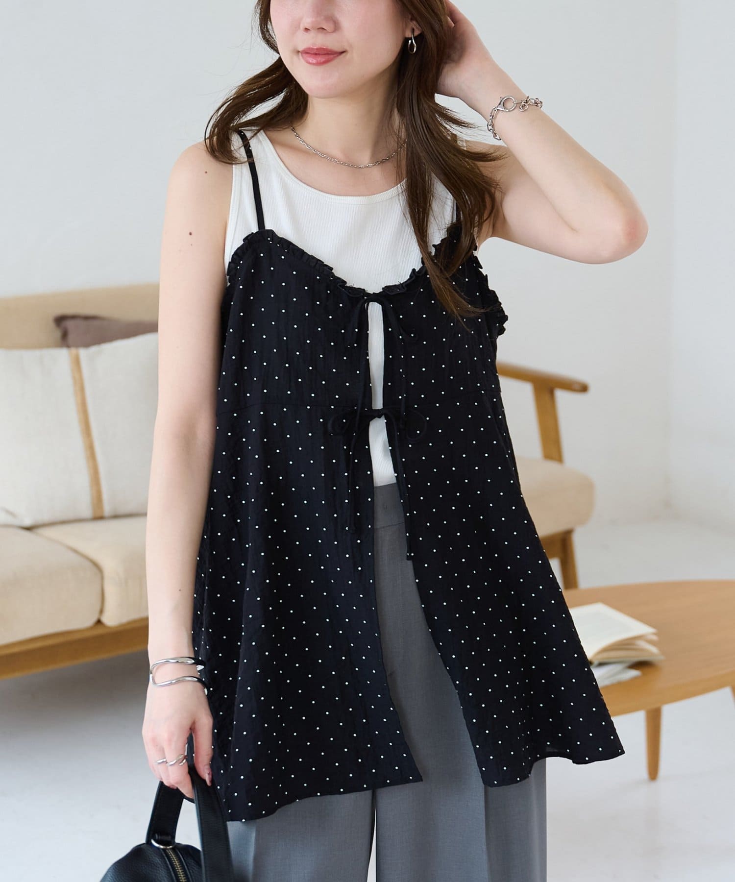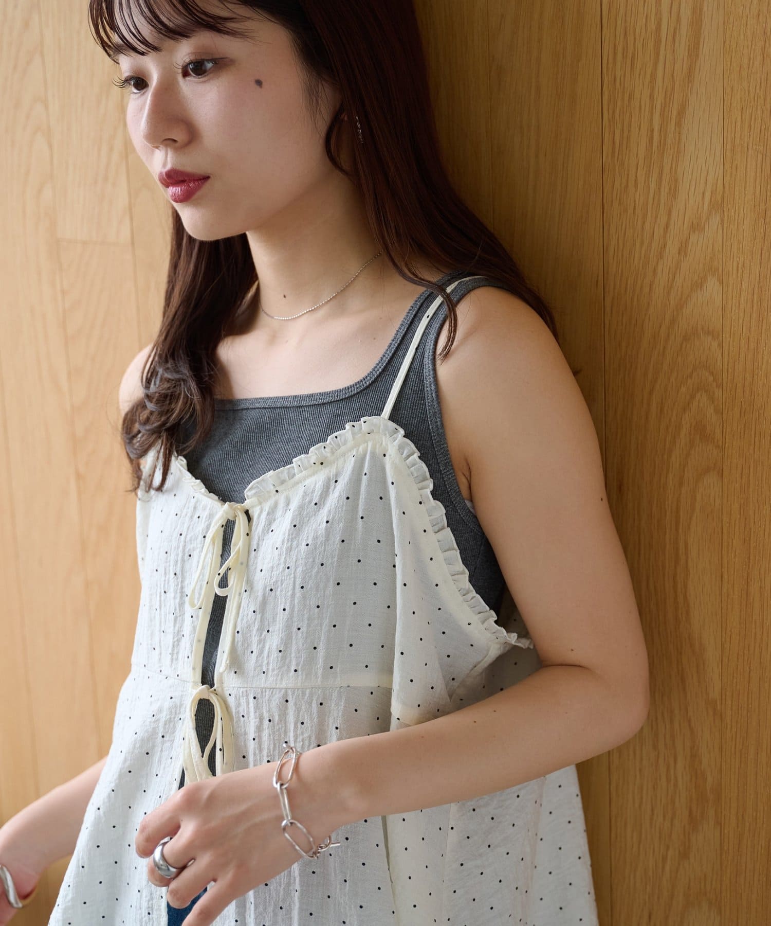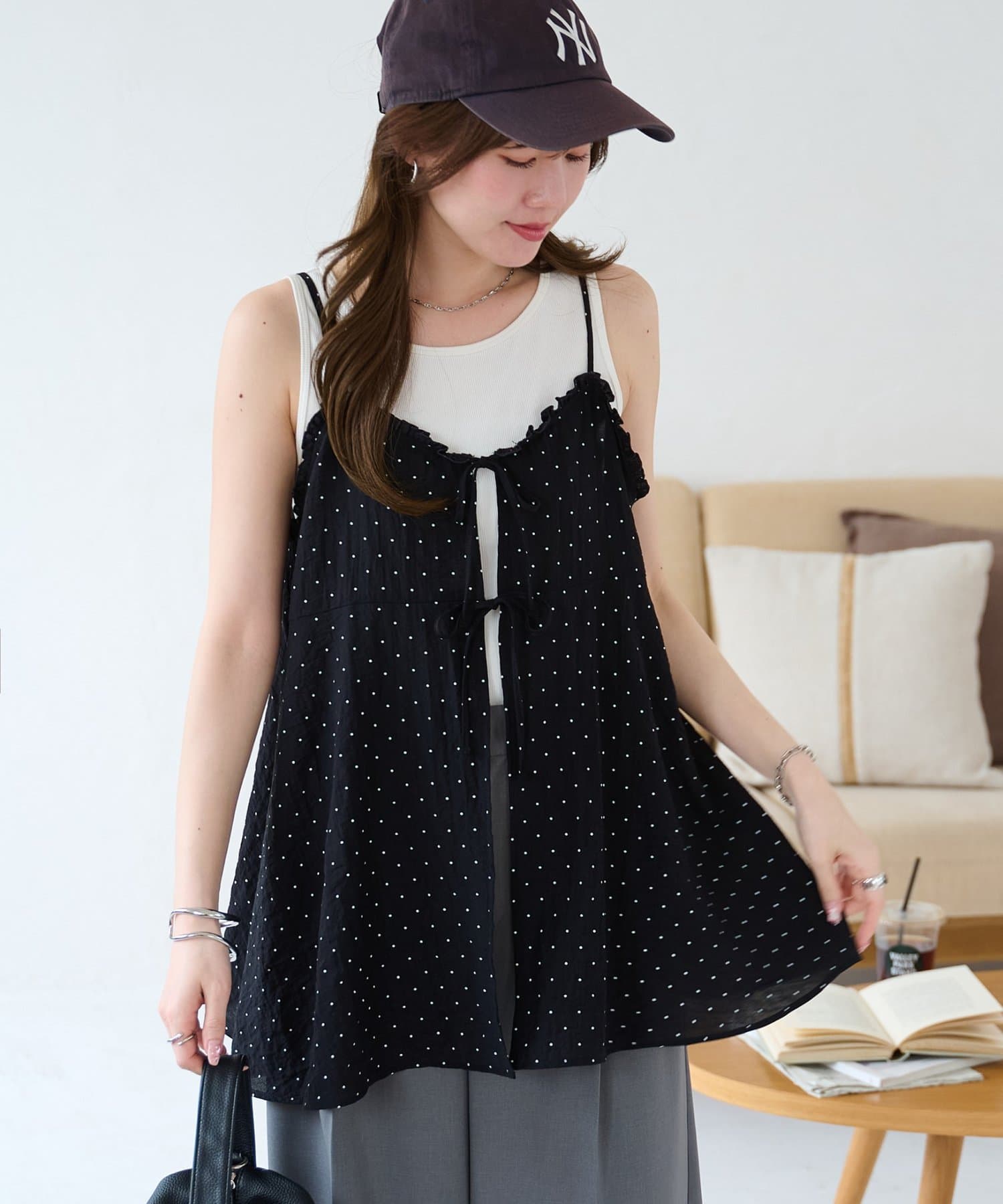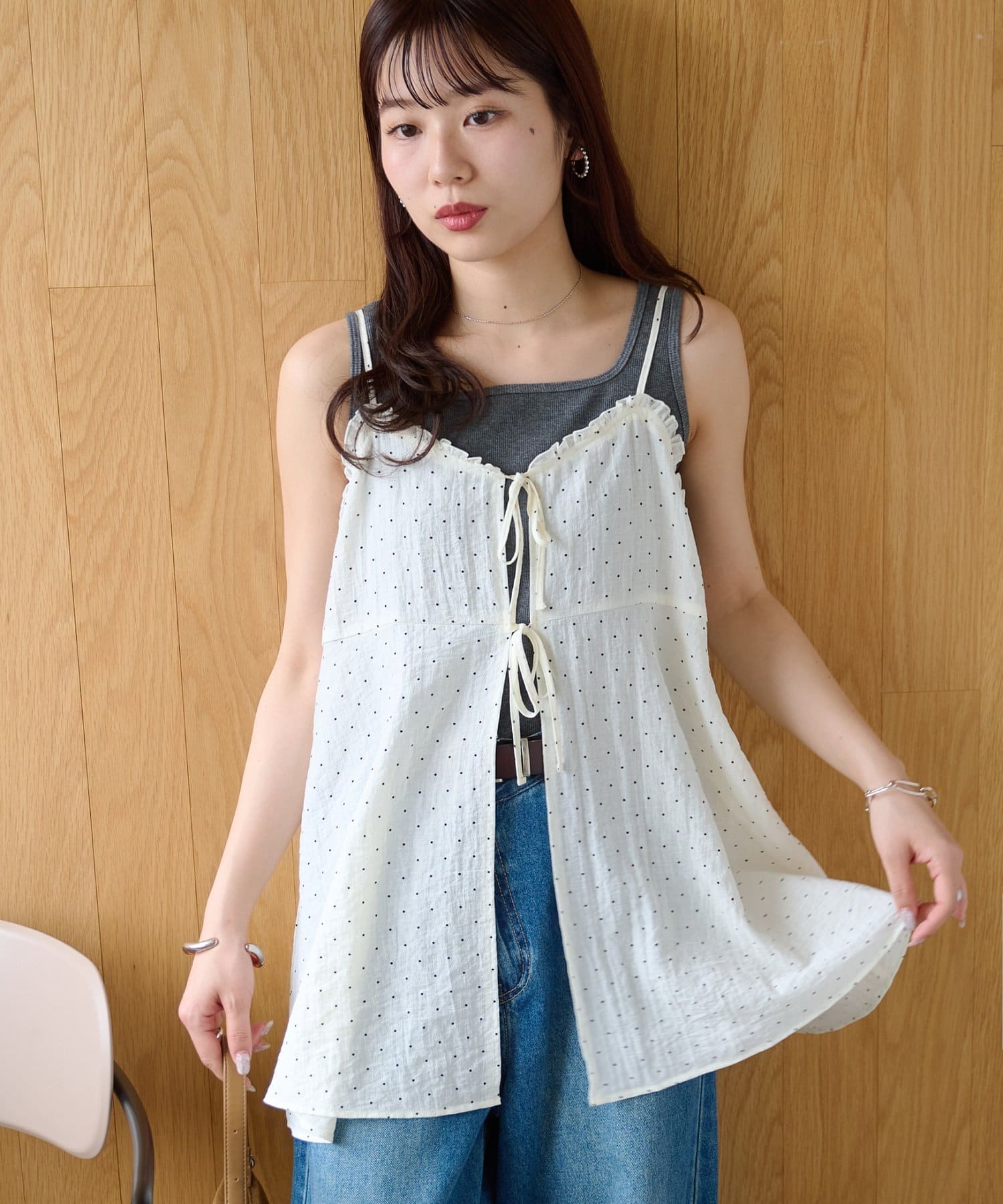 シアーな透け感とドット柄が大人可愛い!レイヤードスタイルに活躍するキャミソール