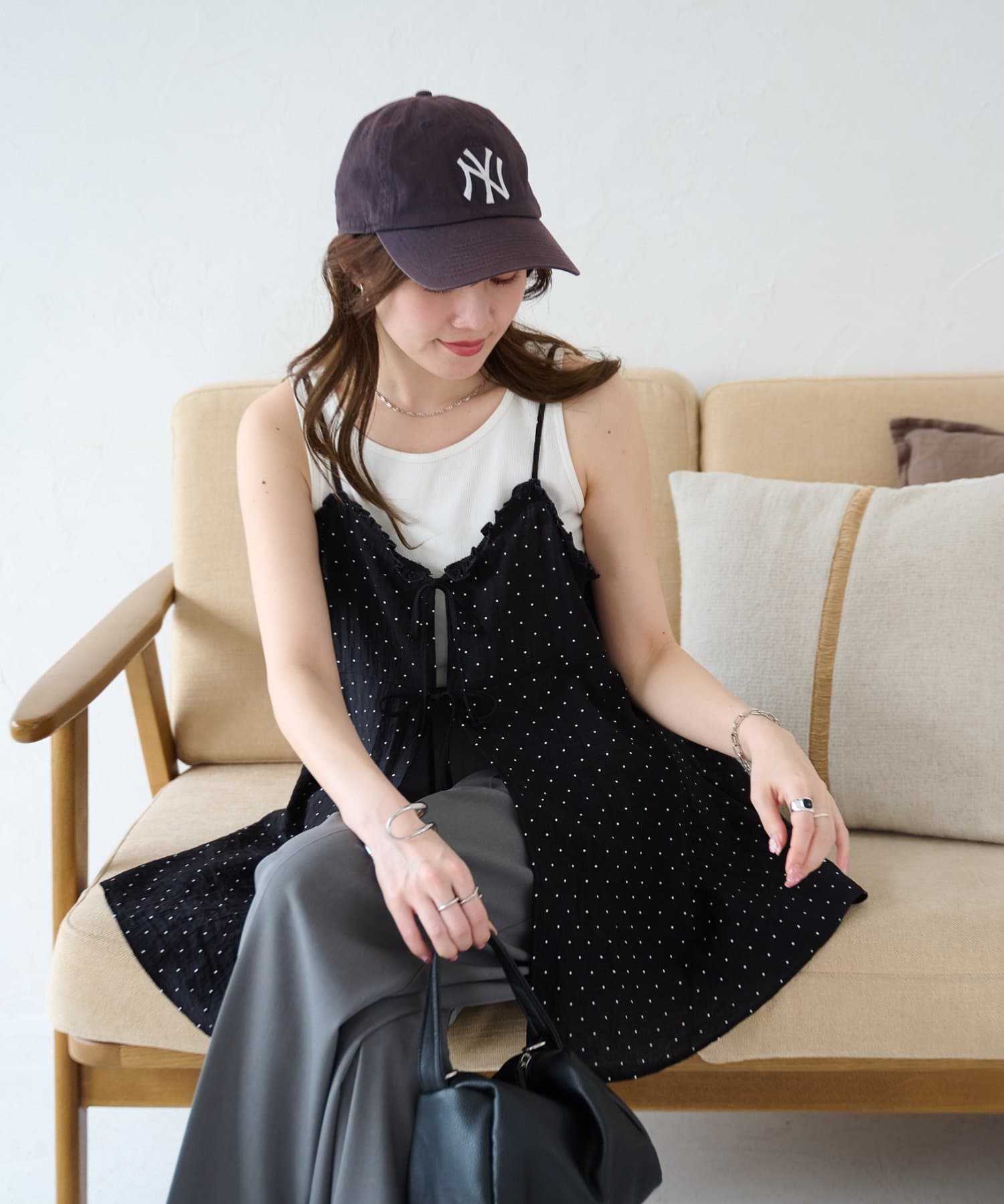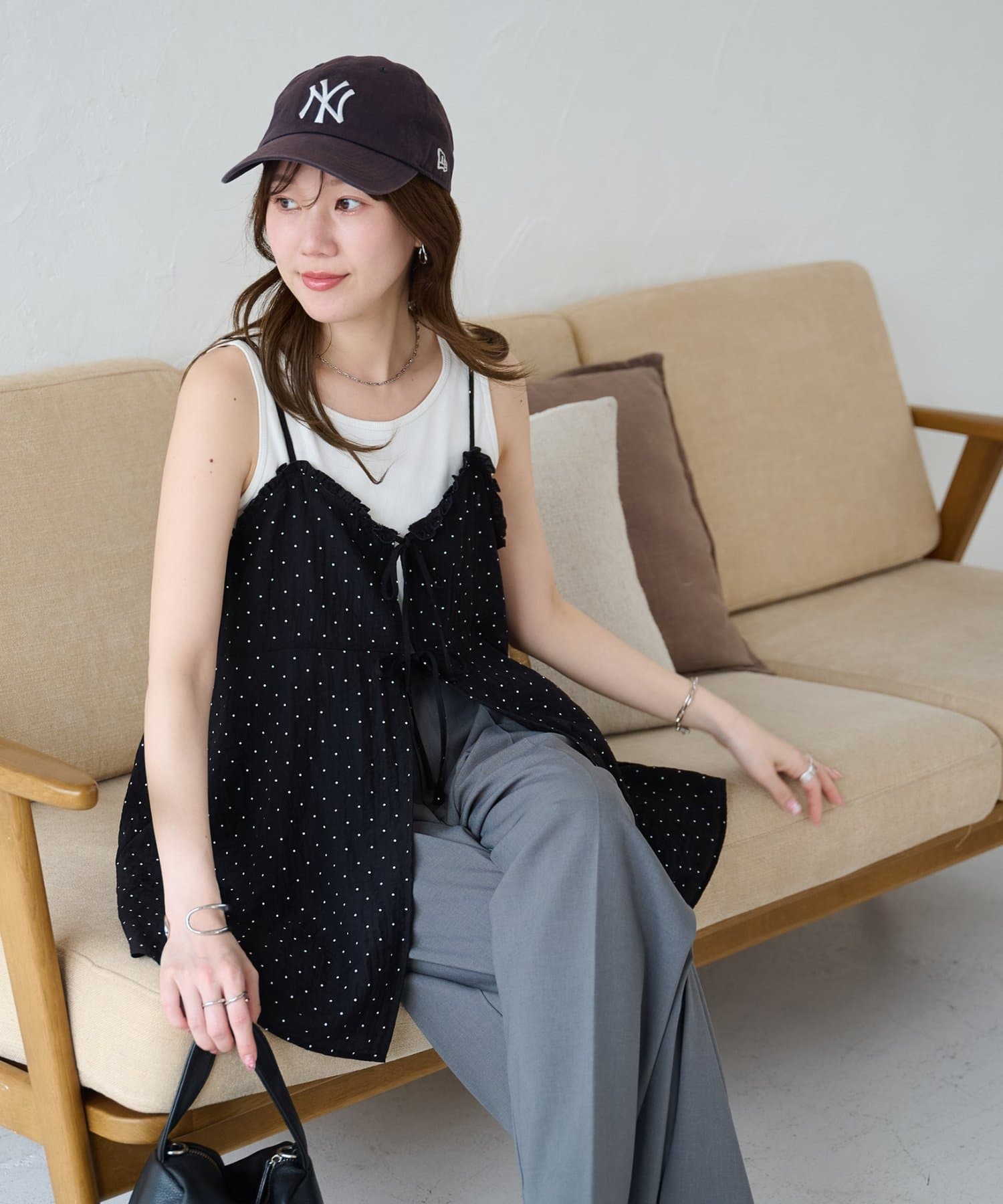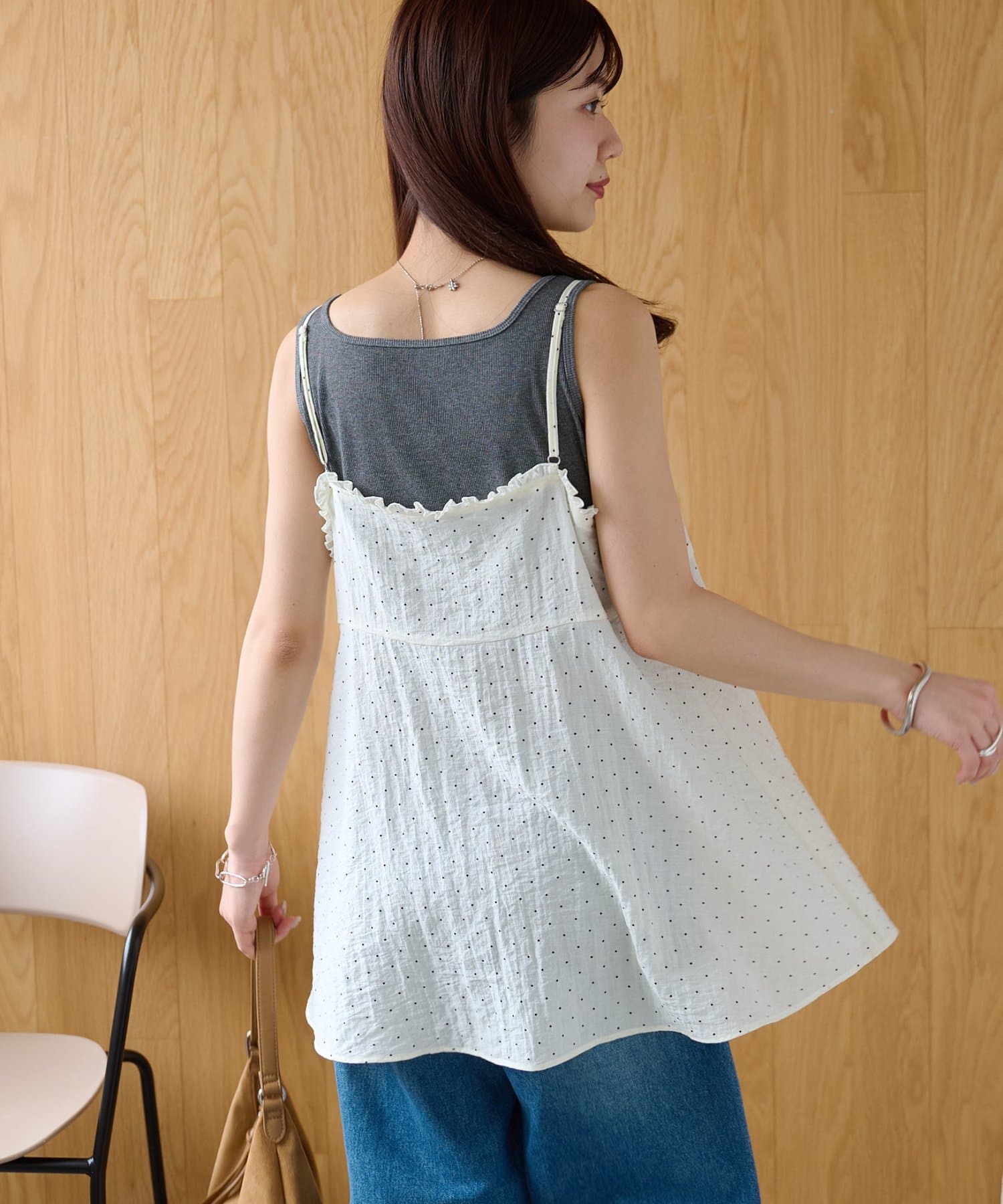 シアーな透け感とドット柄が大人可愛い!レイヤードスタイルに活躍するキャミソール