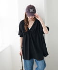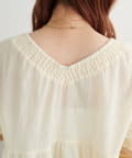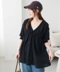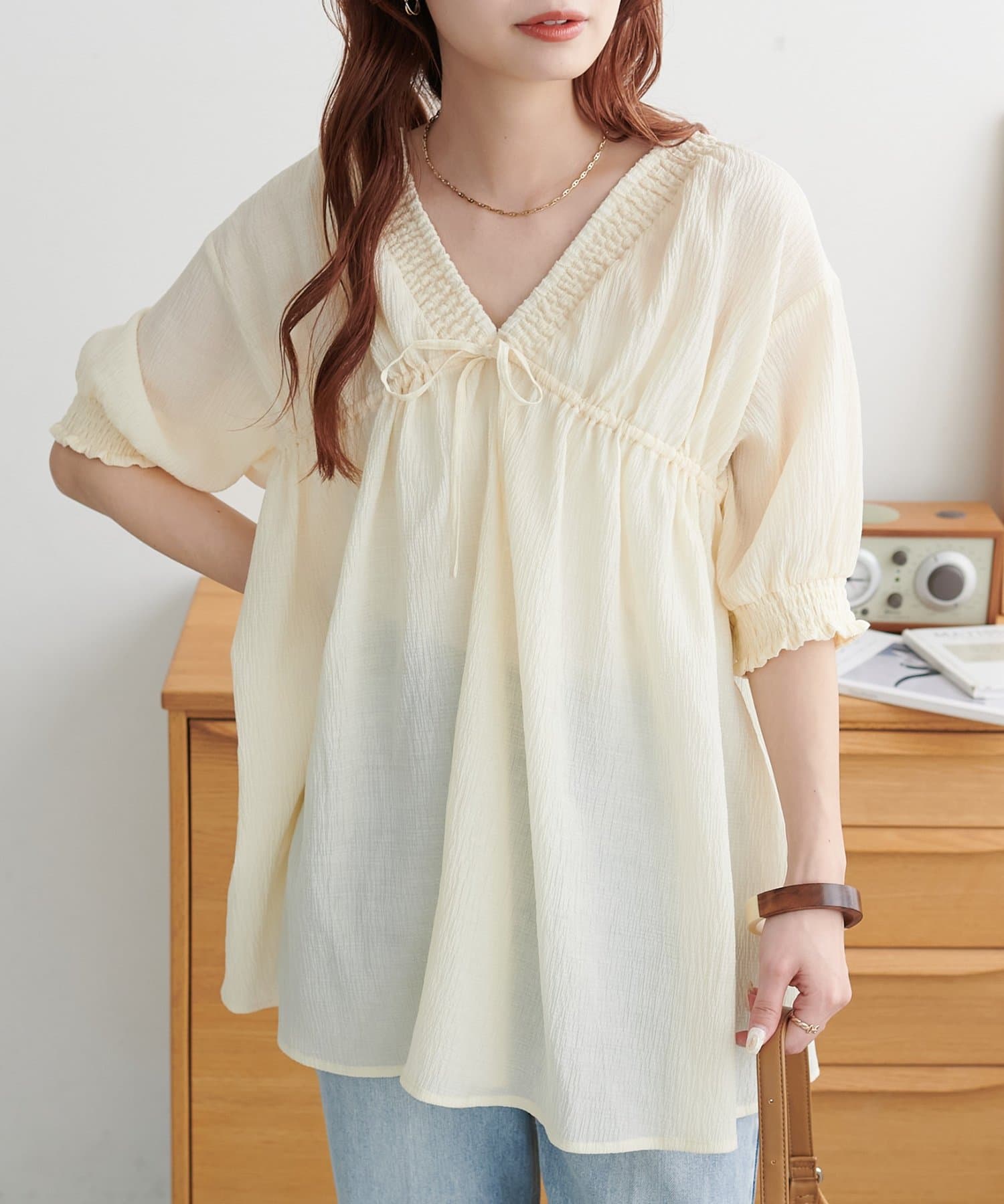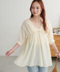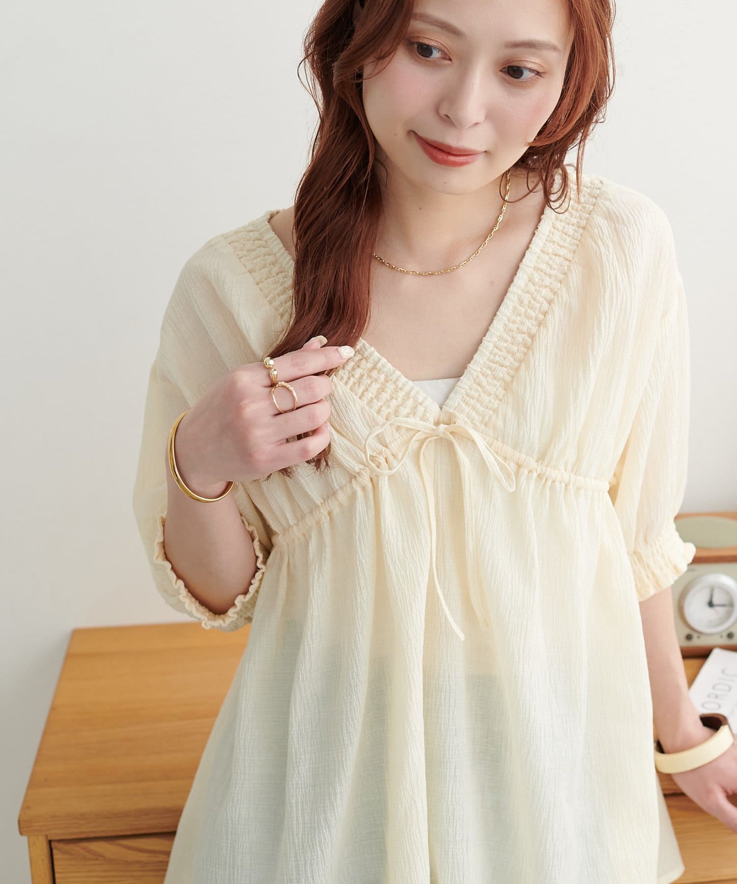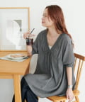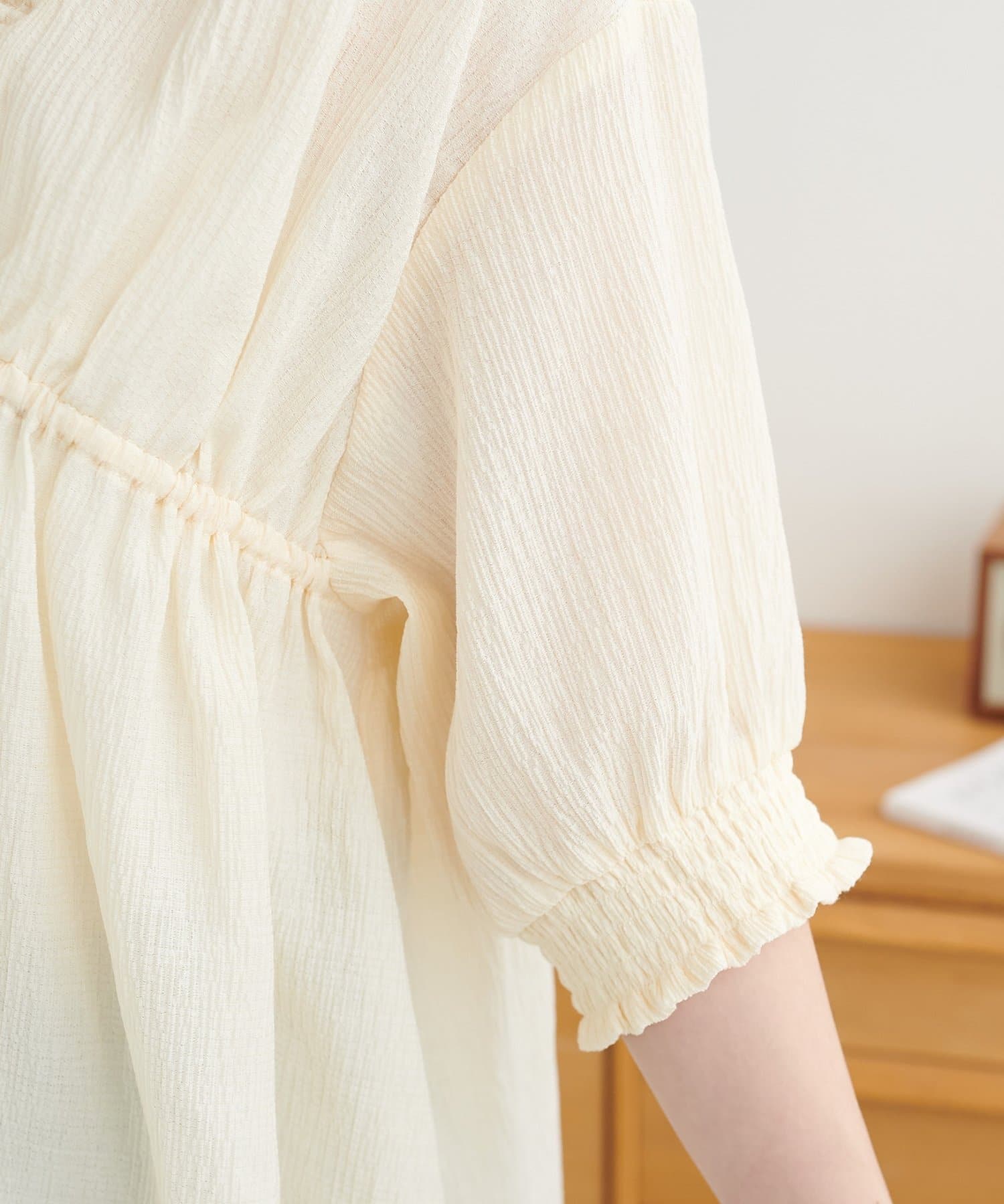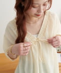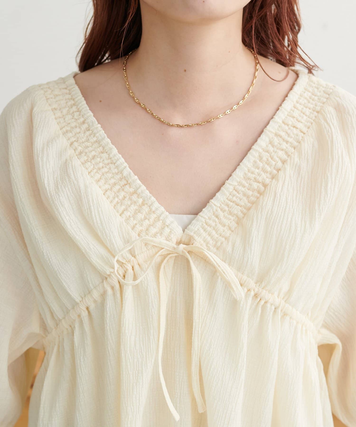 ・首元と袖口のシャーリング、フロントで結ぶリボンがさりげない甘さを演出♡