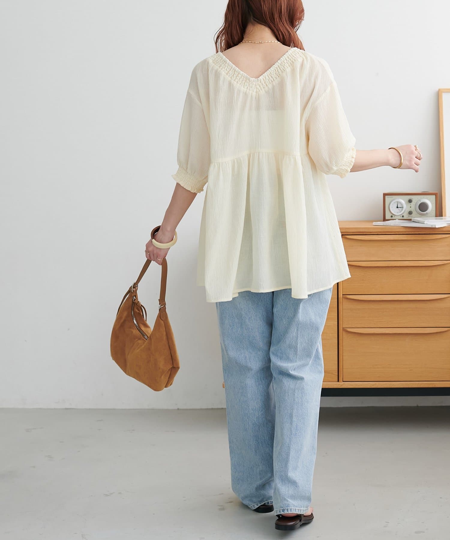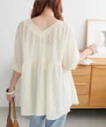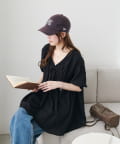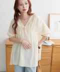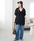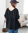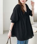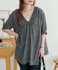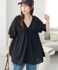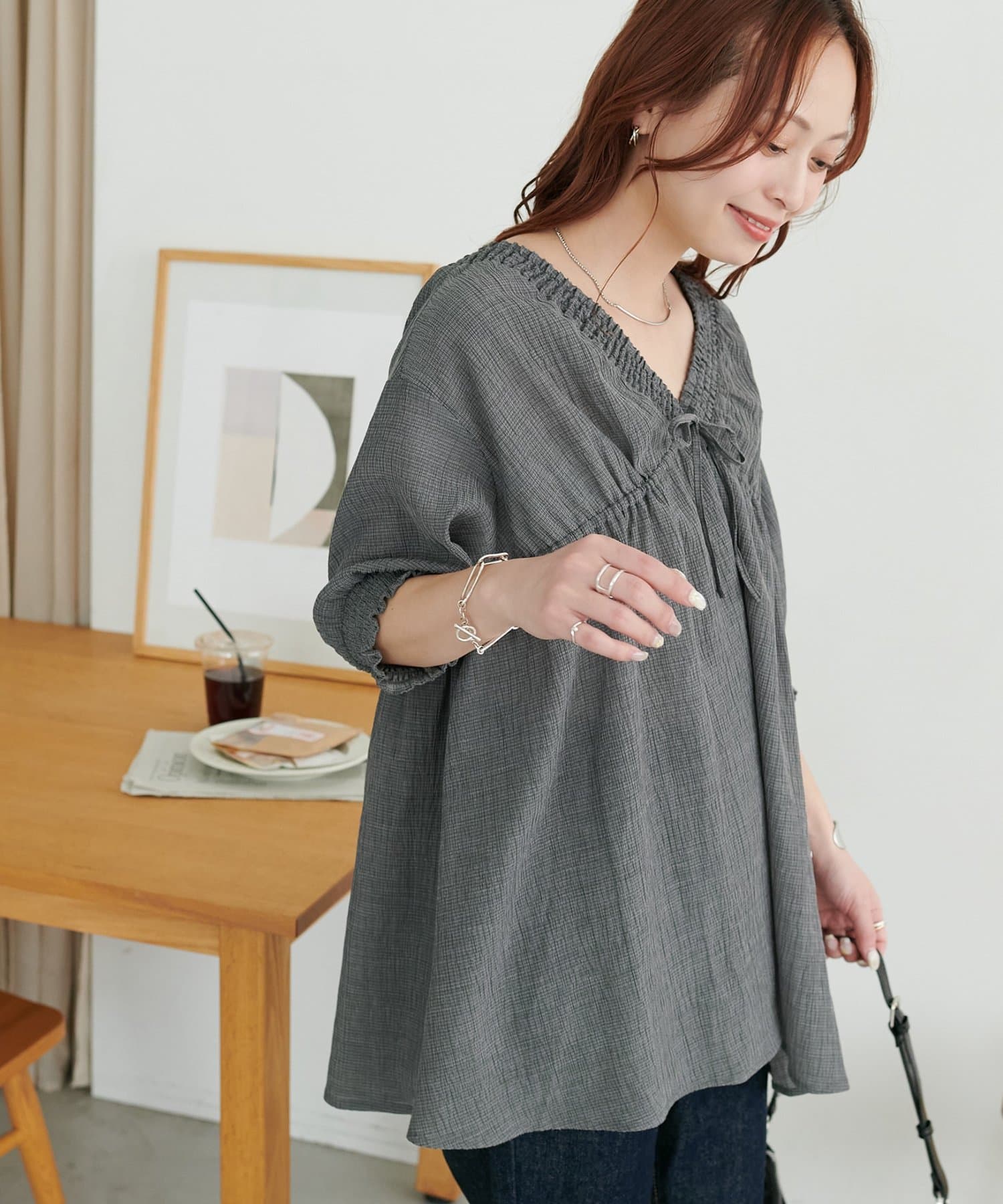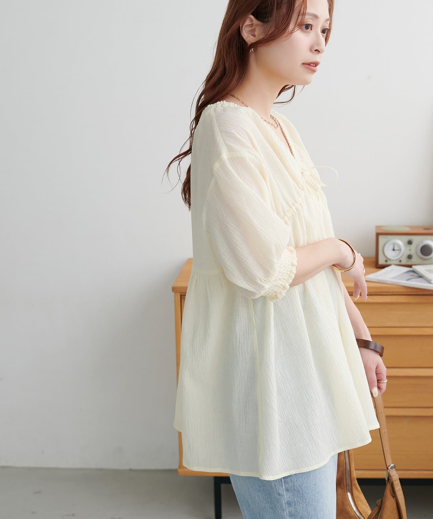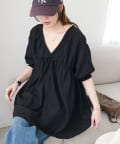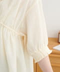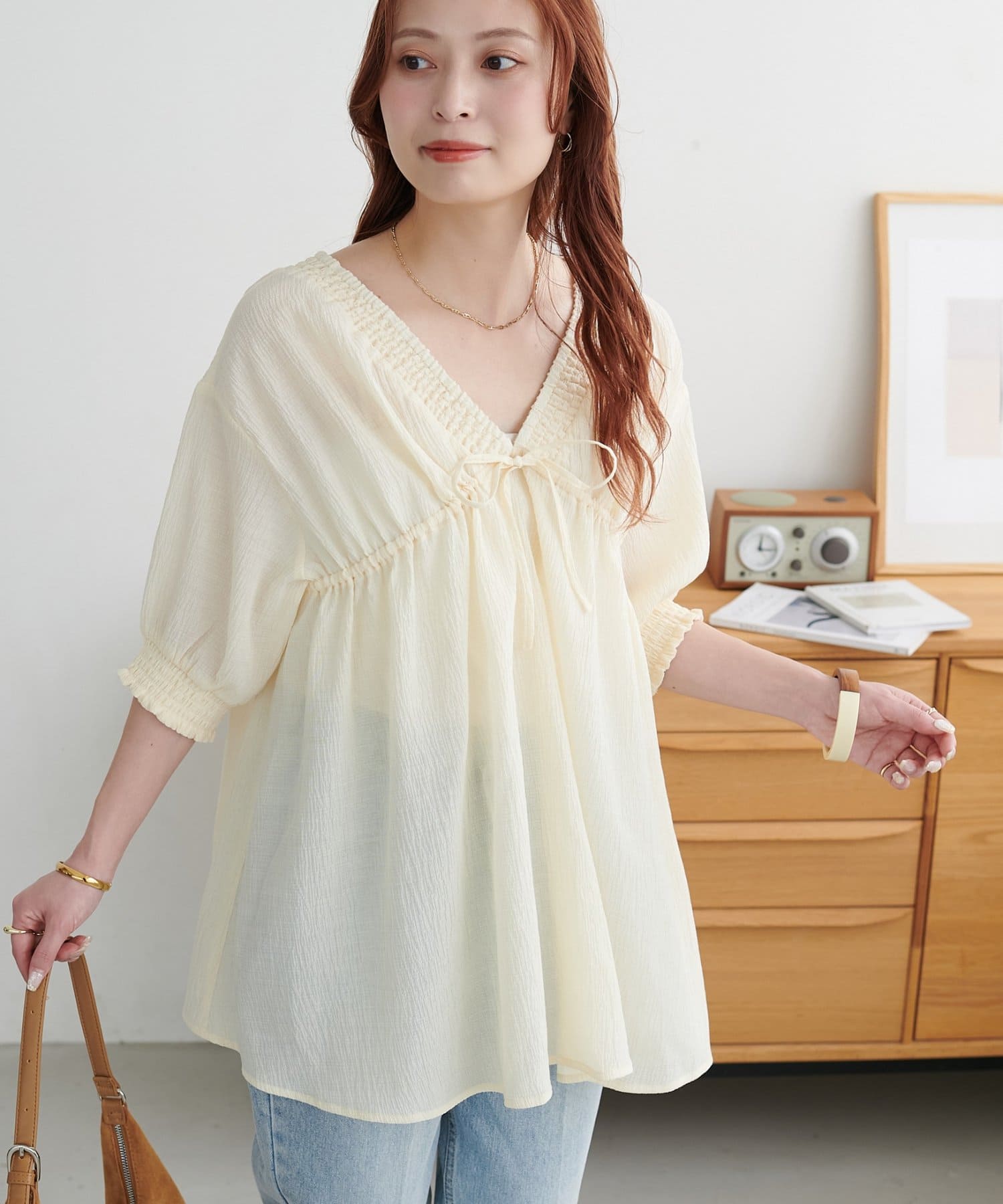 ・首元と袖口のシャーリング、フロントで結ぶリボンがさりげない甘さを演出♡