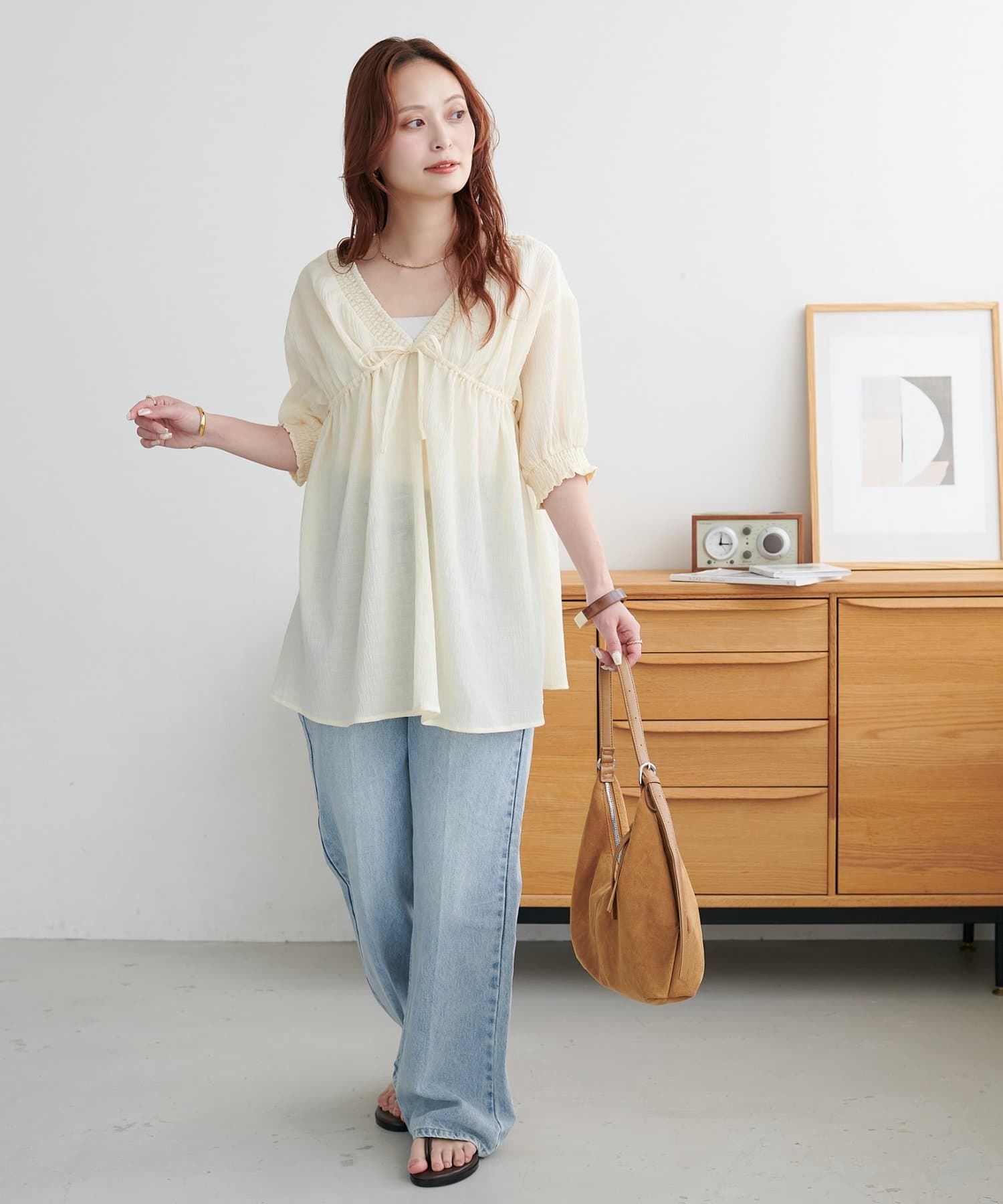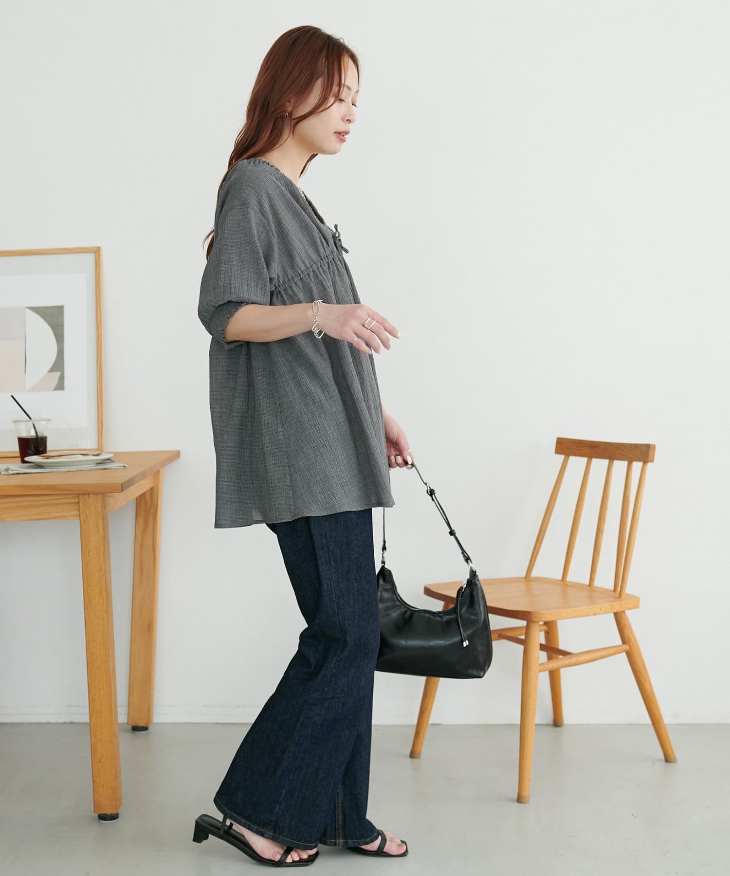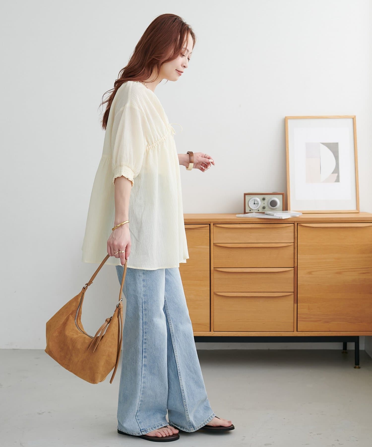 ・ワイドデニムにサンダルを合わせて、休日のリラックスした大人カジュアルコーデに。
