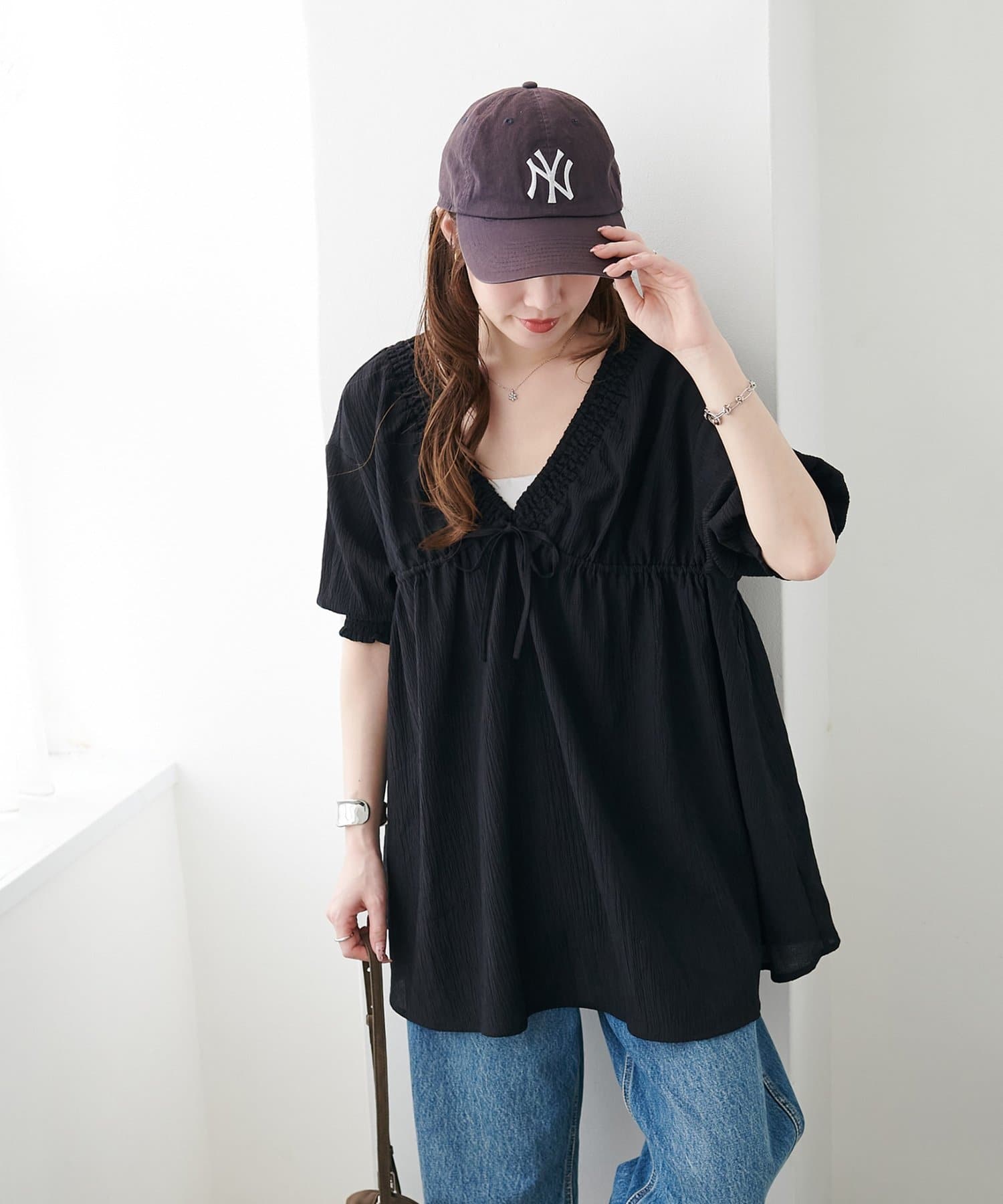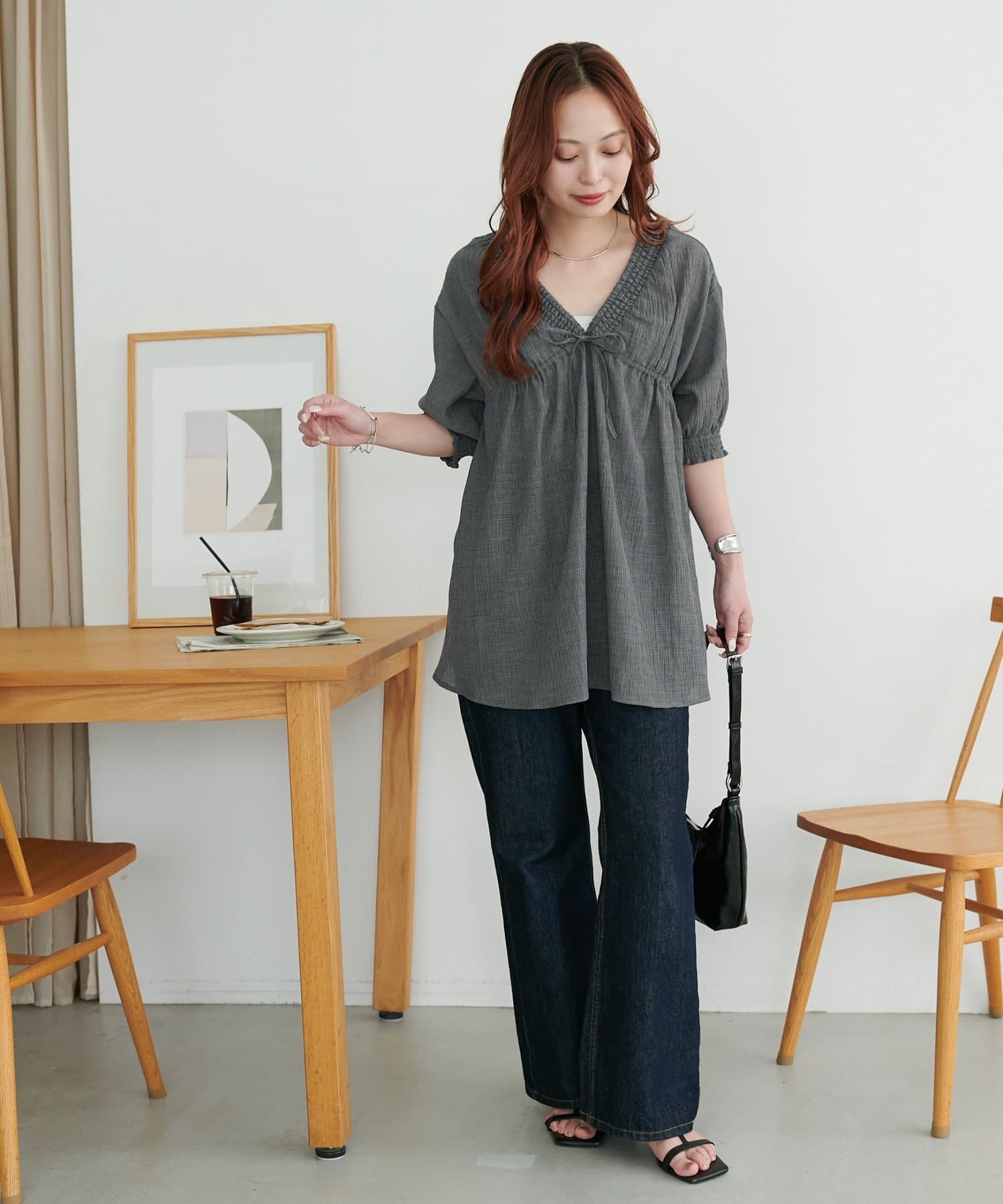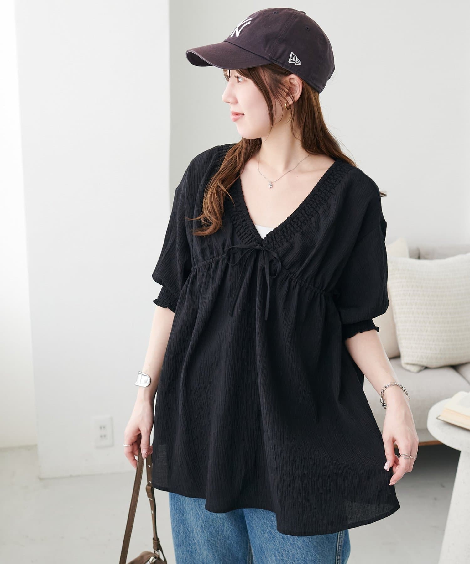 Vネックのおかげで甘くなりすぎず、大人っぽく着られるのがお気に入りです。細身のパンツと合わせると、すっきり見えてスタイルアップ効果も抜群でした◎