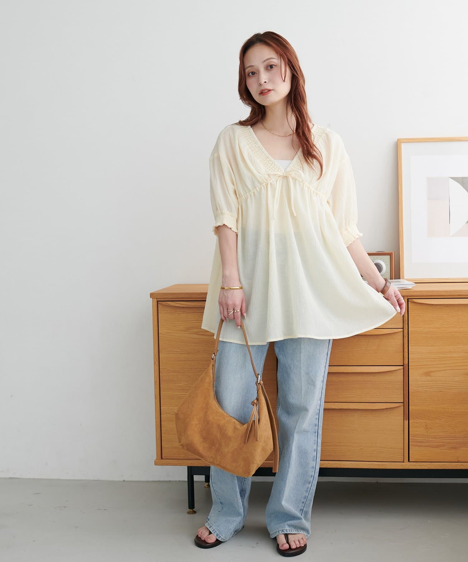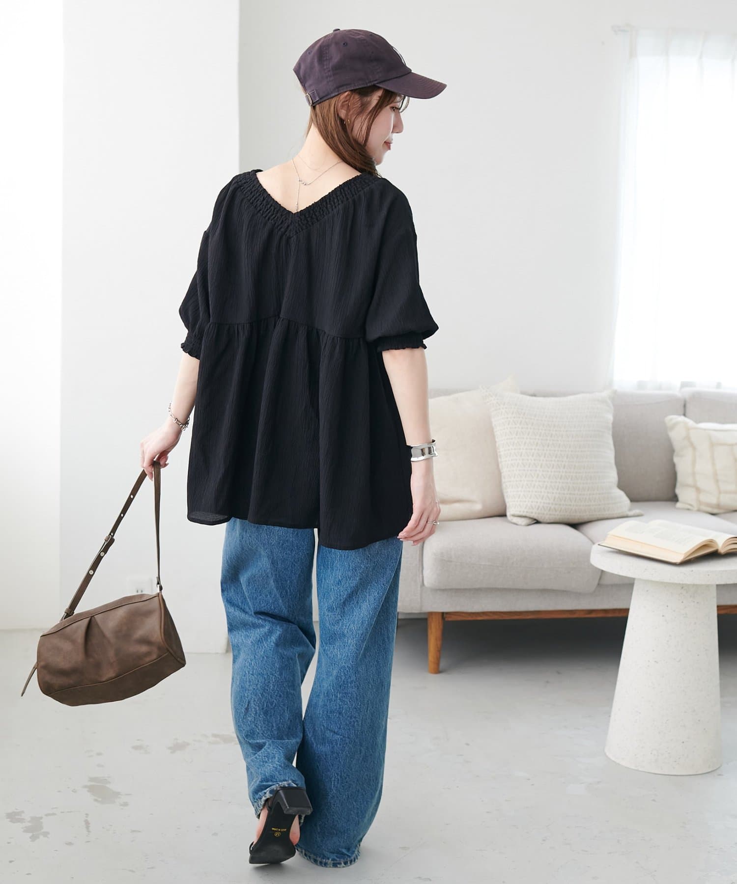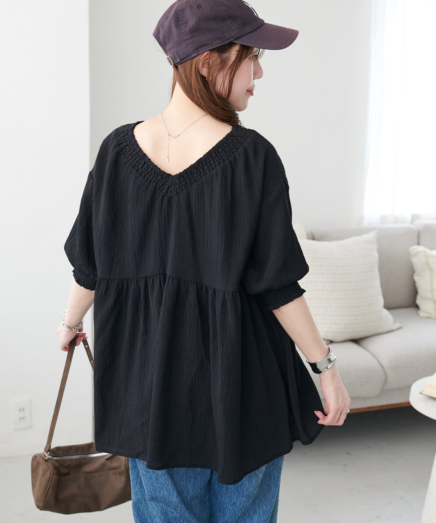 Vネックのおかげで甘くなりすぎず、大人っぽく着られるのがお気に入りです。細身のパンツと合わせると、すっきり見えてスタイルアップ効果も抜群でした◎