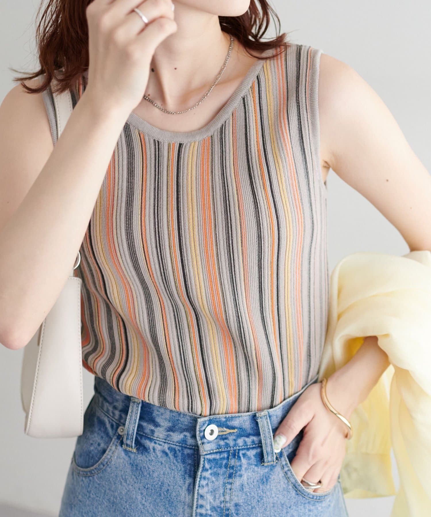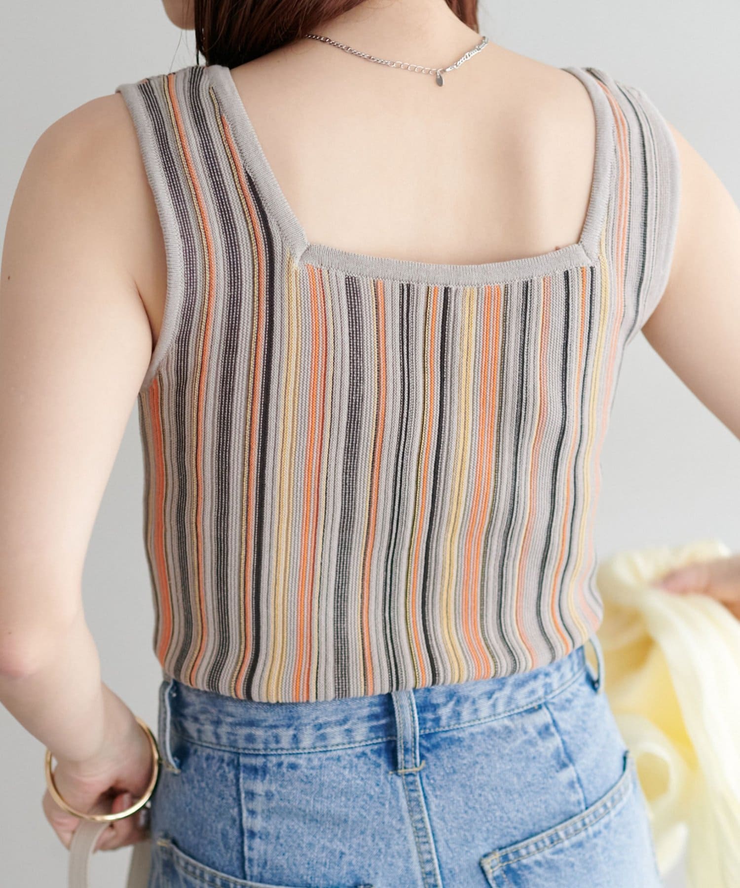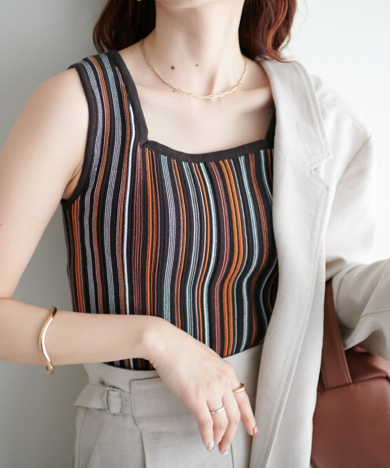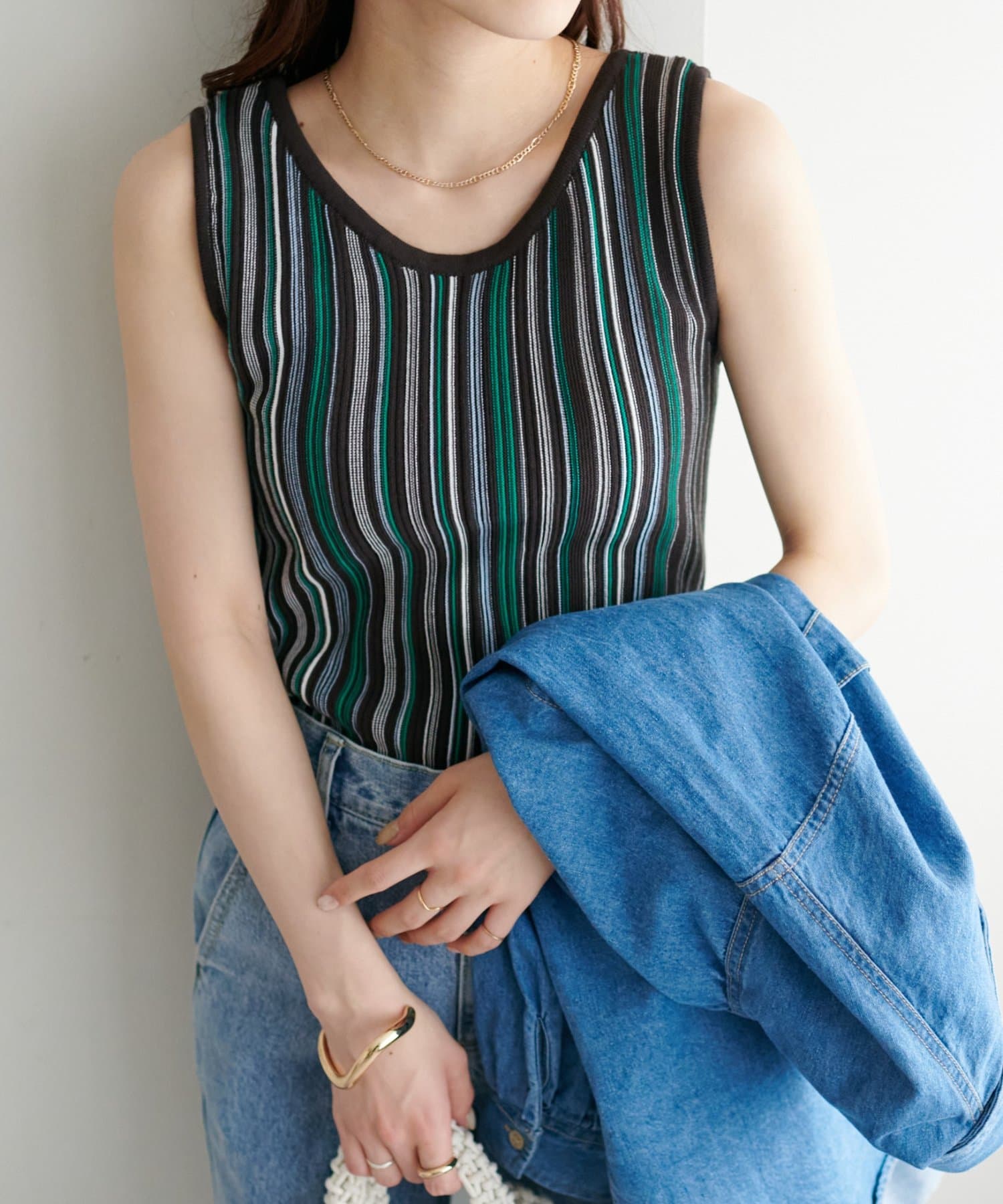 ・コーディネートにアクセントを添える、マルチストライプ柄のタンクトップ
