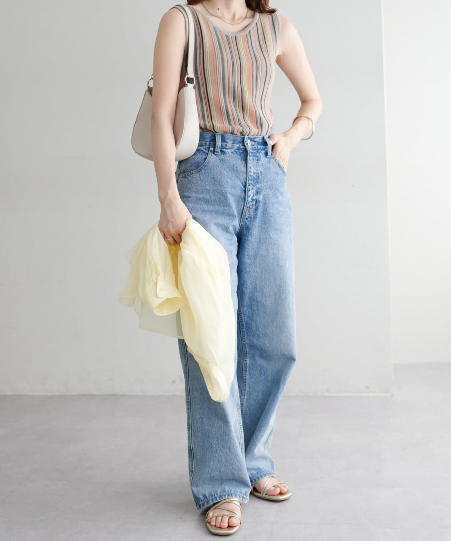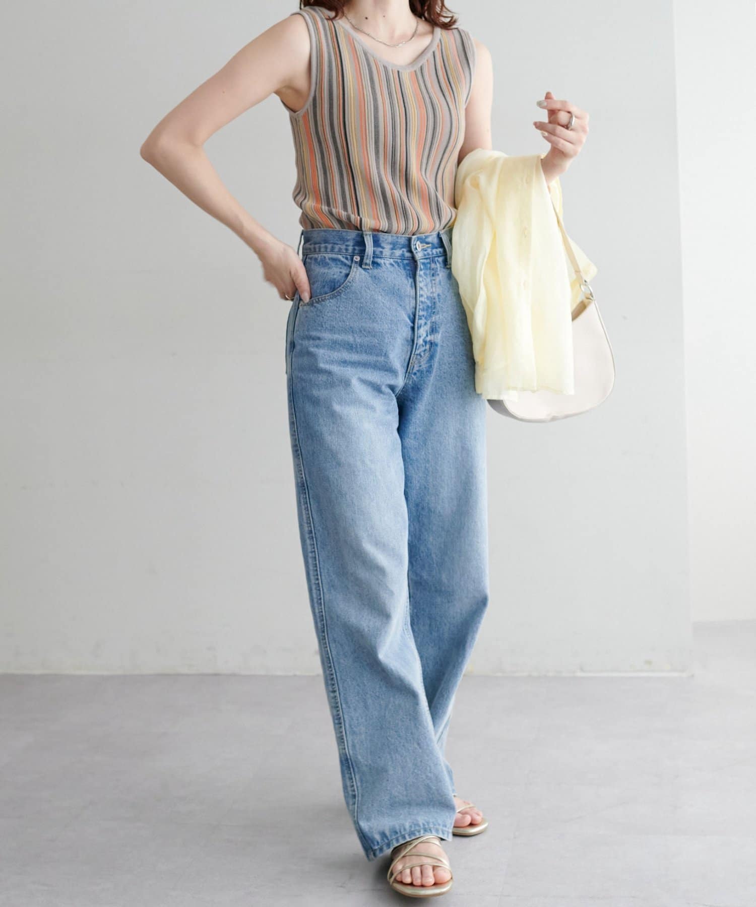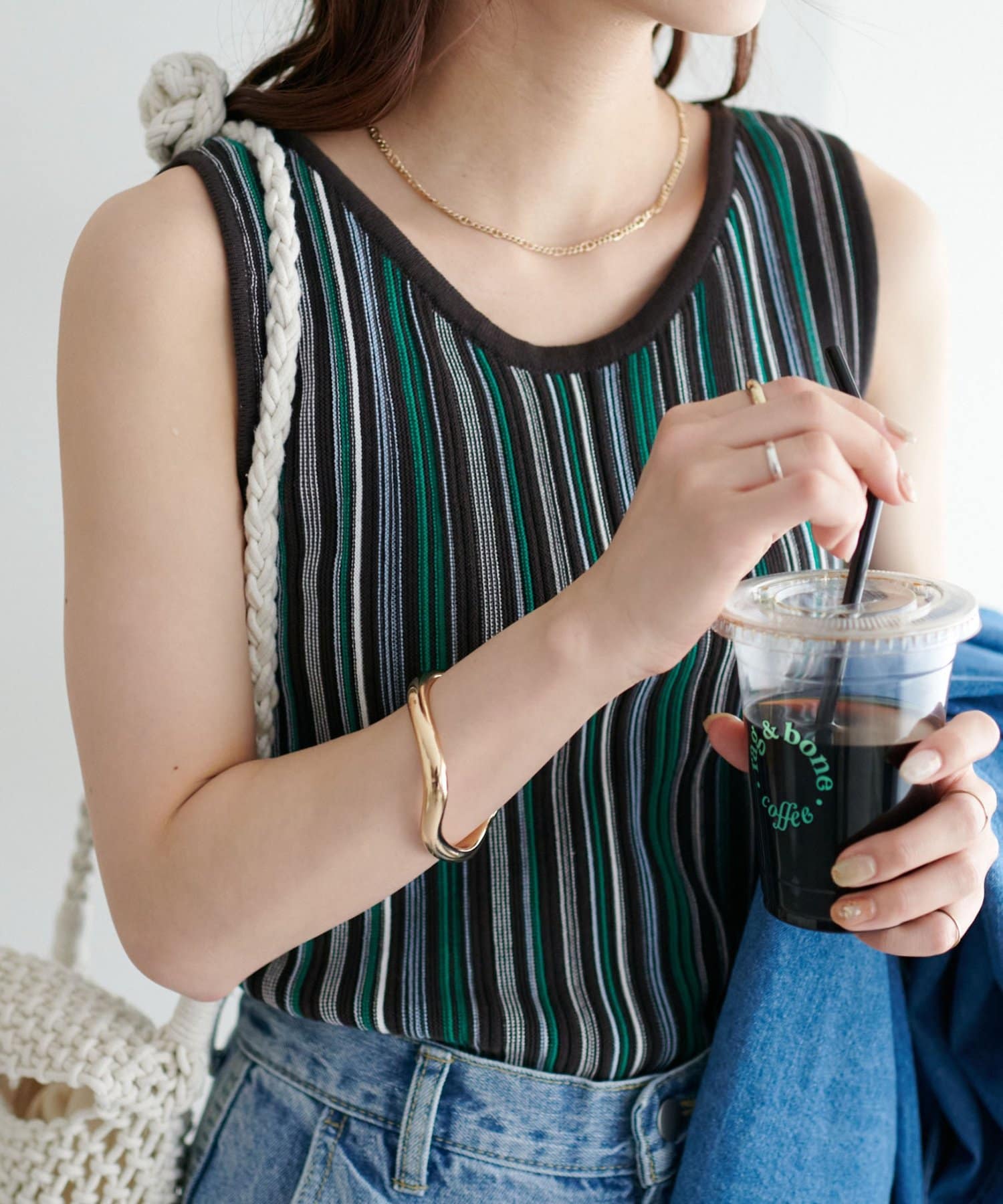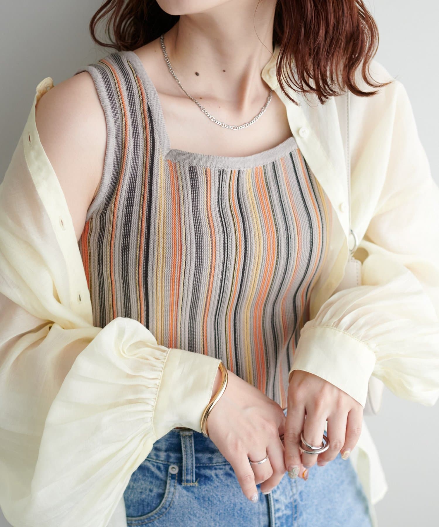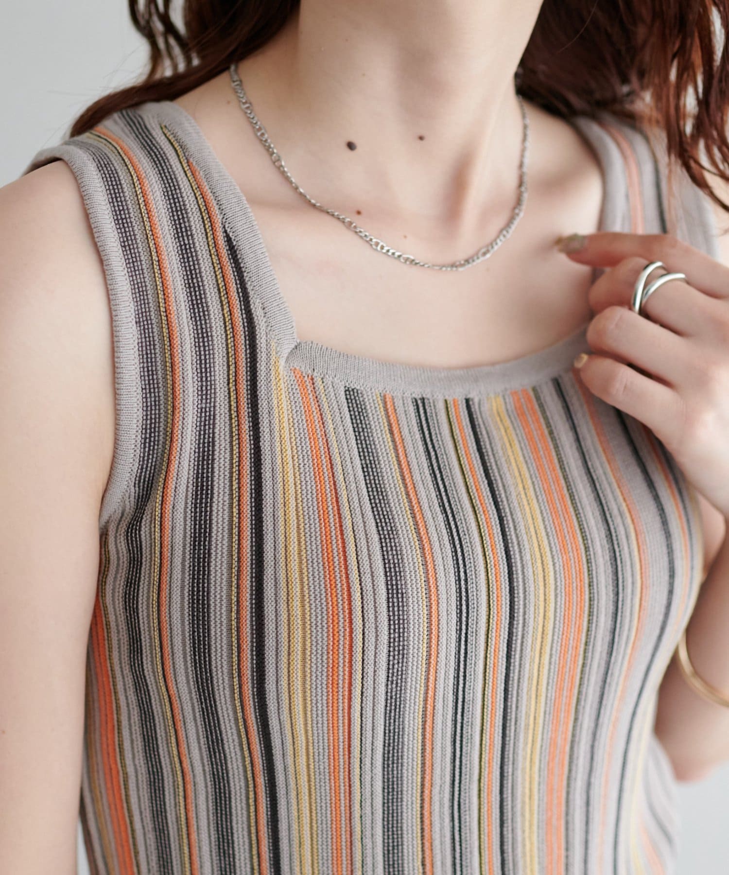 ・コーディネートにアクセントを添える、マルチストライプ柄のタンクトップ