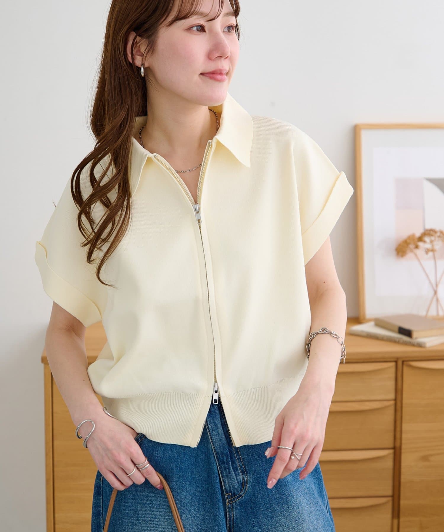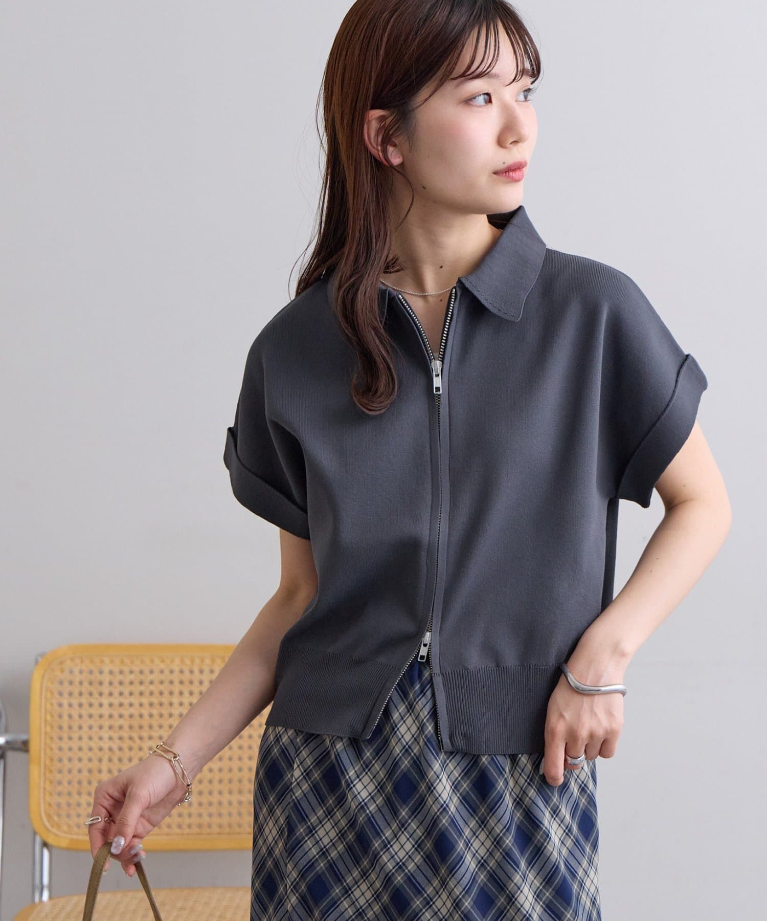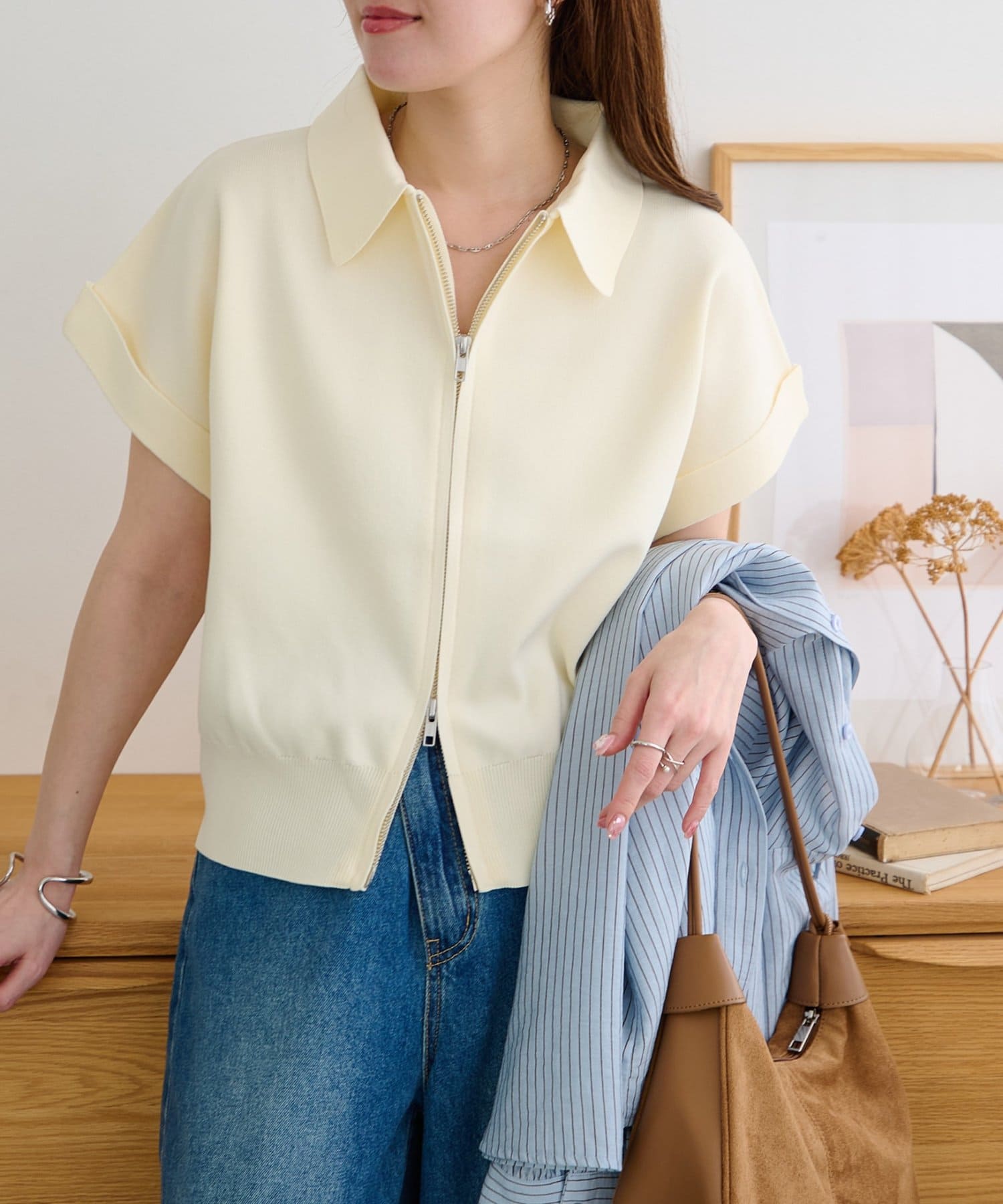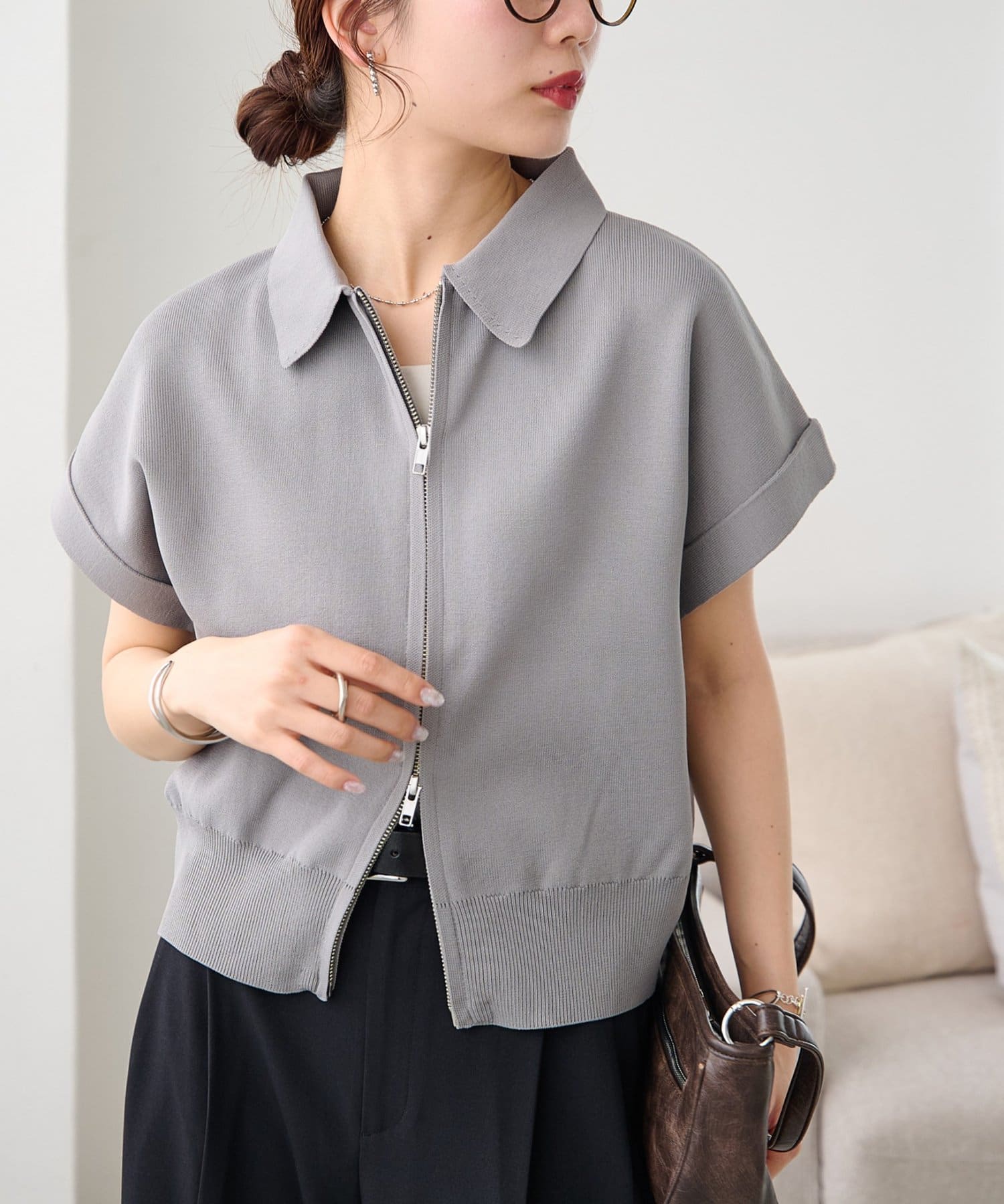 ライトスポンディッシュ衿付Wジップ半袖カーディガン