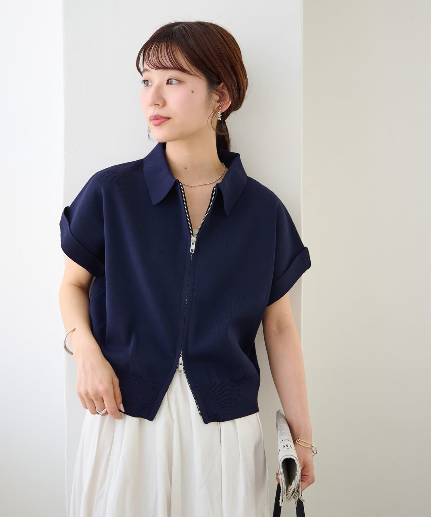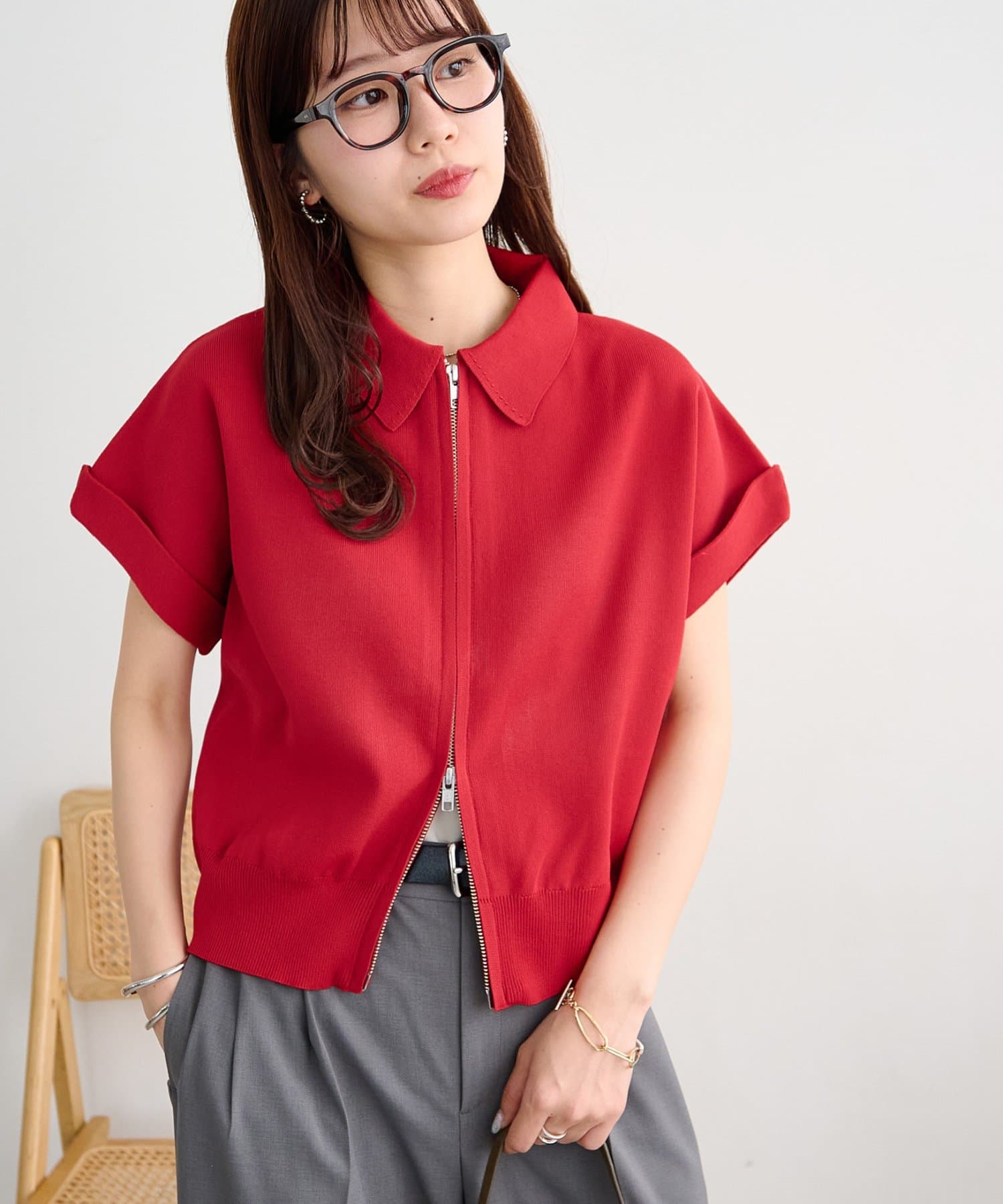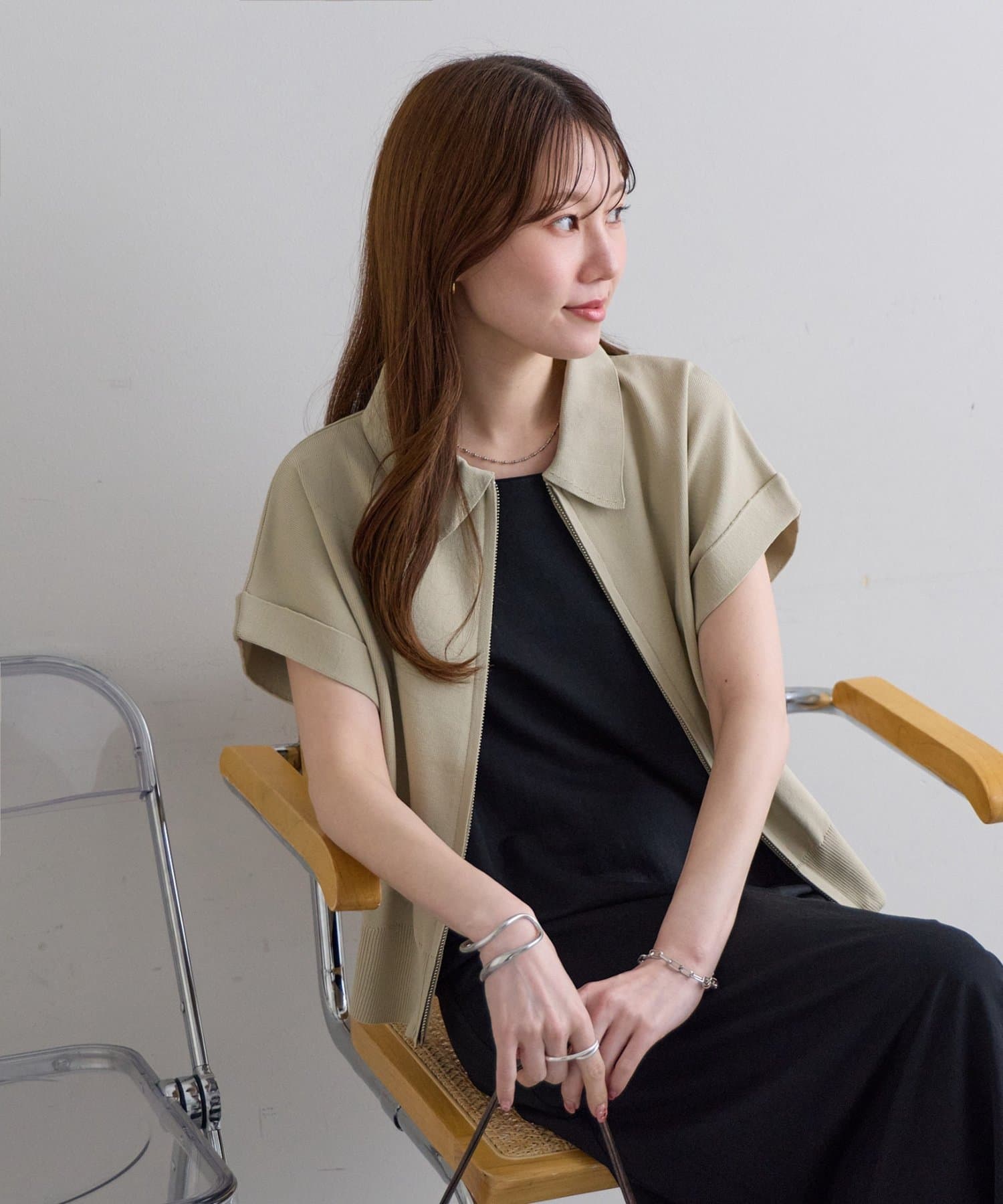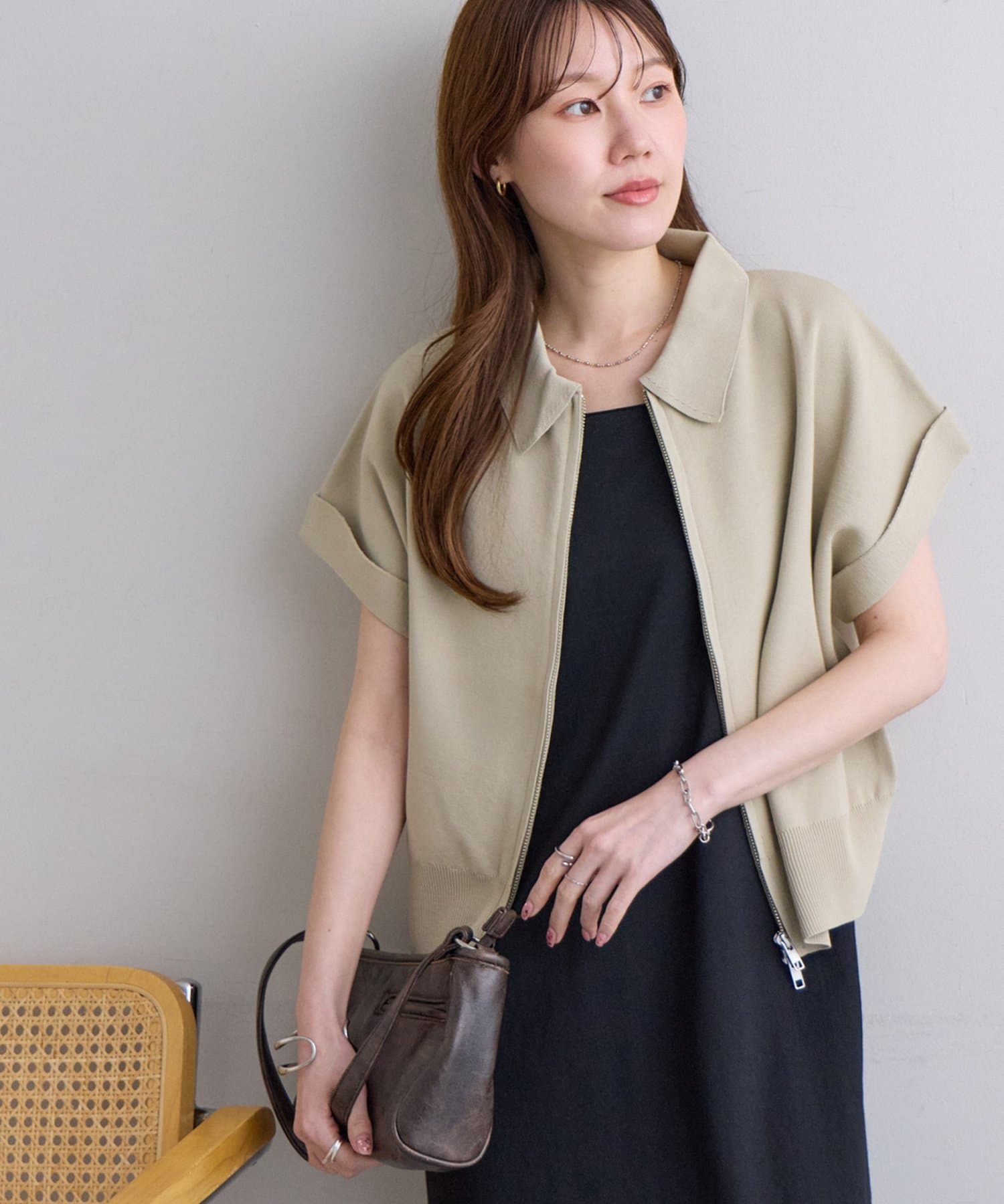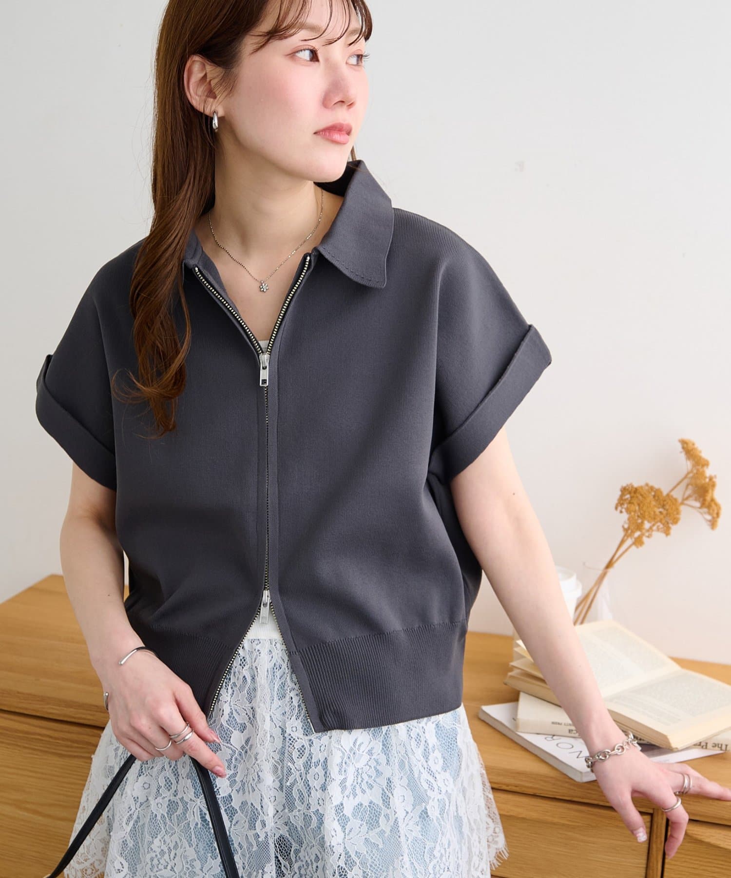ライトスポンディッシュ衿付Wジップ半袖カーディガン