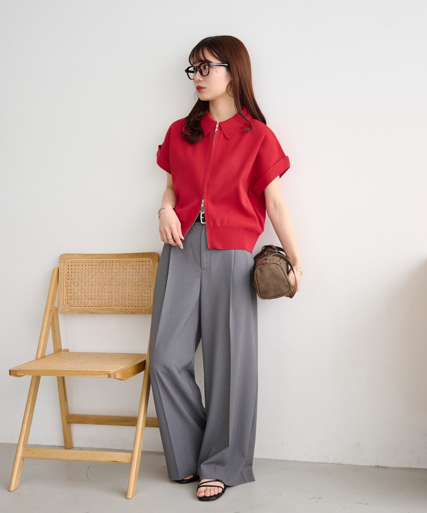 ・ハイウエストのボトムスに、下のジップを開けてインナーを覗かせると、スタイルアップ効果抜群