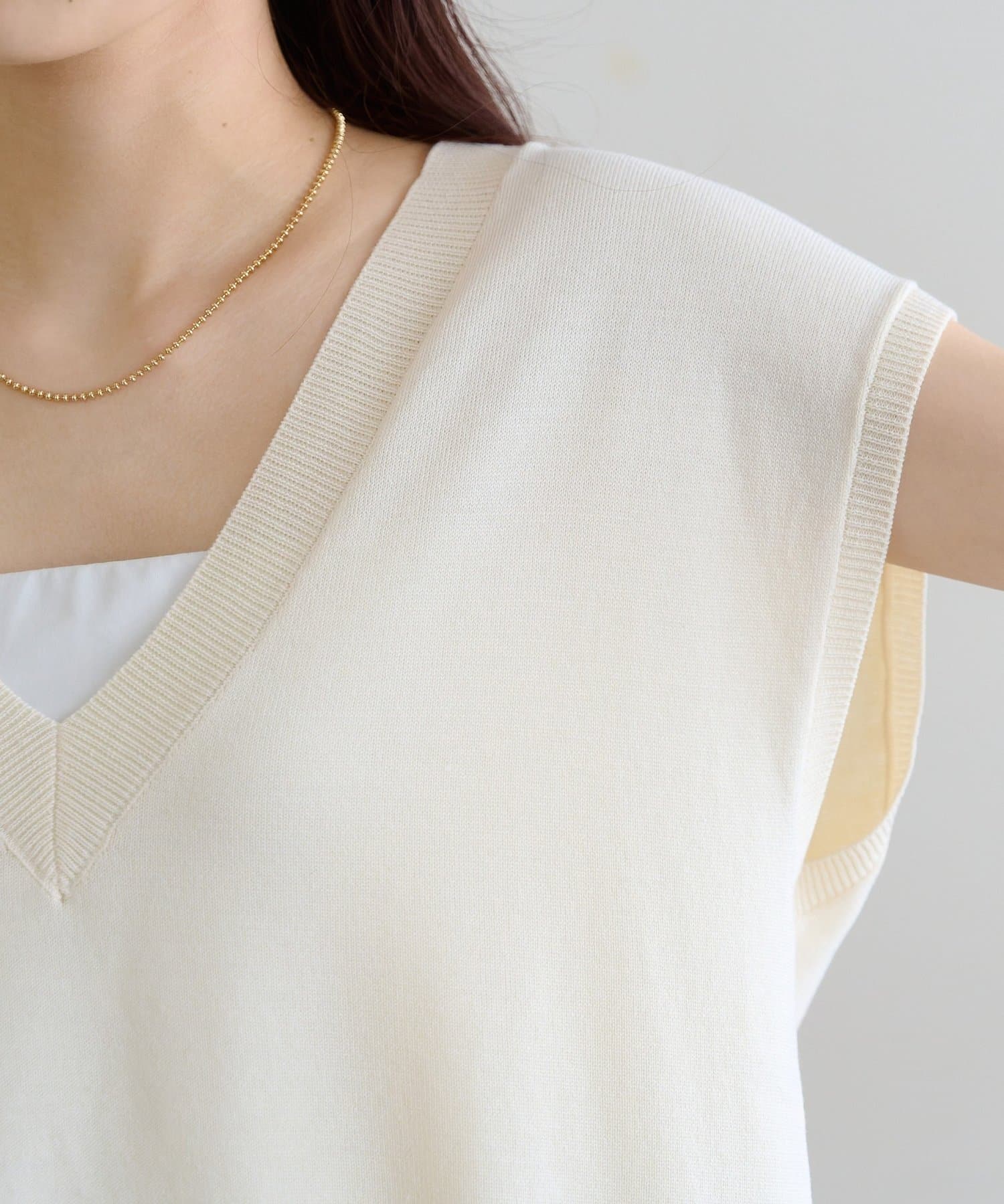 ・深めのVネックで、顔まわりすっきり見せが叶う!
