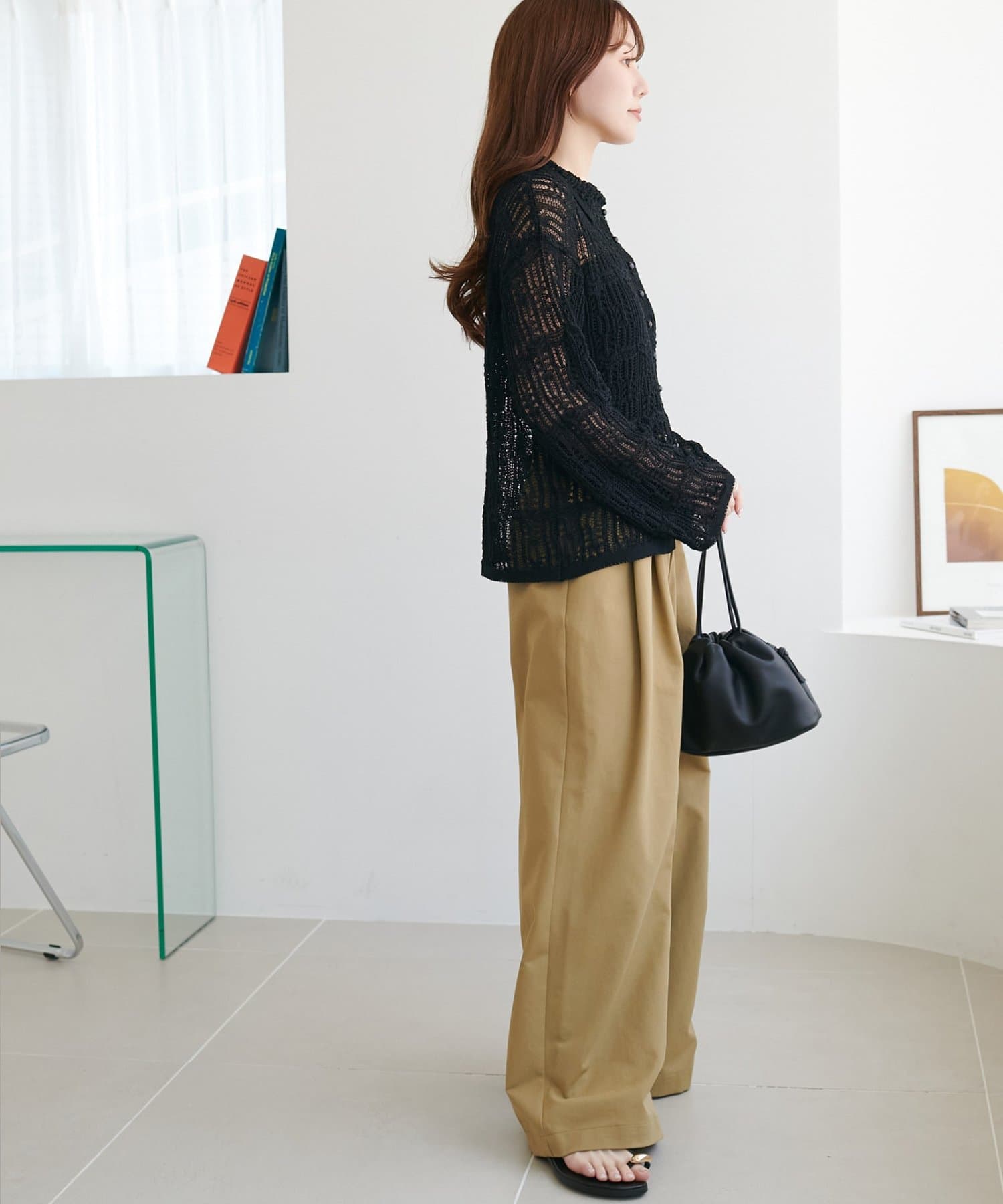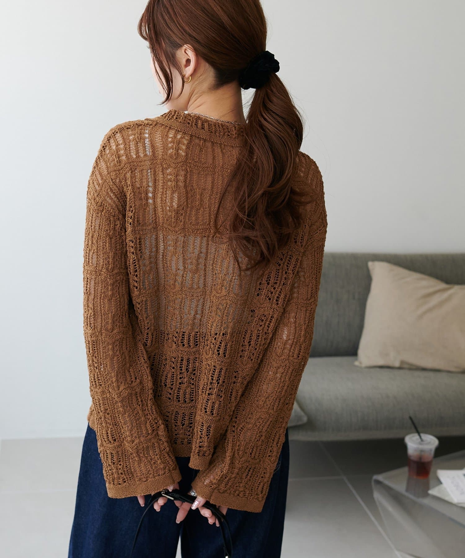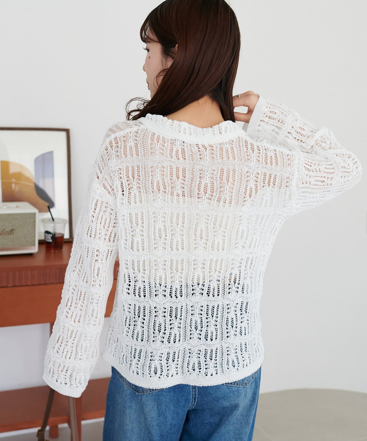 149cmスタッフ:ヒップが隠れる丈感で、袖は指先が少し見えるくらい。透け感があるので重たい印象になりません。ハイウエストのボトムスと合わせるとバランス良く着こなせます◎