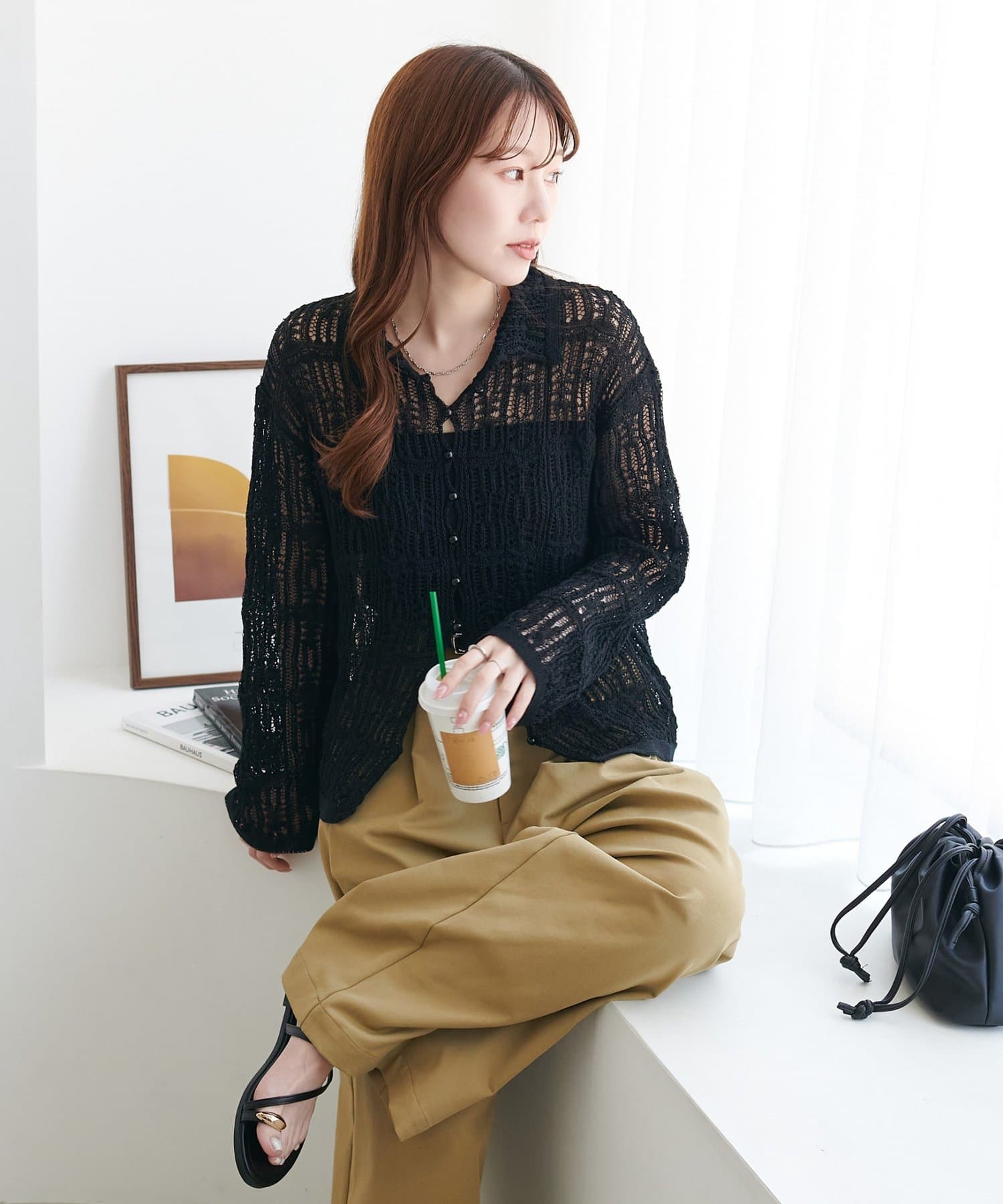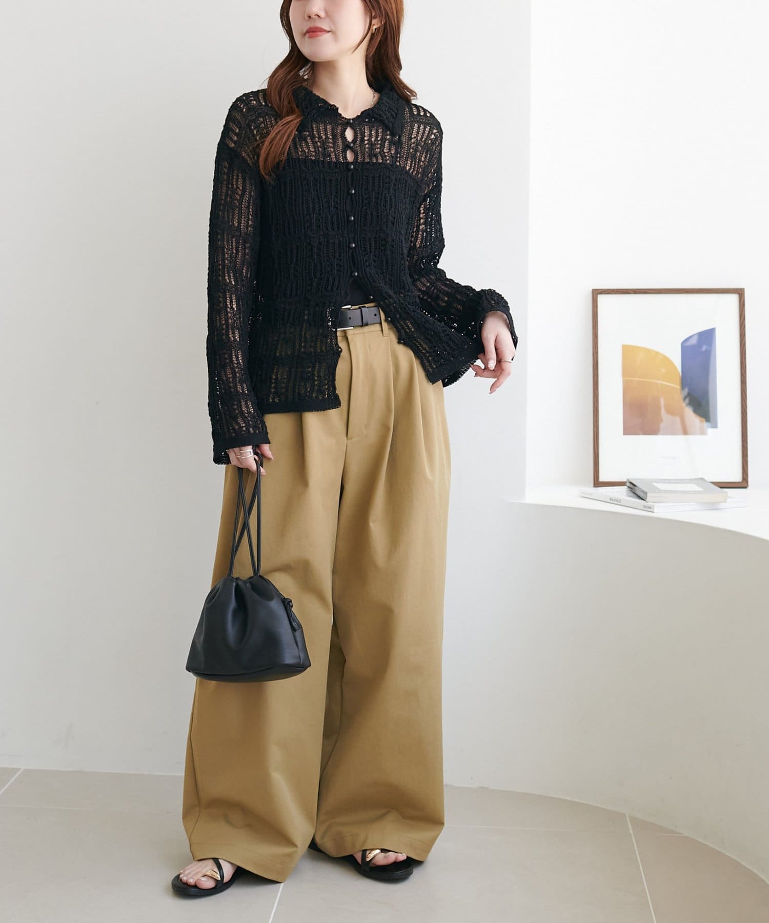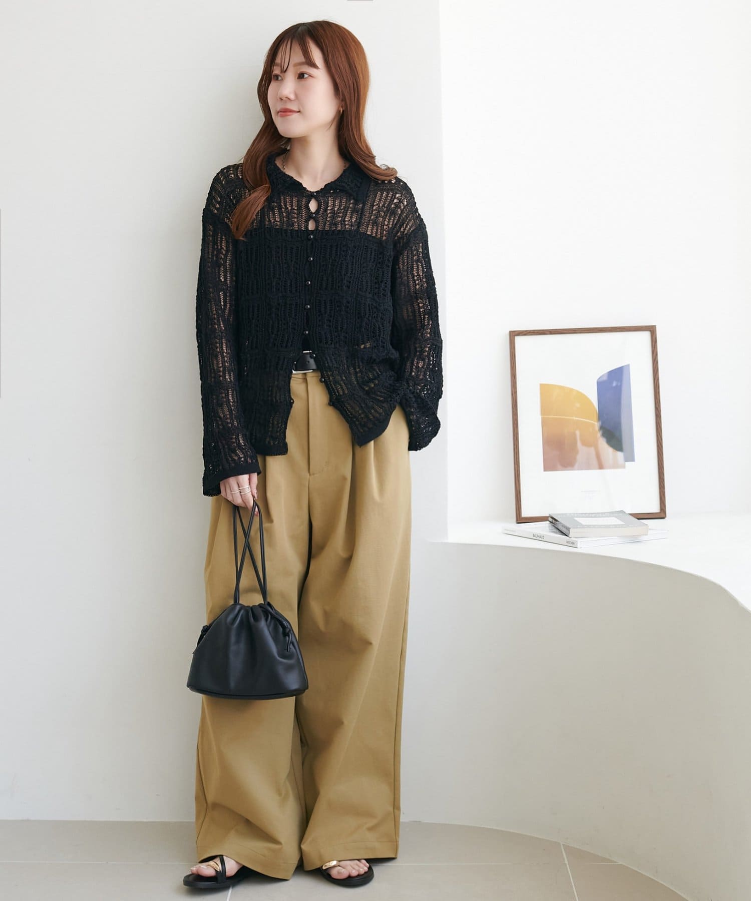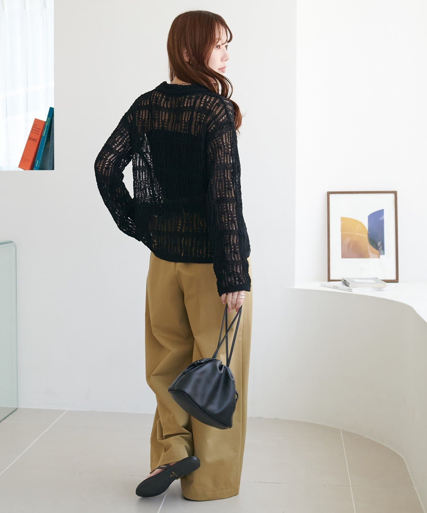 149cmスタッフ:ヒップが隠れる丈感で、袖は指先が少し見えるくらい。透け感があるので重たい印象になりません。ハイウエストのボトムスと合わせるとバランス良く着こなせます◎