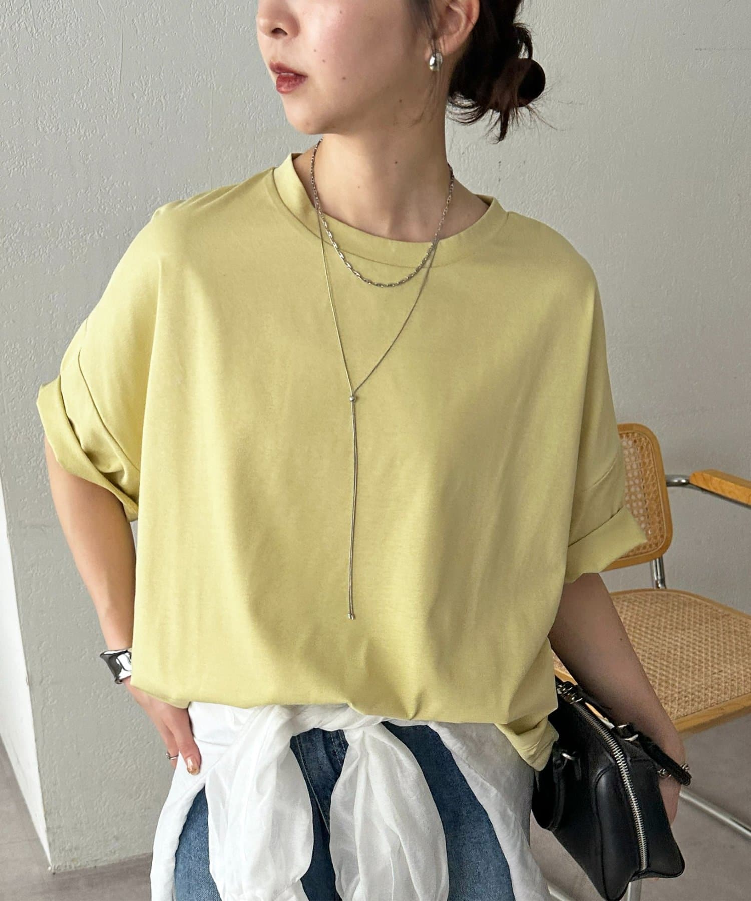 ・シンプルなクルーネックデザインなので、ネックレスなどのアクセサリーも映え、カジュアルからきれいめまで幅広く活躍します。