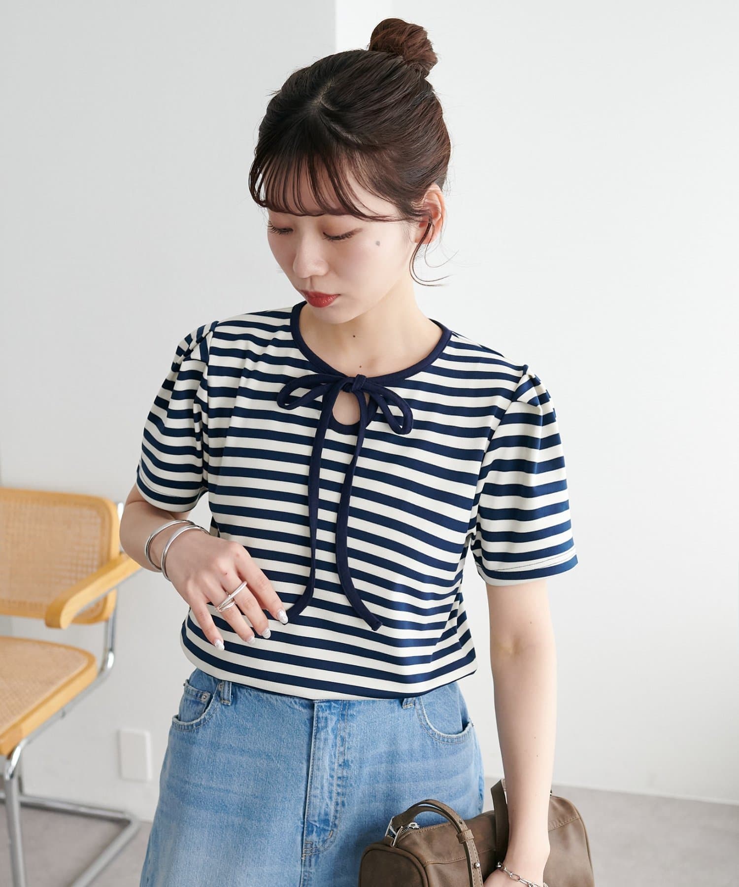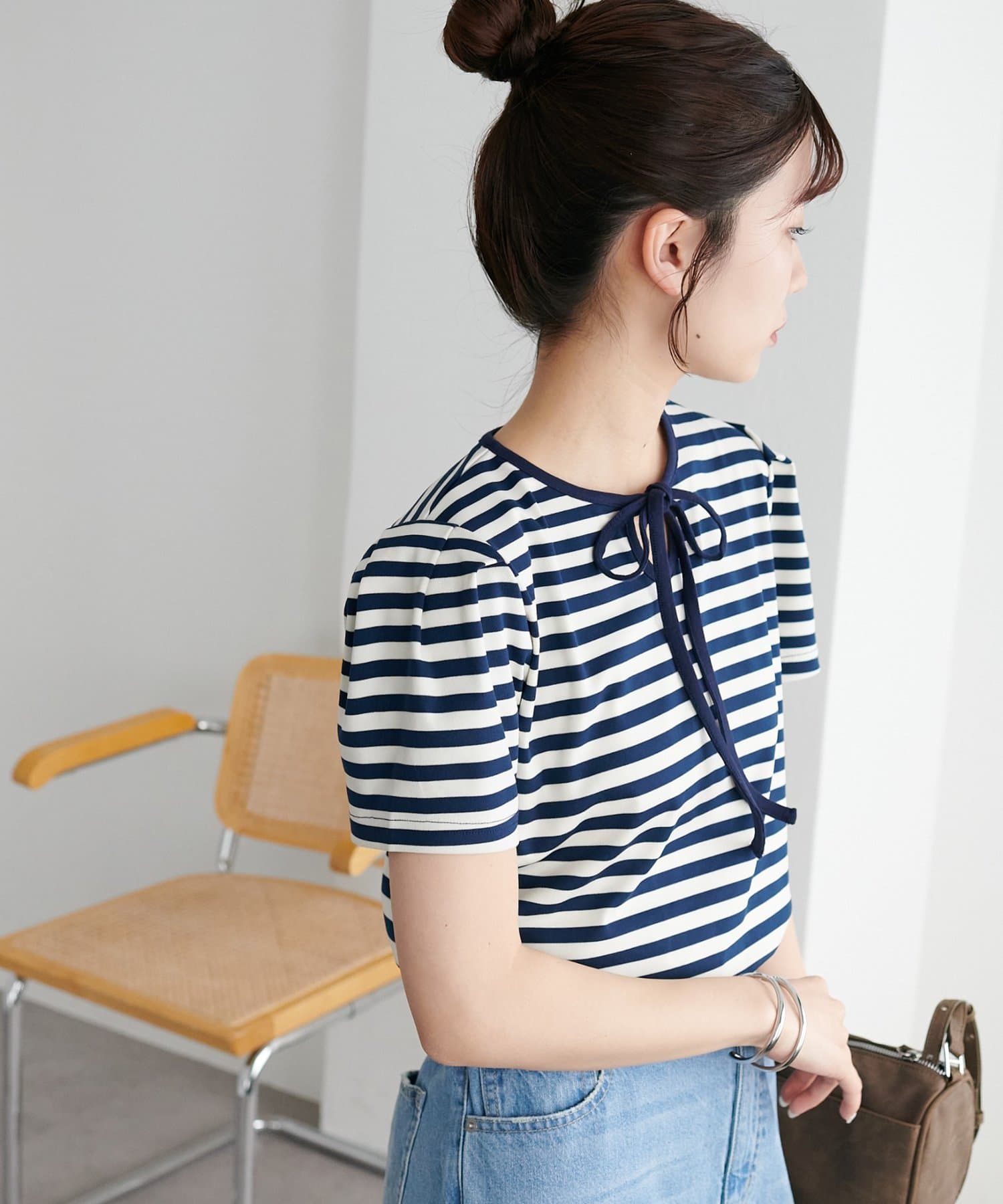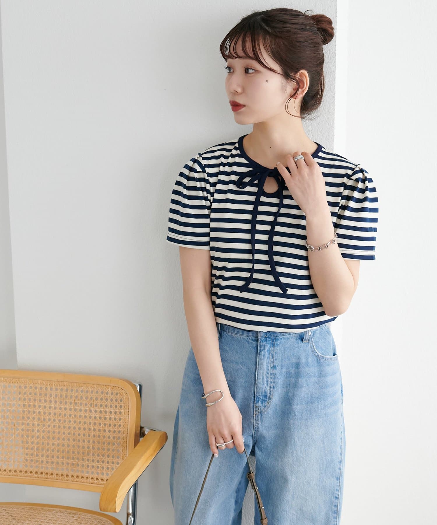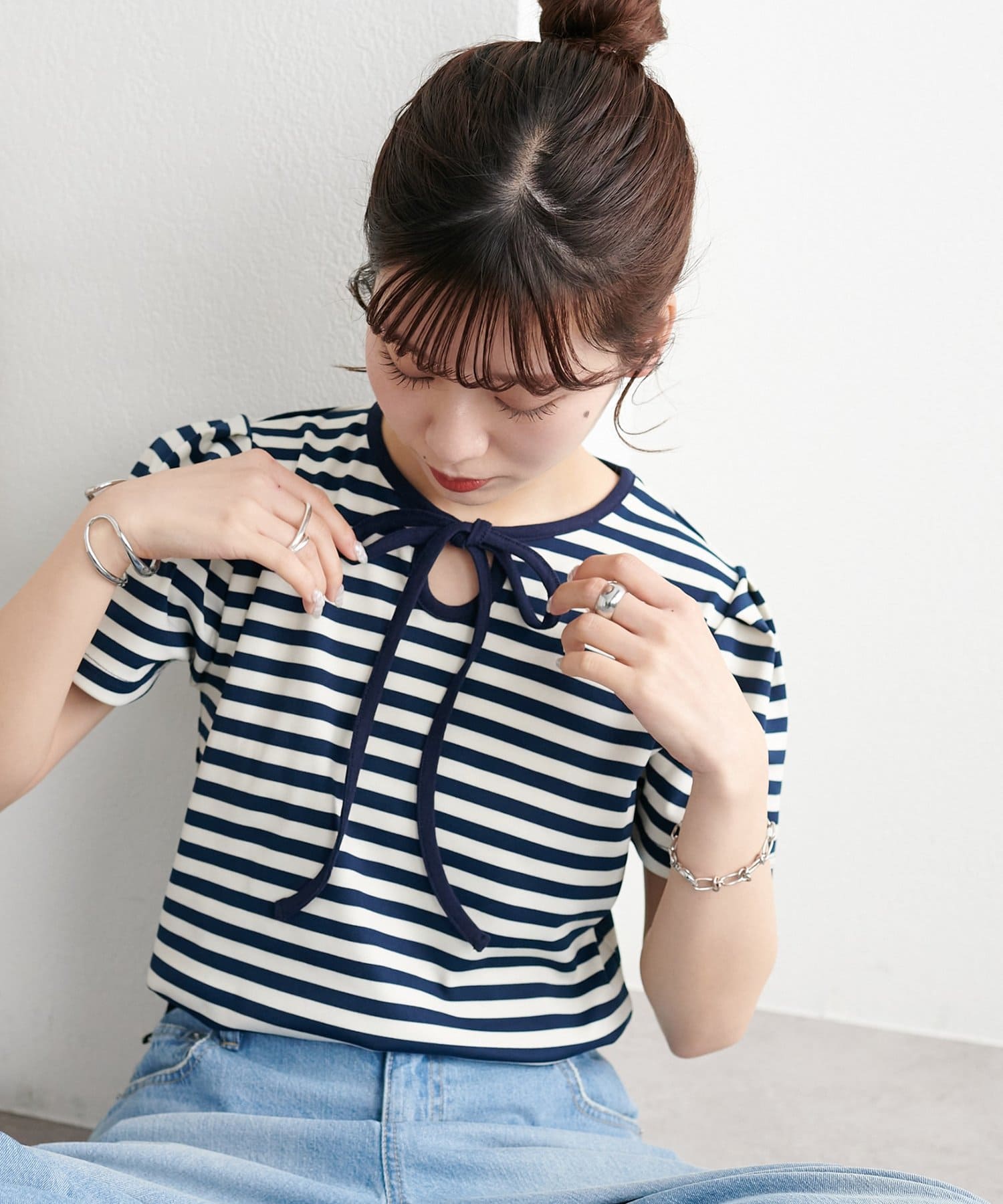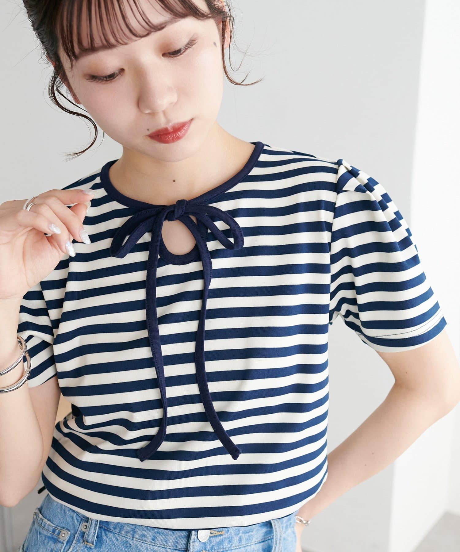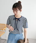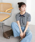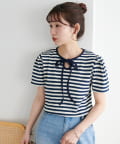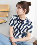 一枚で着映えする、大人可愛いリボン付きボーダーTシャツ