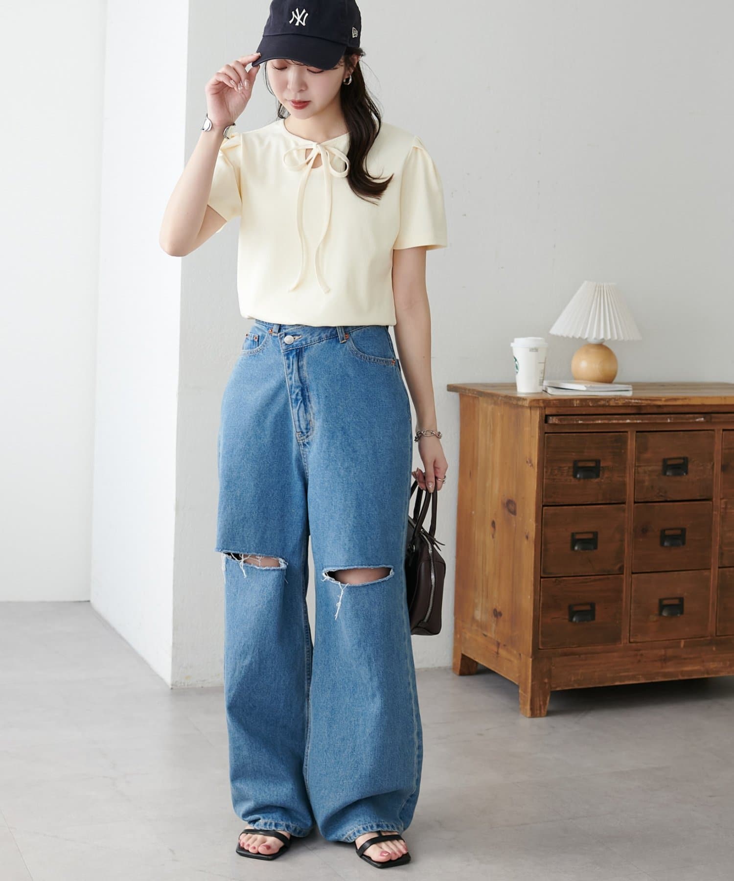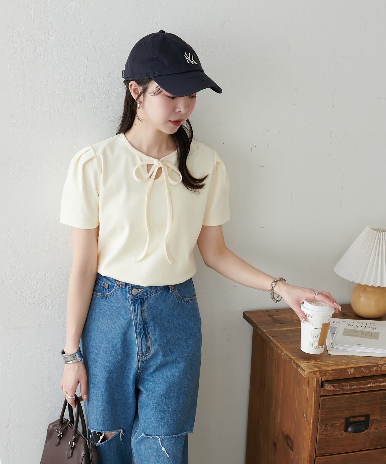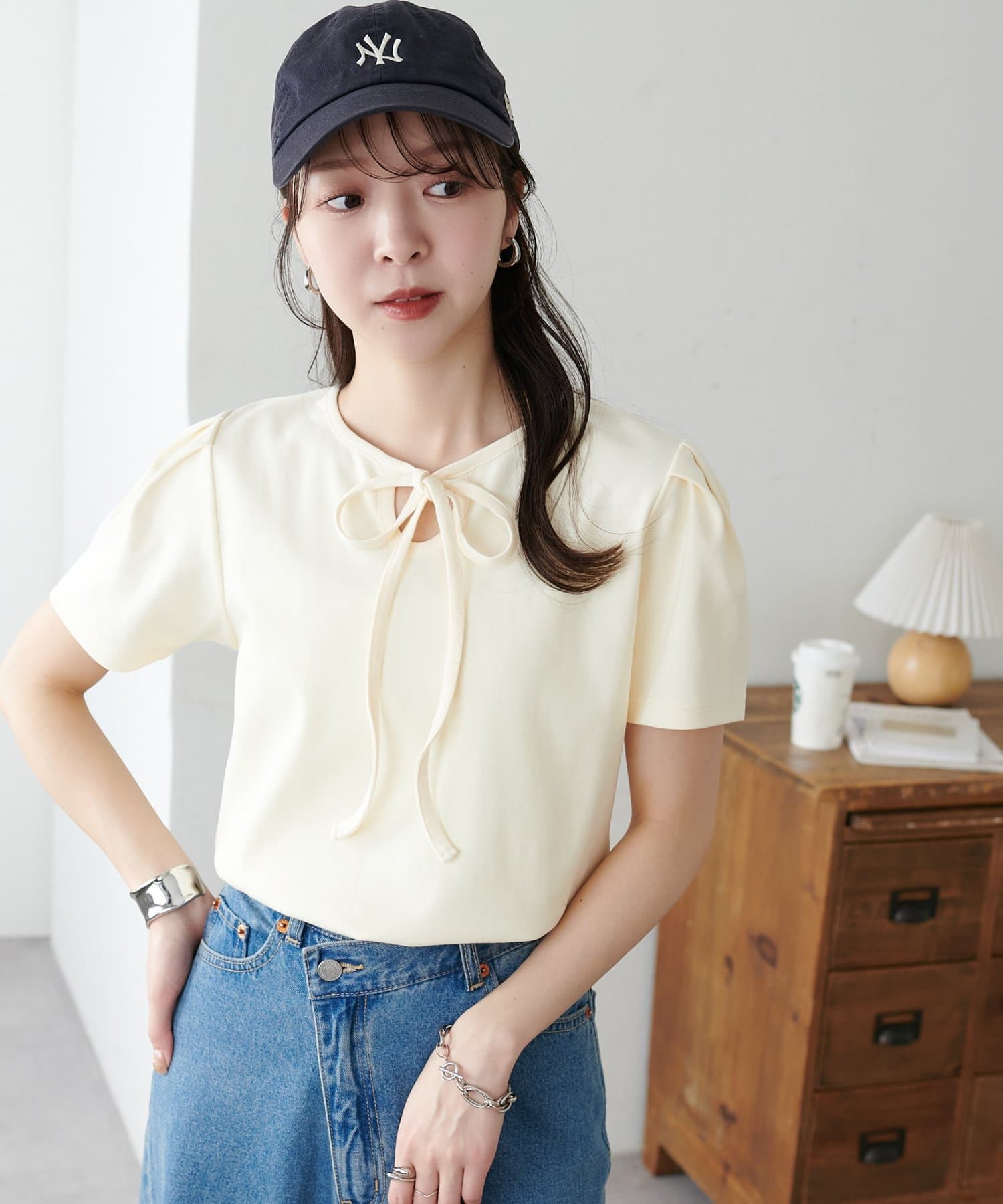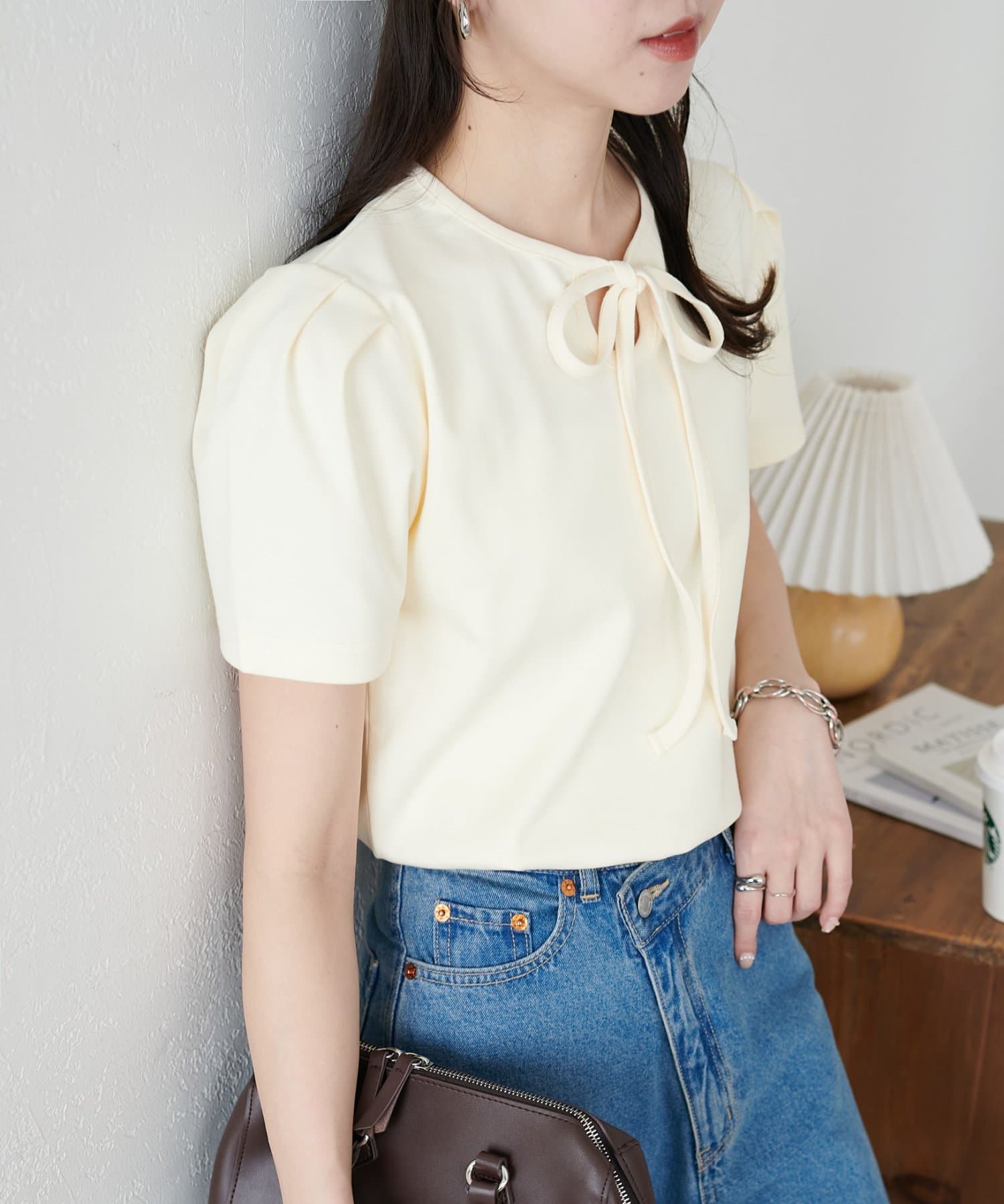 ・サロペットやキャミワンピースのインナーとして着用し、胸元のリボンを覗かせるレイヤードスタイルも、こなれ感が出てお洒落ですよ♪