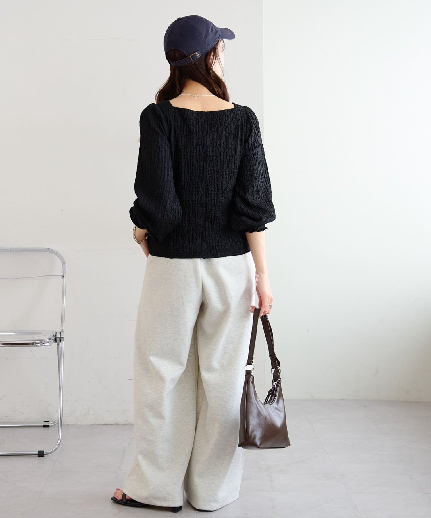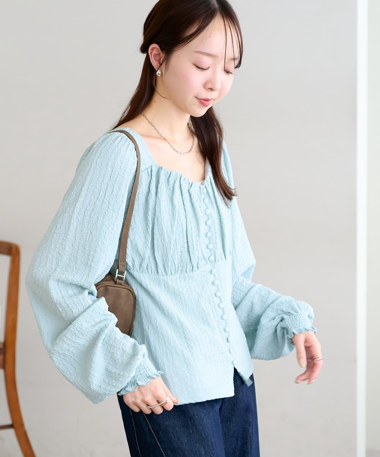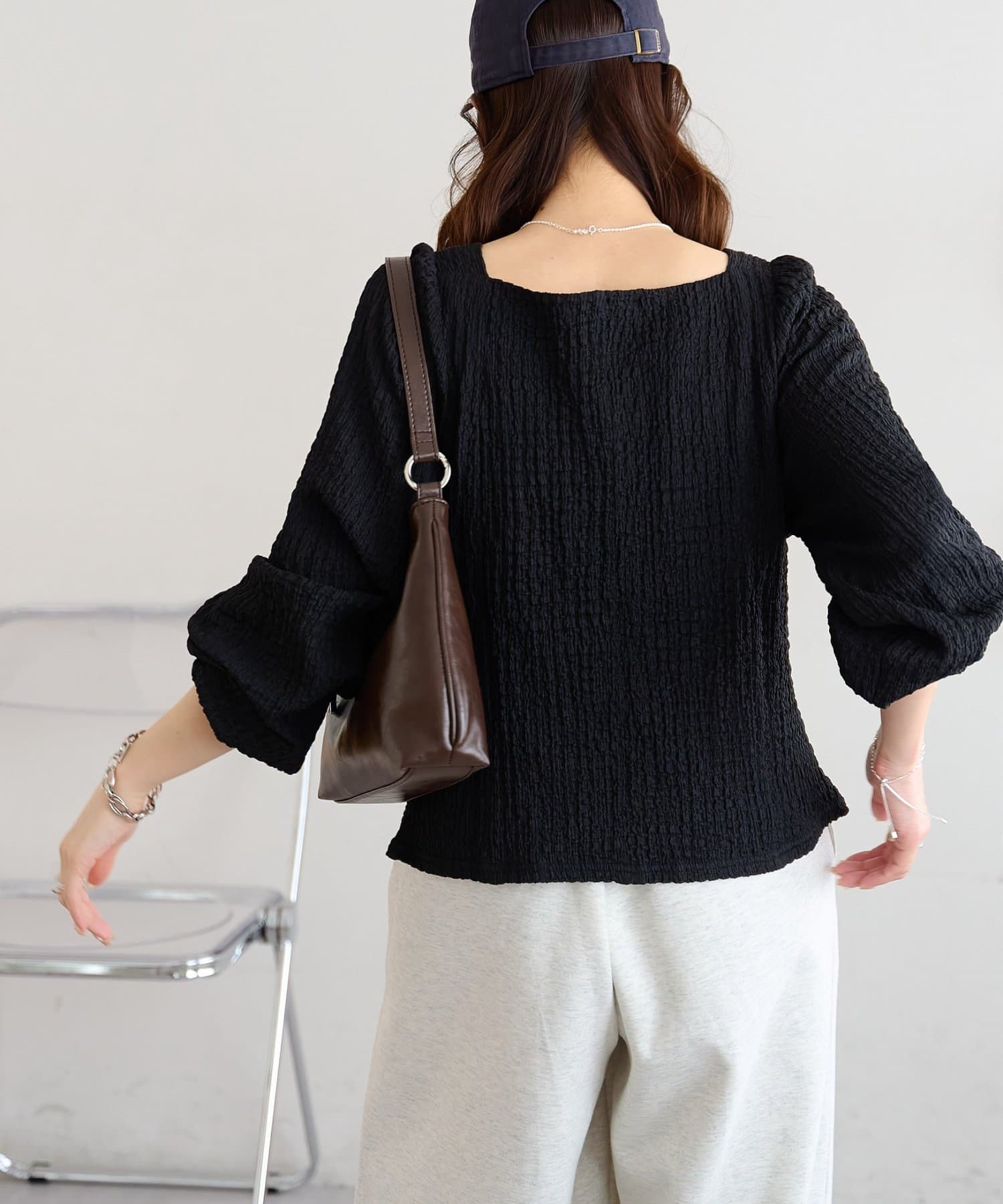 155cmスタッフ:着丈がコンパクトなので、ロングスカートやワイドパンツと合わせてもバランスが取りやすいです!