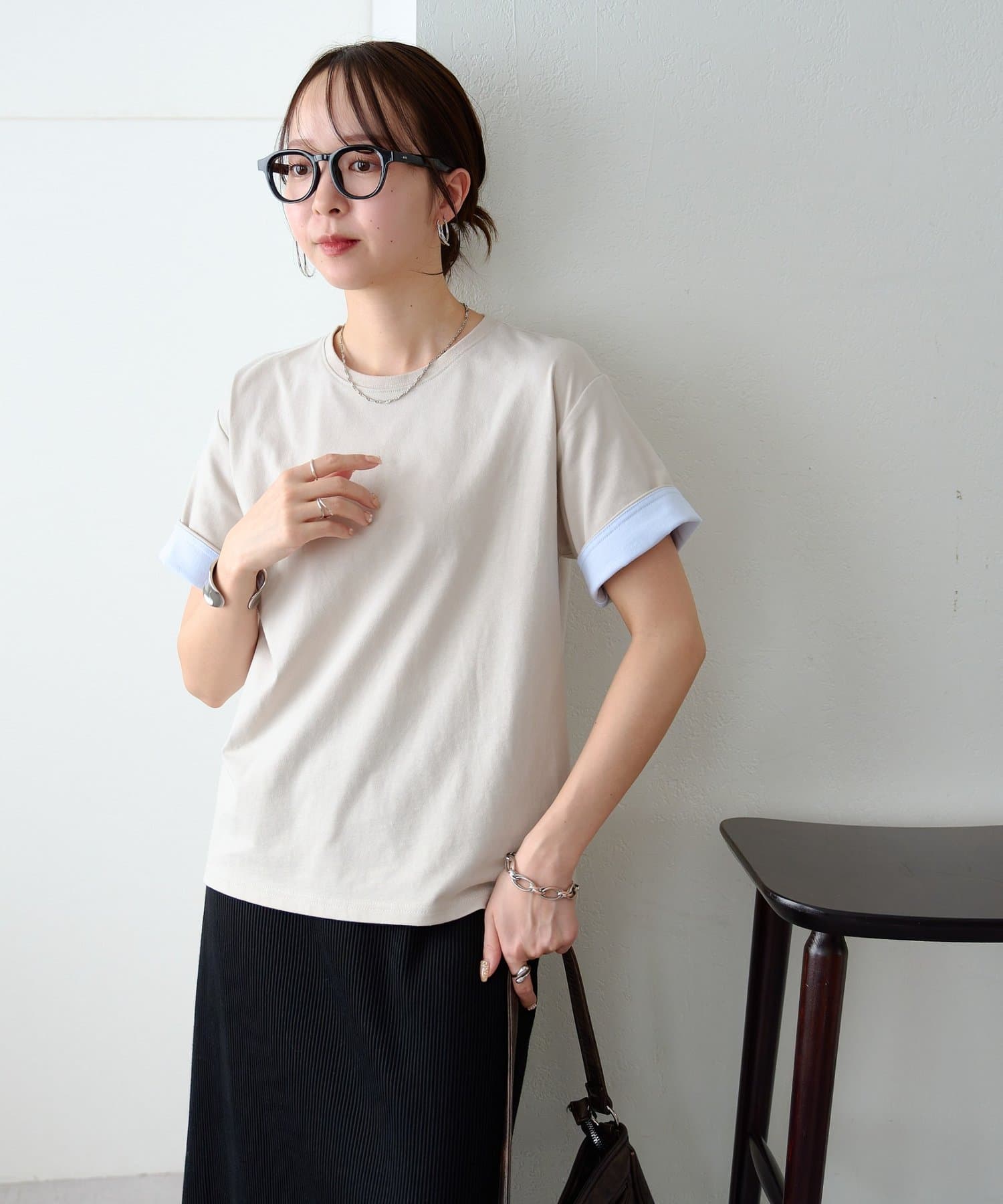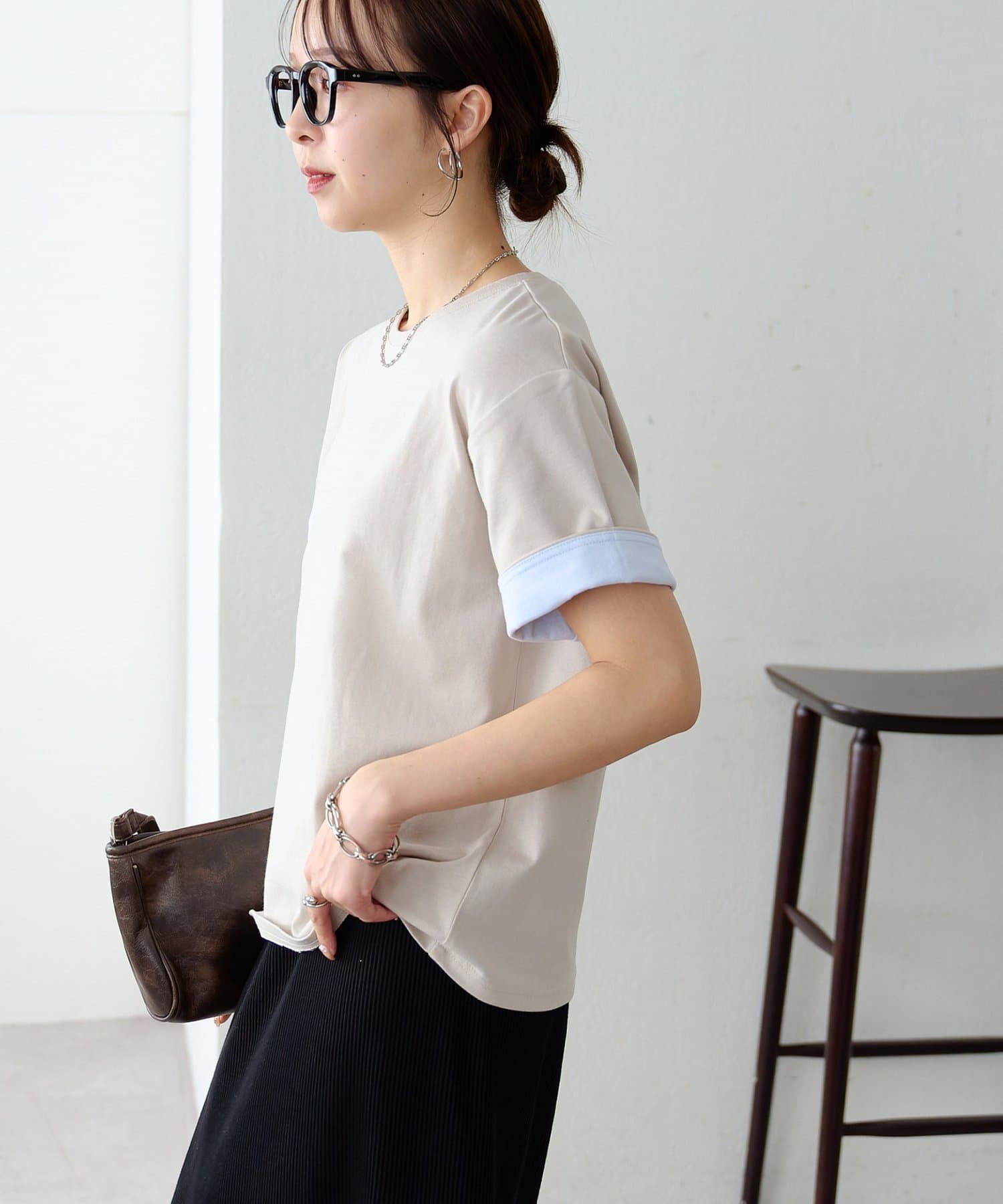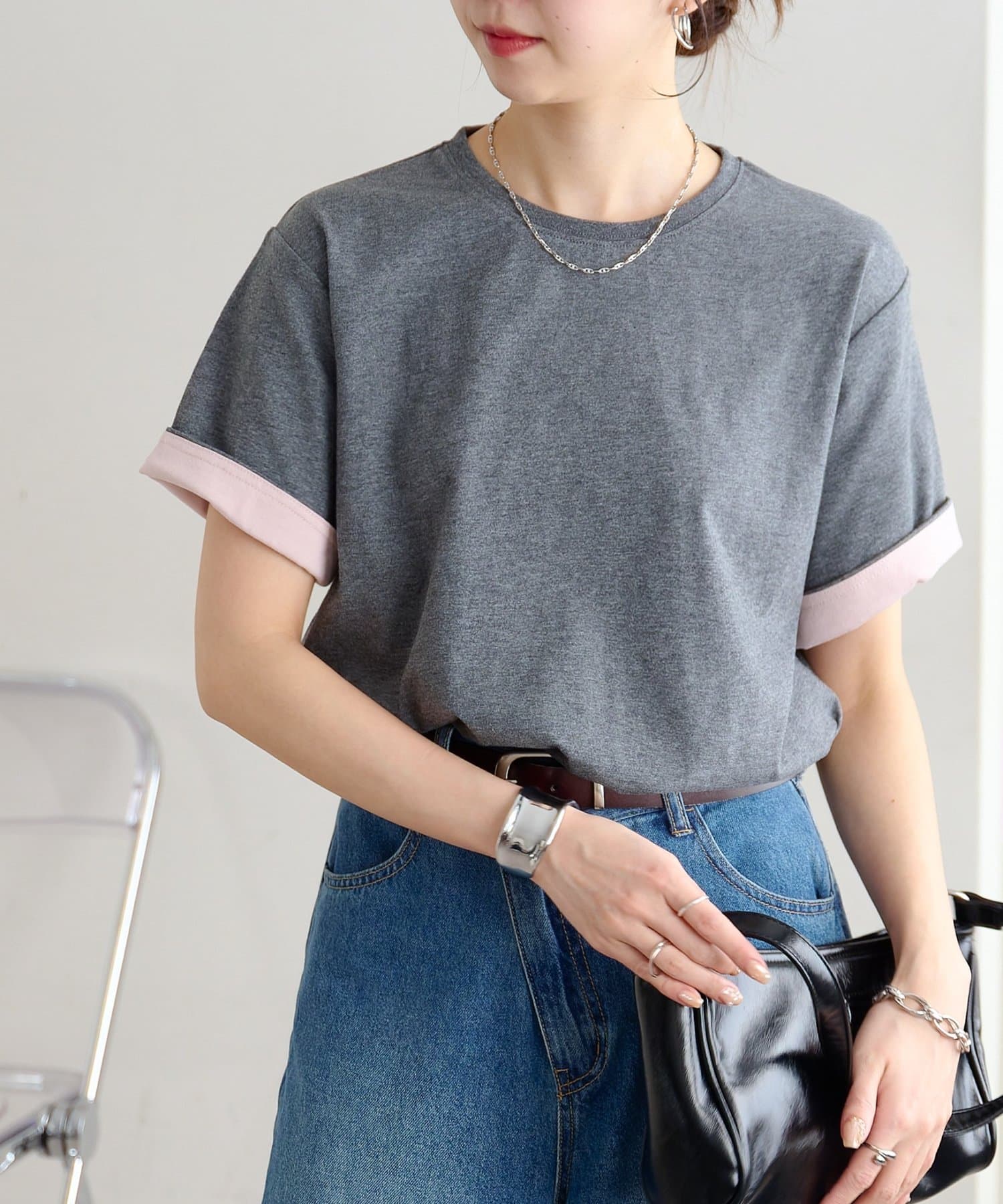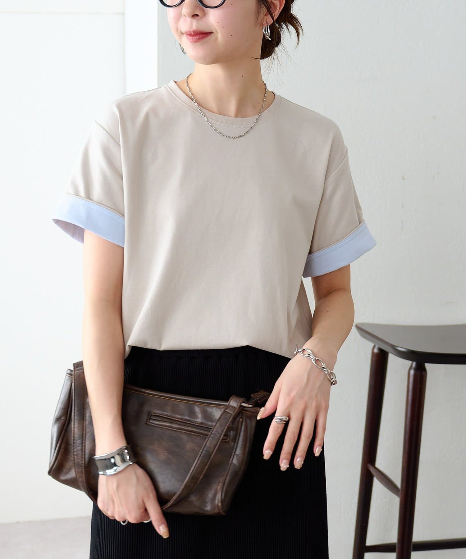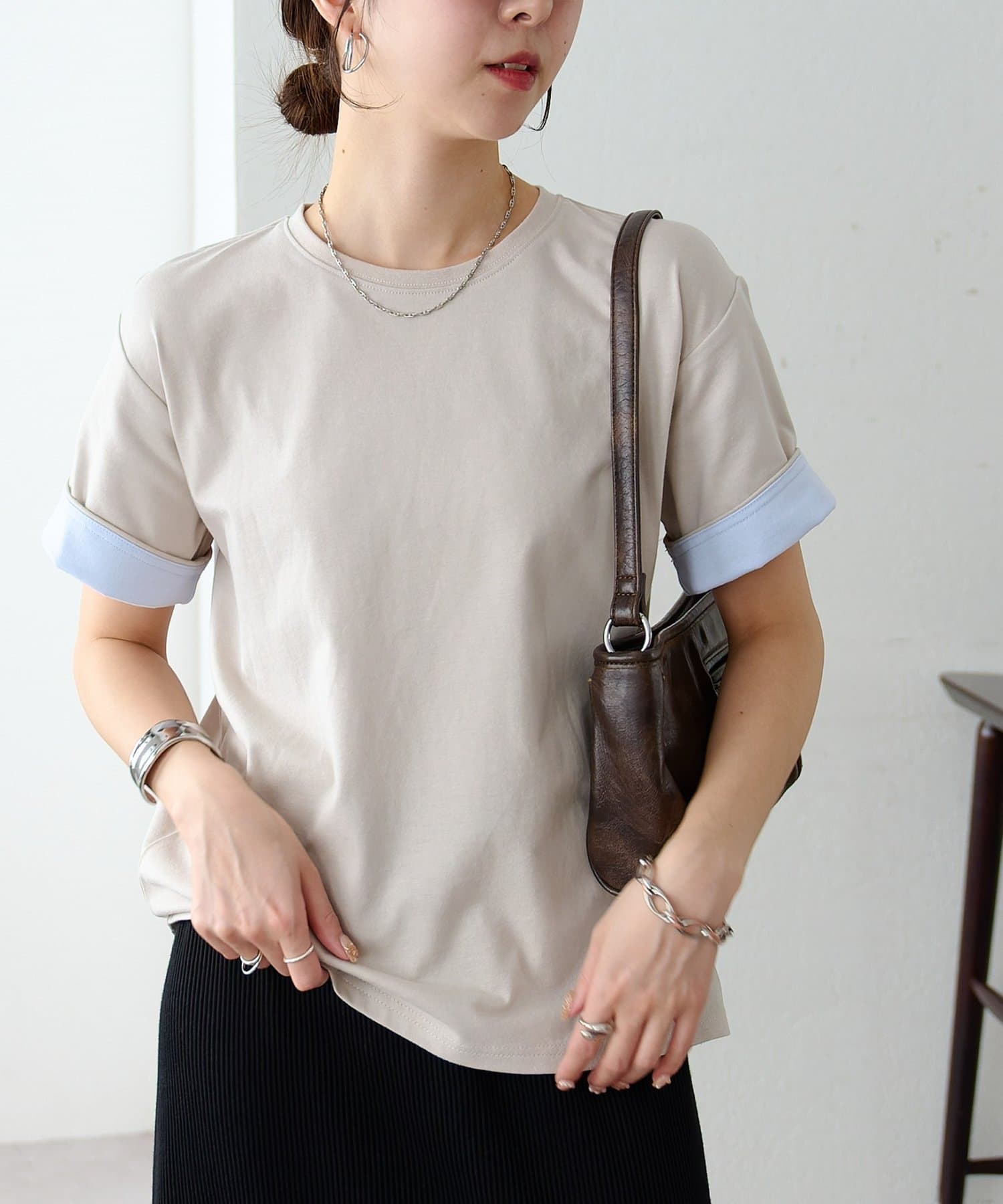 袖のバイカラーがアクセントのクルーネックTシャツ