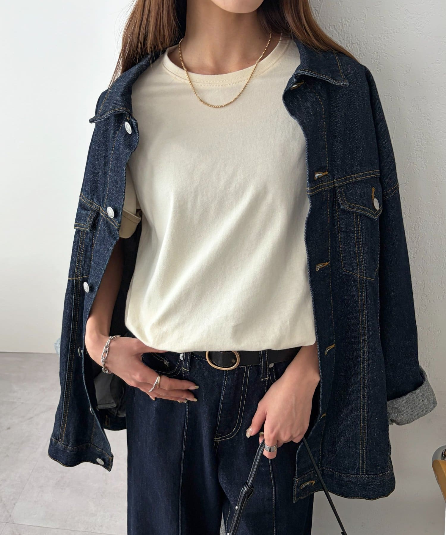 ・デニムパンツと合わせた定番カジュアルスタイル。