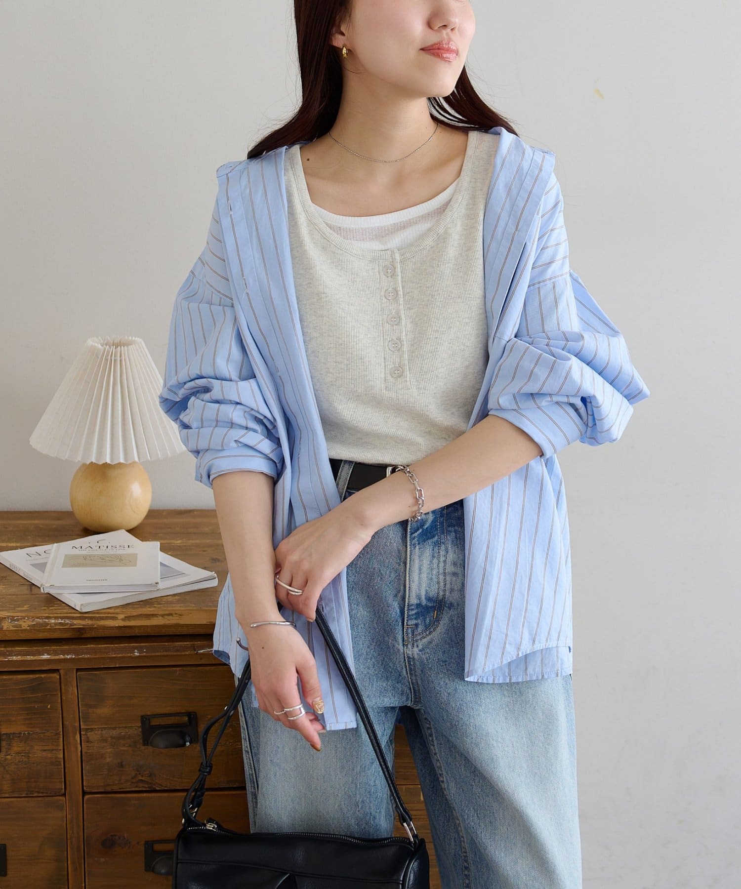 ・首元はヘンリーネックデザインで、顔周りにすっきりとしたアクセントをプラスします