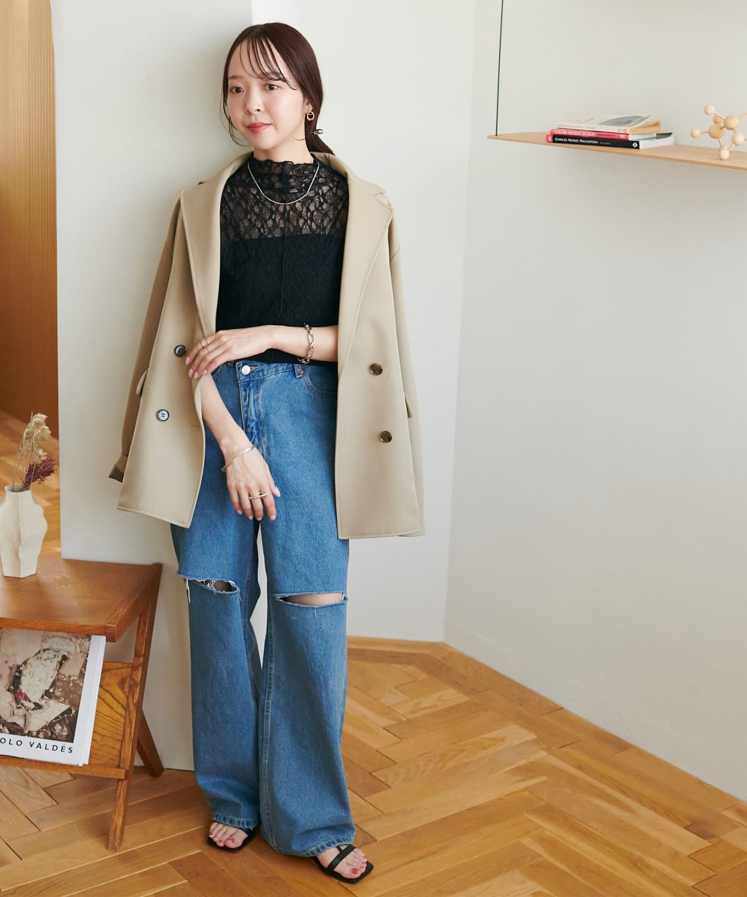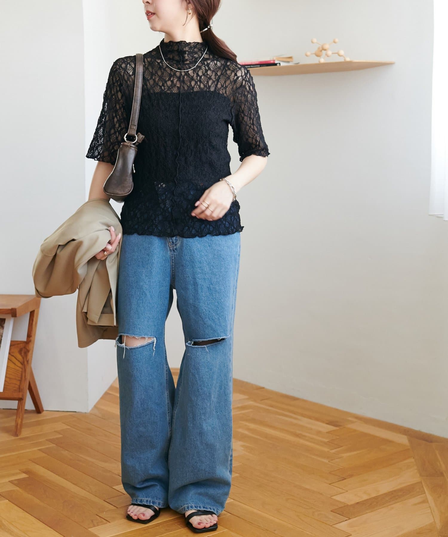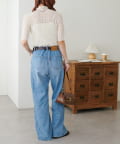 ・デニムパンツと合わせてカジュアルダウンさせれば、甘すぎない大人の休日スタイルが完成します。