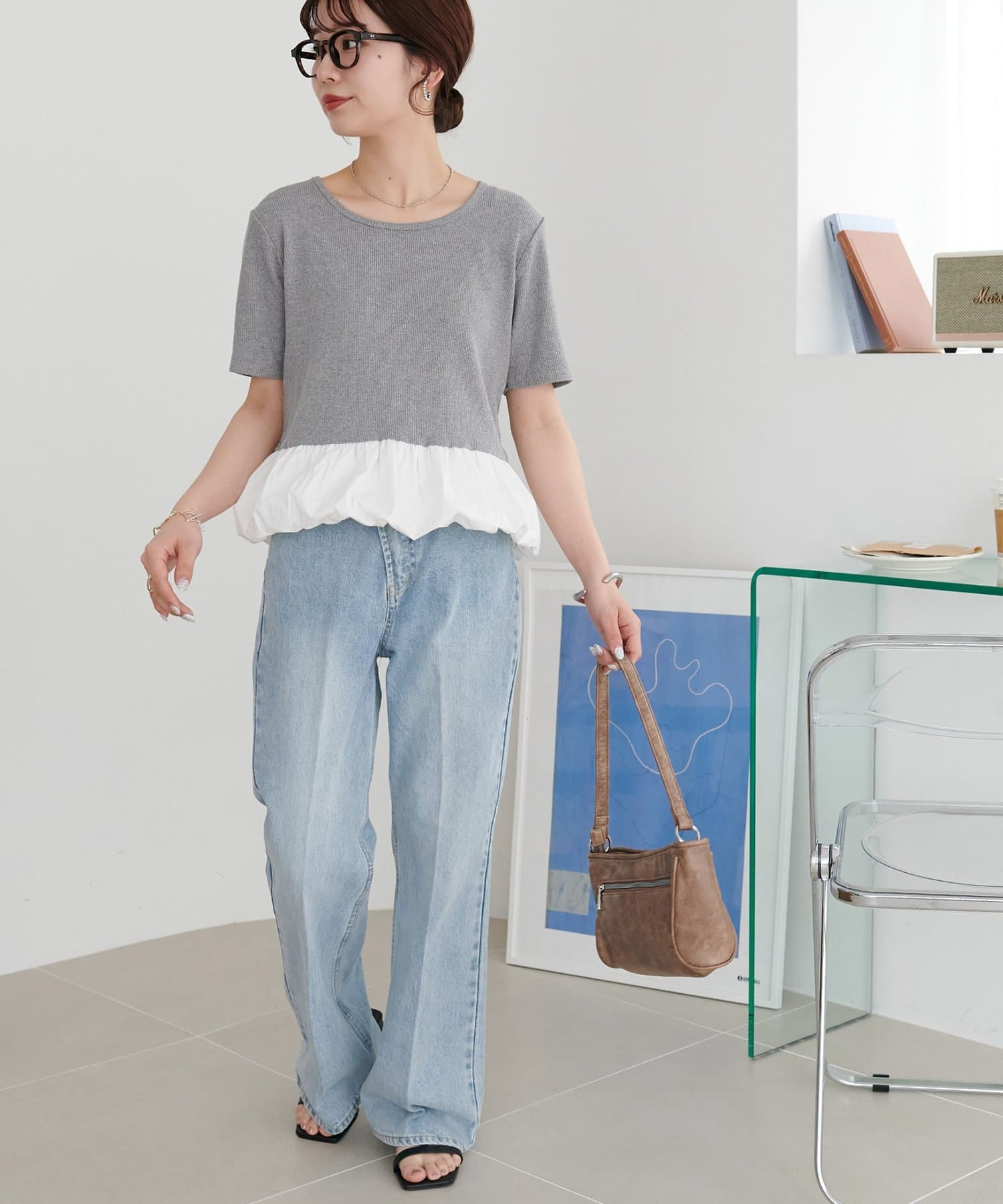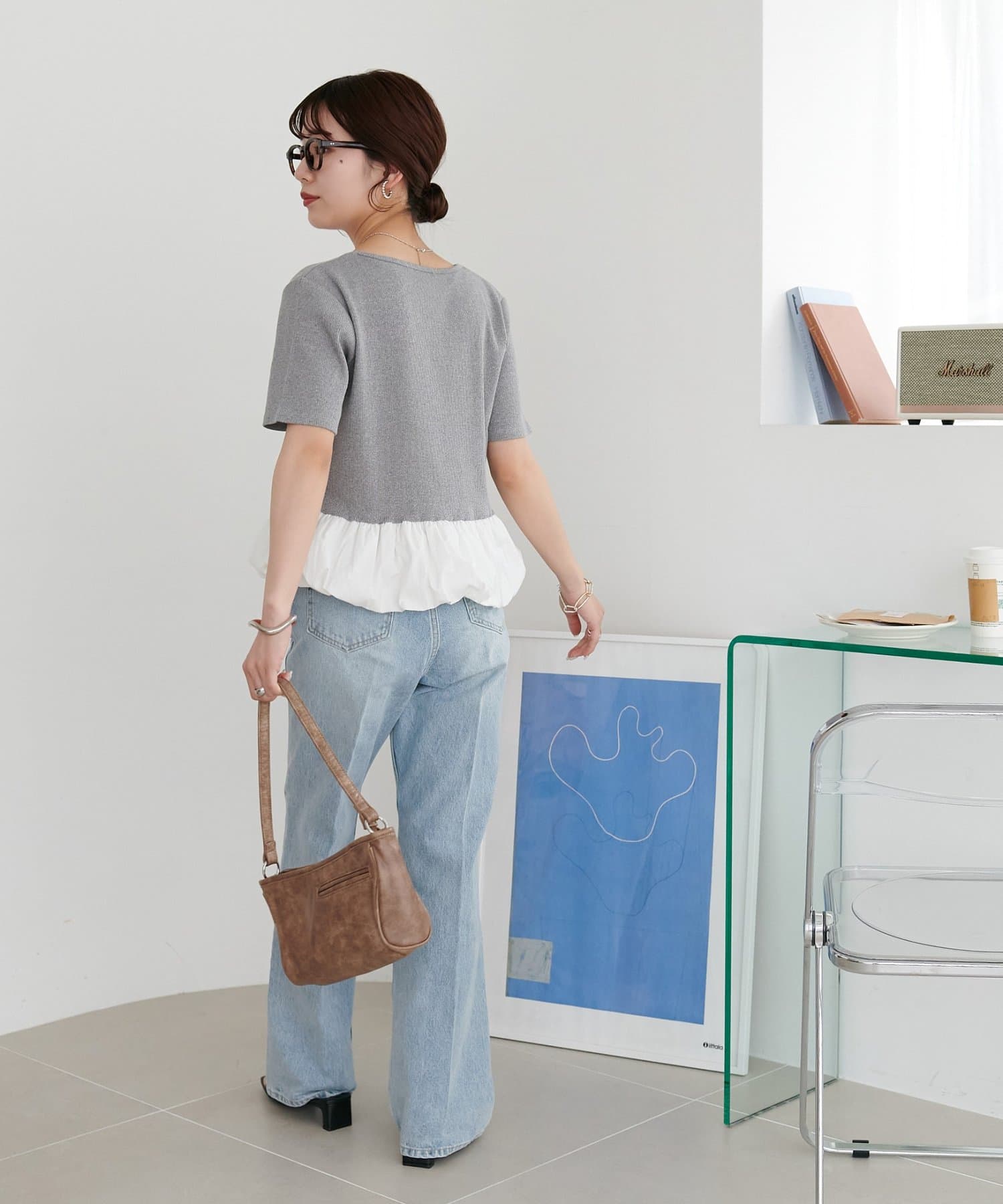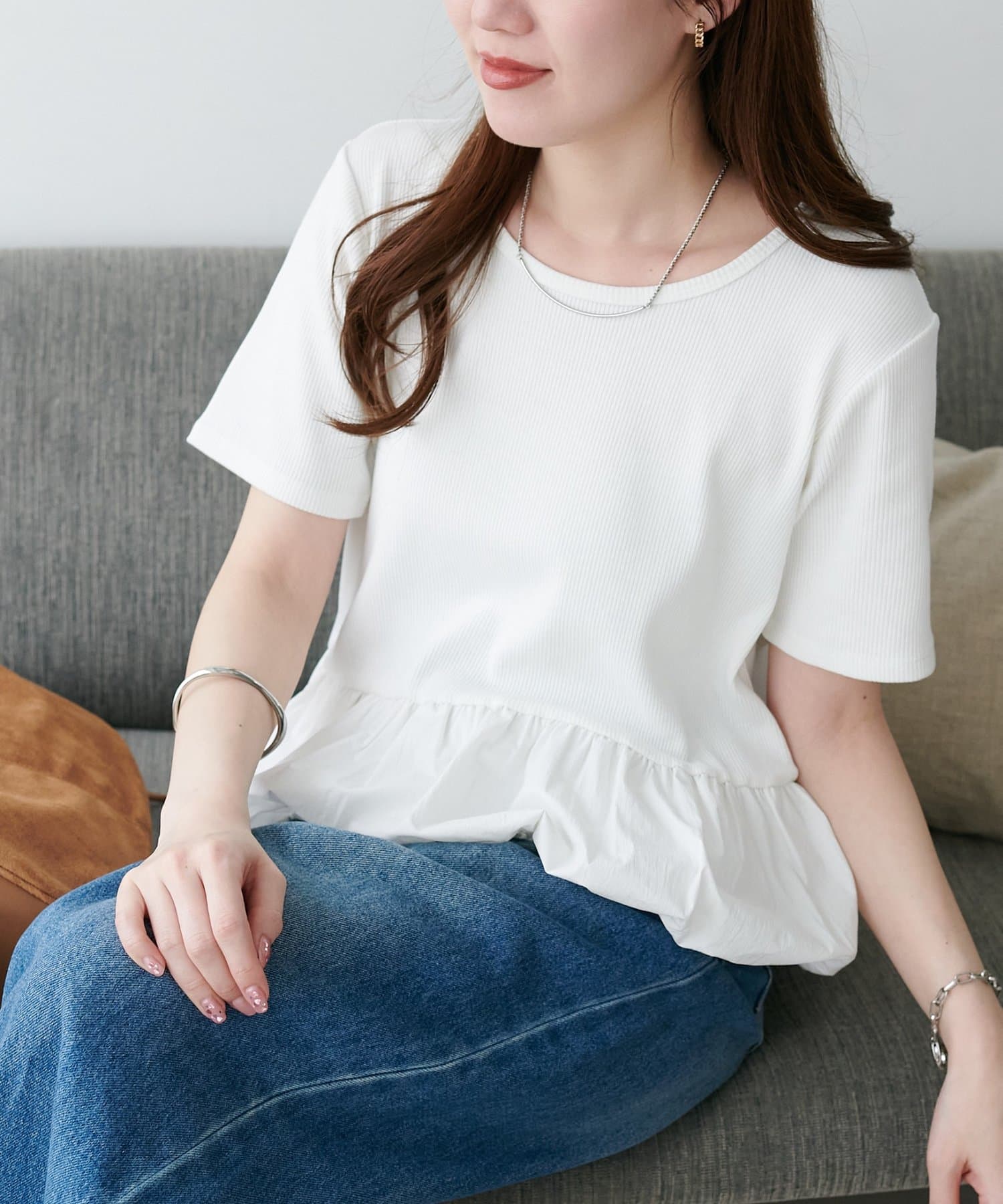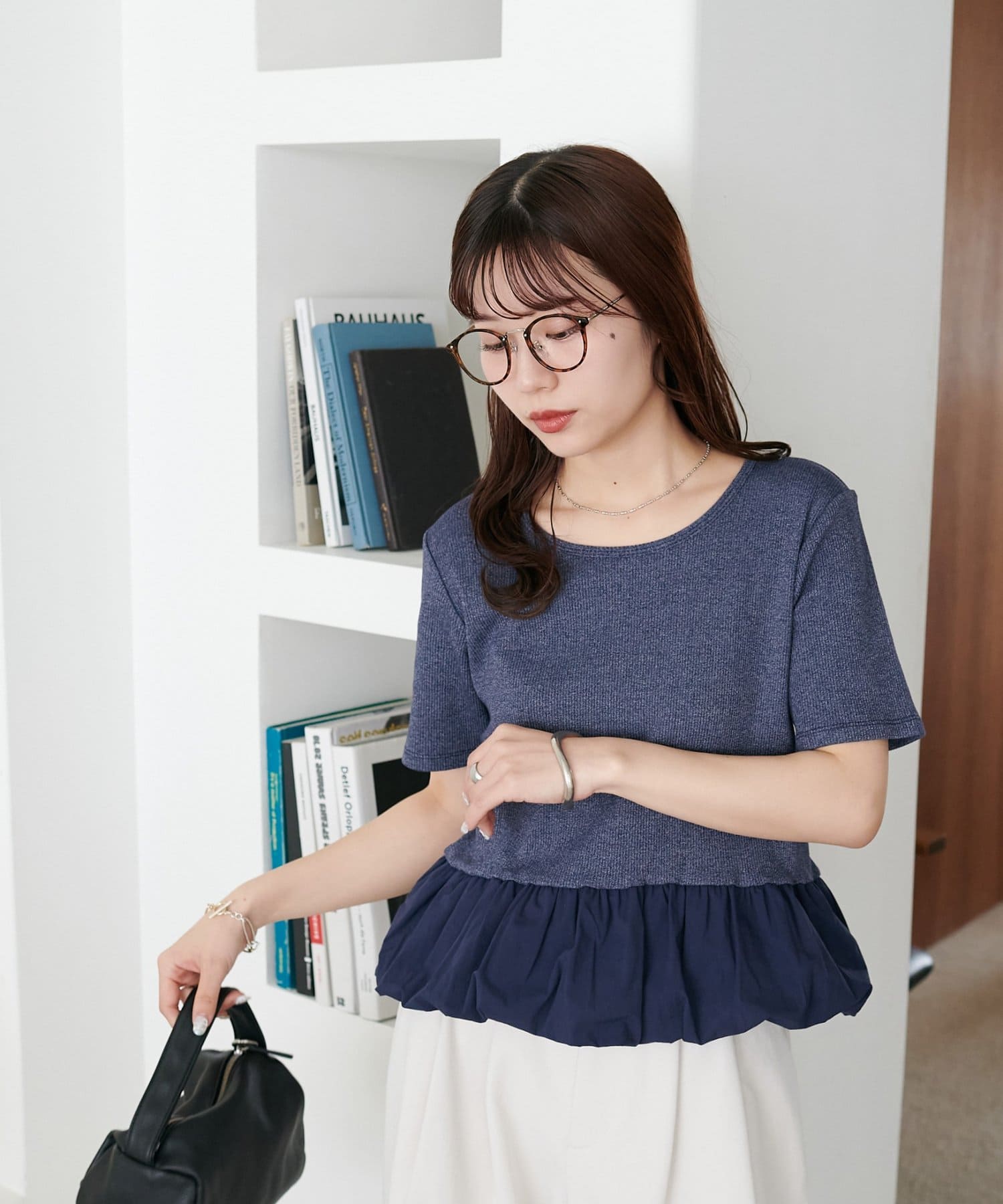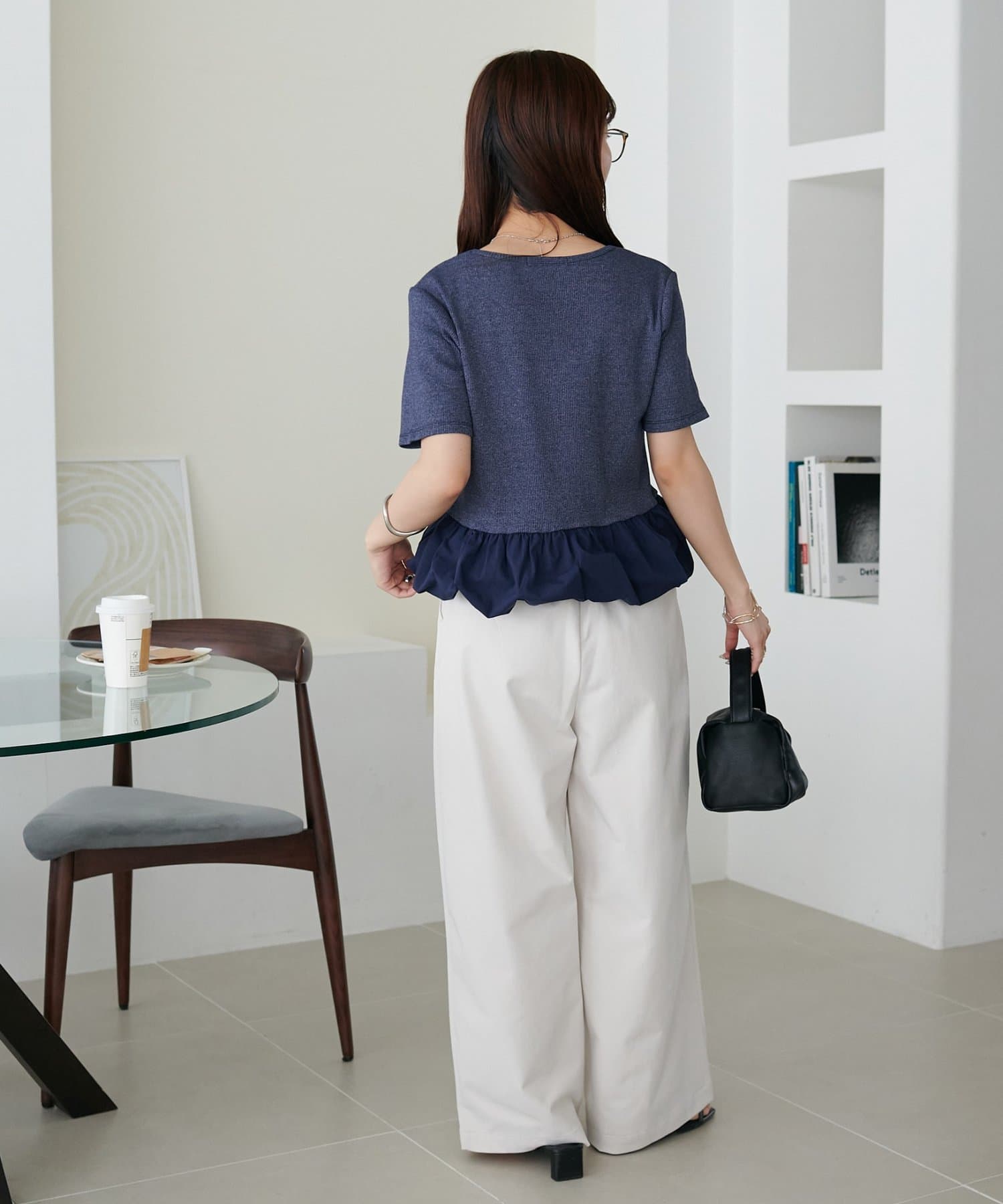 155cmスタッフ:着丈がコンパクトなので、アウトスタイルでもバランスが取りやすくスタイルアップして見えます。ハイウエストのボトムスと合わせると、さらに脚長効果が期待でき、小柄な方にぴったりの一着です。ふんわりした裾が腰回りをカバーしてくれるのも嬉しいポイント。