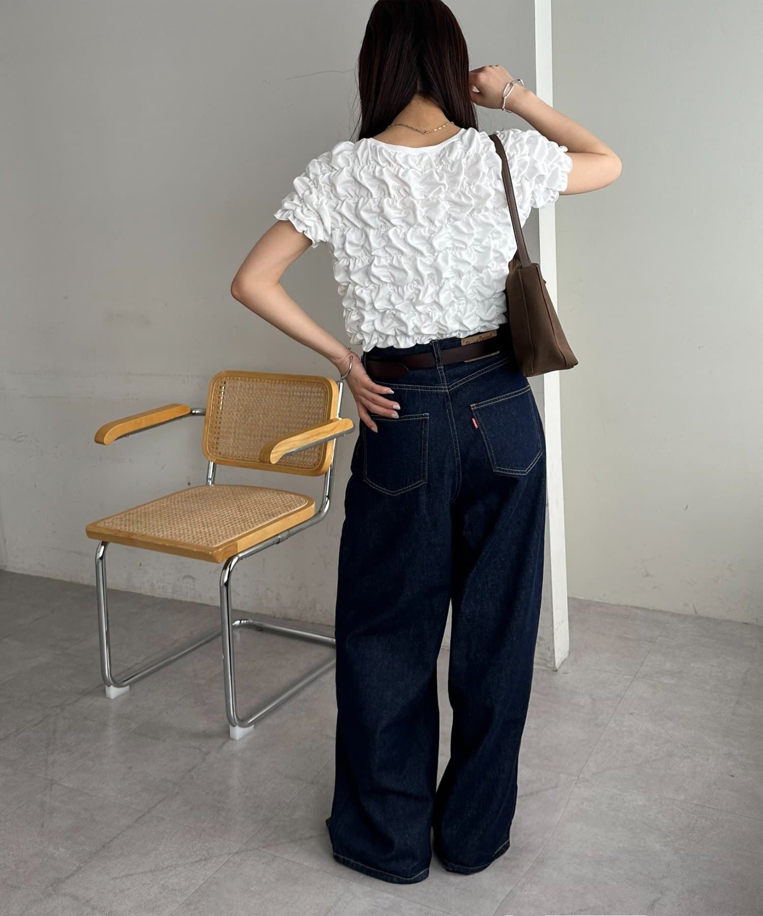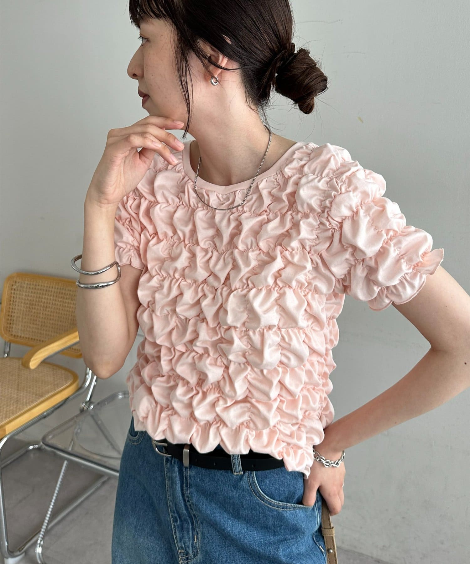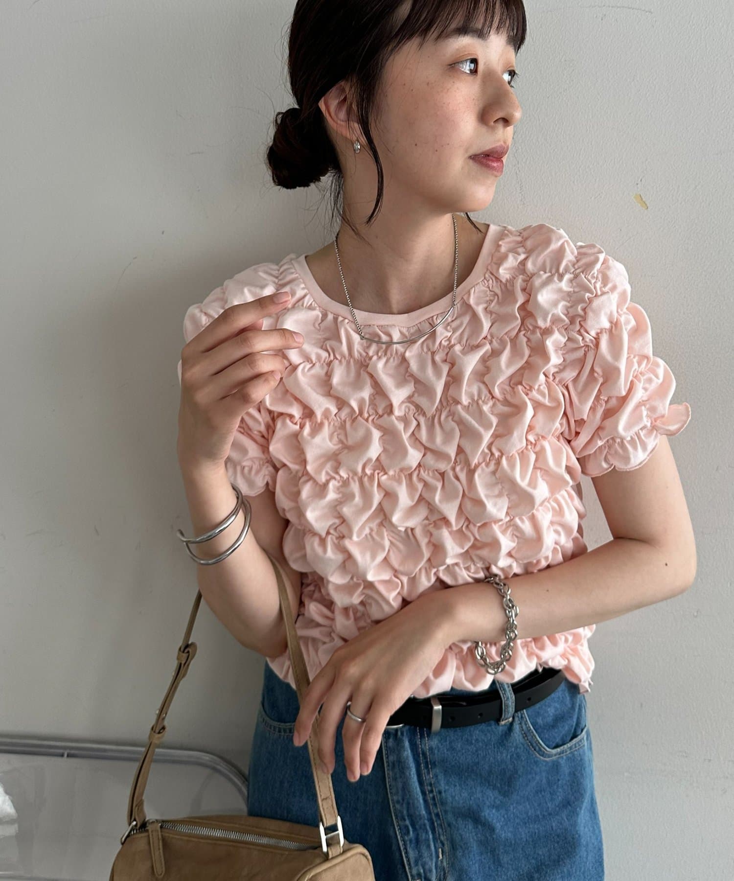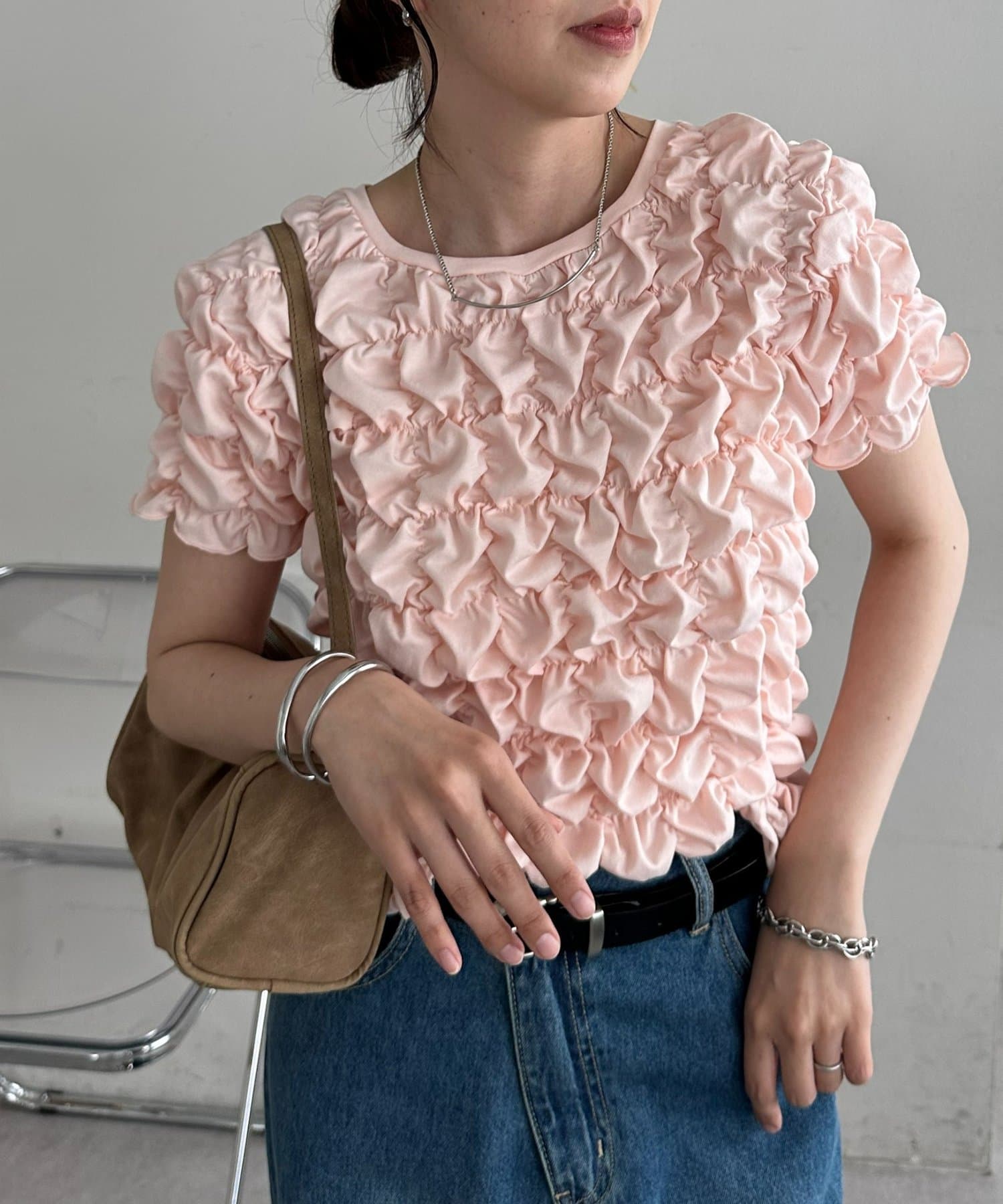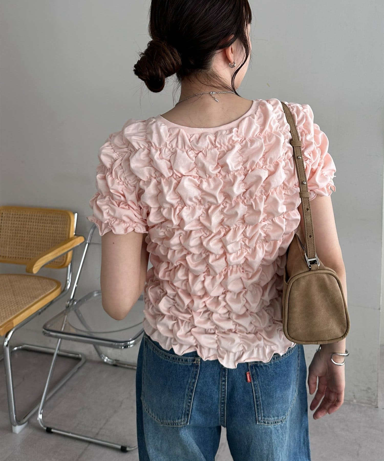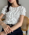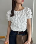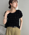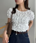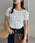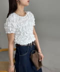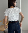 158cmスタッフ:立体的なデザインが華やかなので、シンプルなデニムやスカートに合わせるだけでコーディネートが完成します◎袖のふんわり感が肩周りを華奢に見せてくれる効果も♪