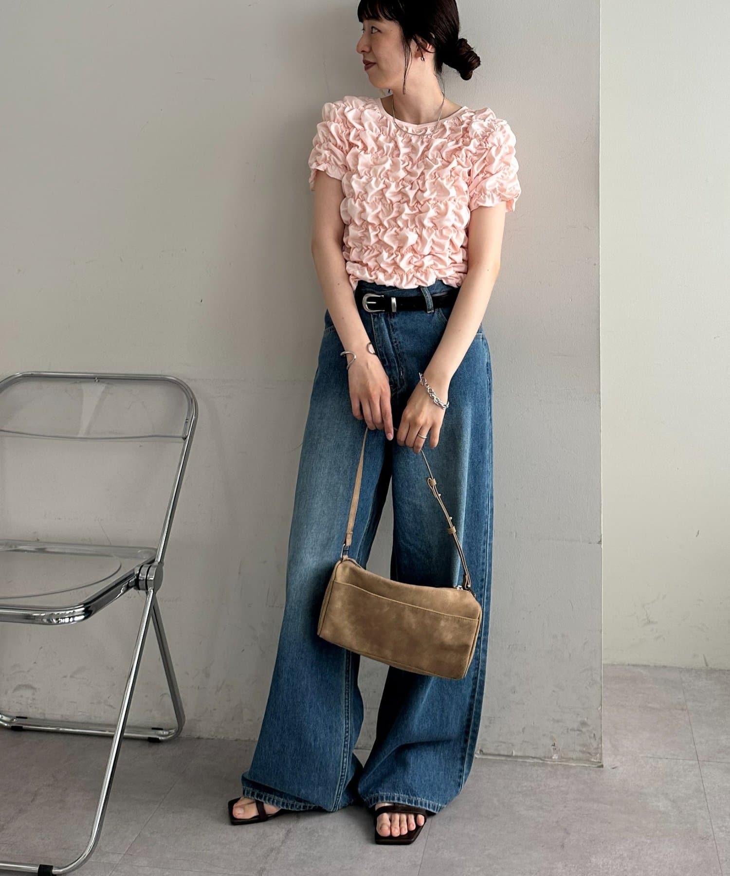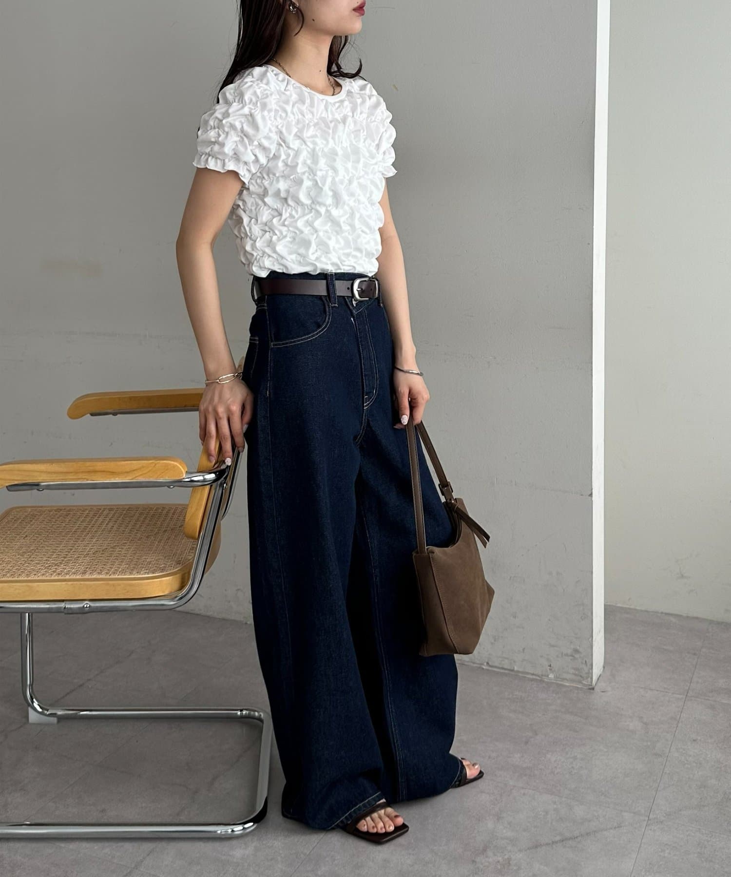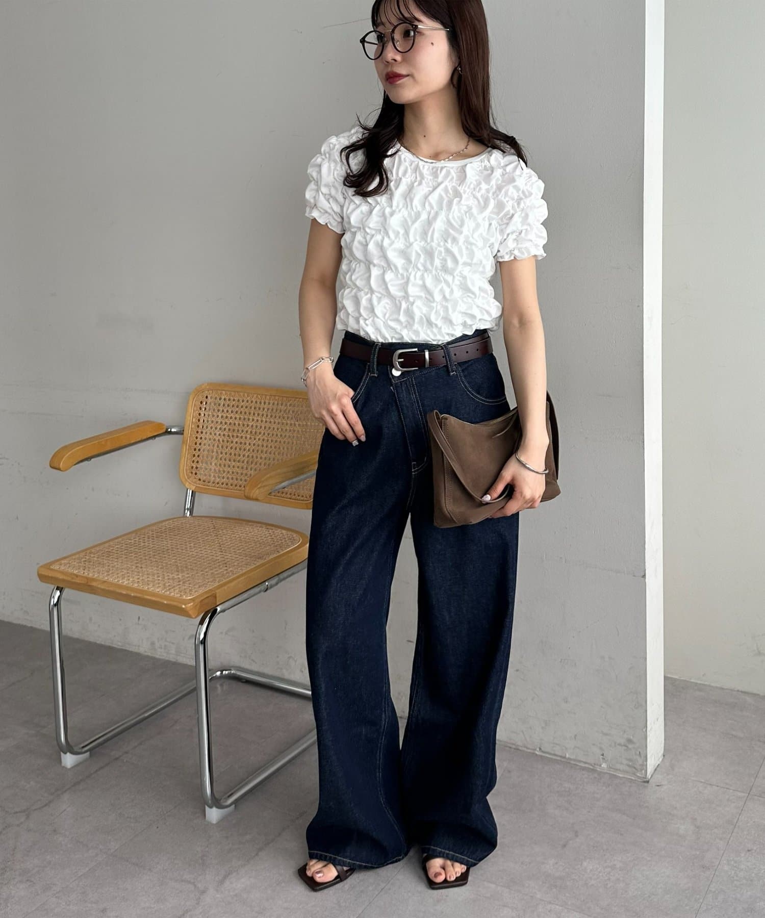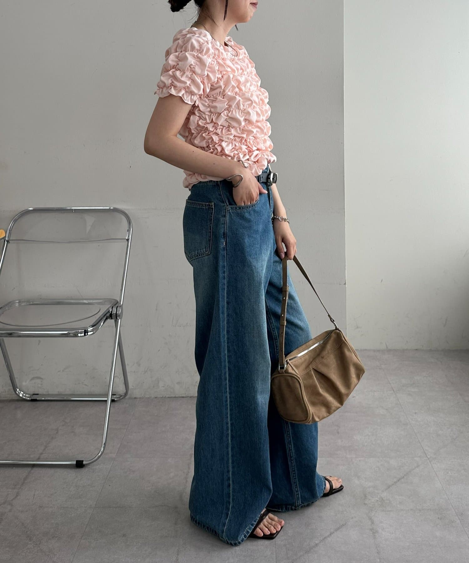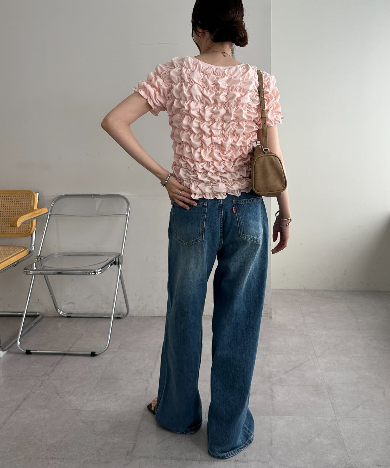 158cmスタッフ:立体的なデザインが華やかなので、シンプルなデニムやスカートに合わせるだけでコーディネートが完成します◎袖のふんわり感が肩周りを華奢に見せてくれる効果も♪