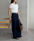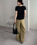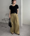 ・きれいめなスラックスやテーパードパンツを合わせれば、甘さを抑えた大人フェミニンな着こなしが完成◎