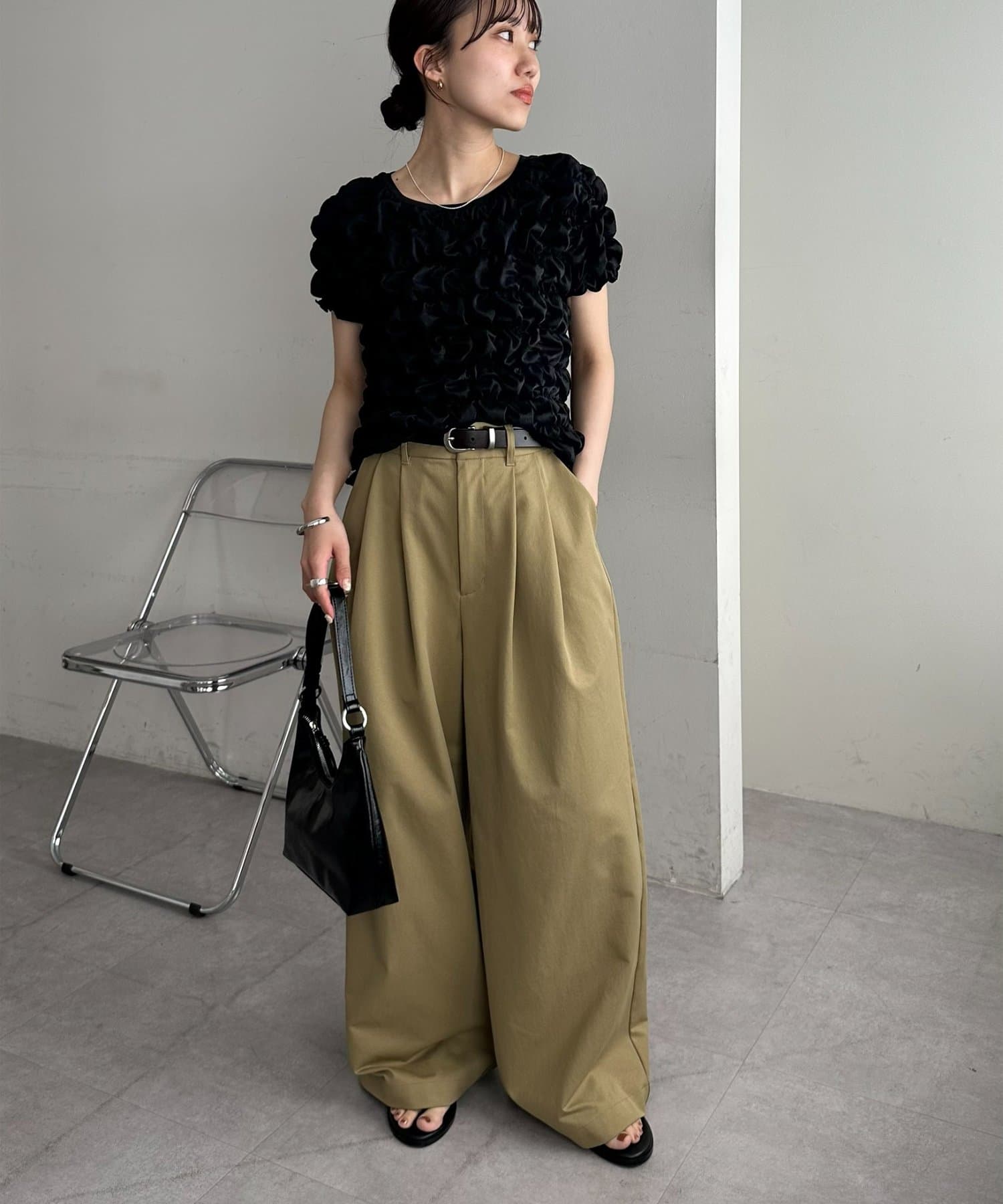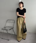 163cmスタッフ:コンパクトなサイズ感ですが、伸縮性があるため、高身長の私でもストレスなく着用できました◎フィット感があるので、ワイドパンツやフレアスカートなど、ボリュームのあるボトムスとの相性が抜群です!