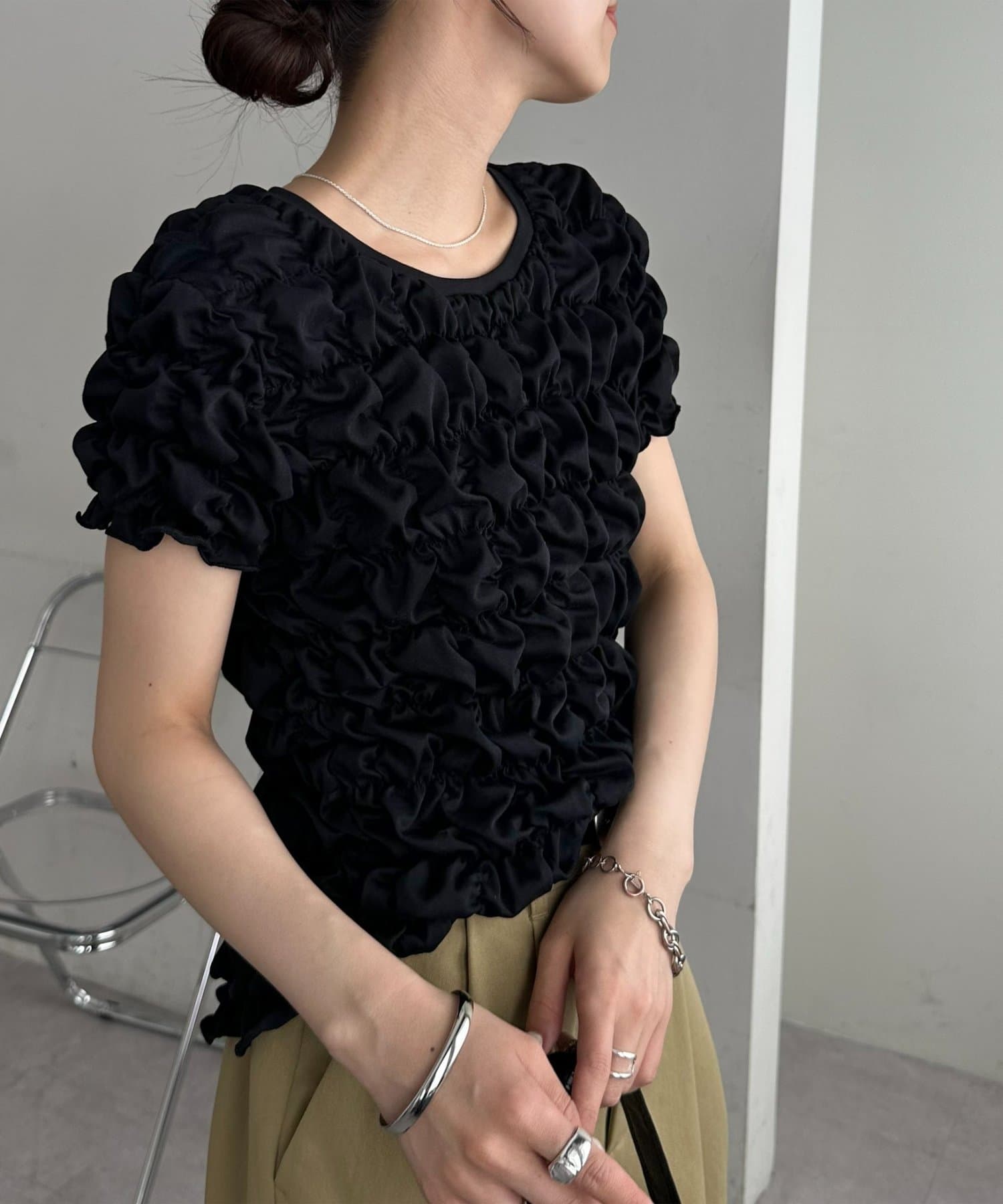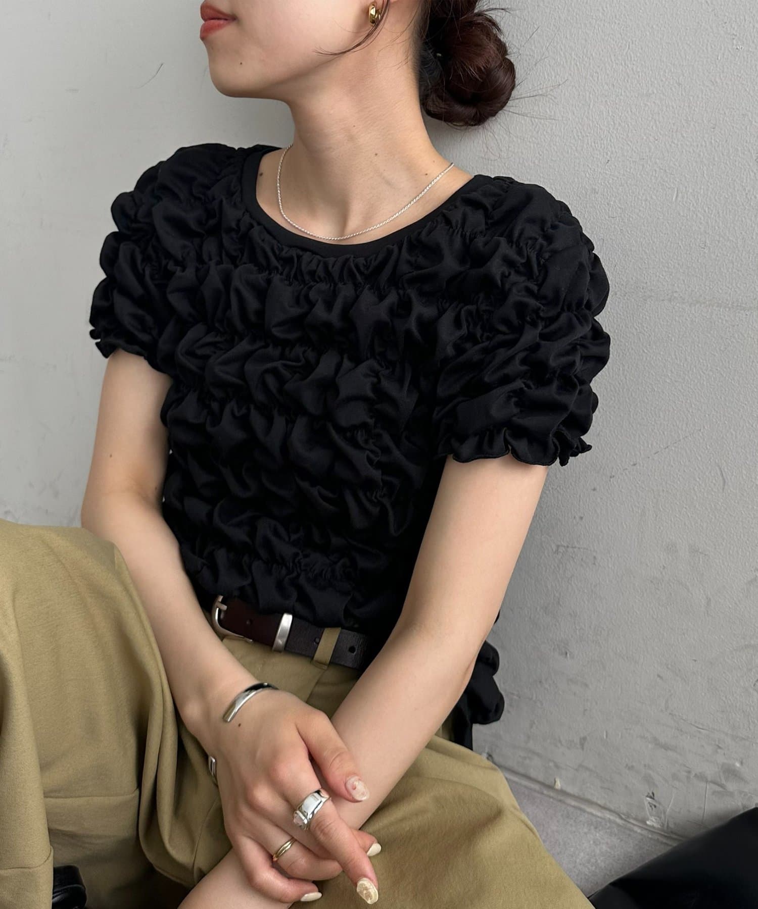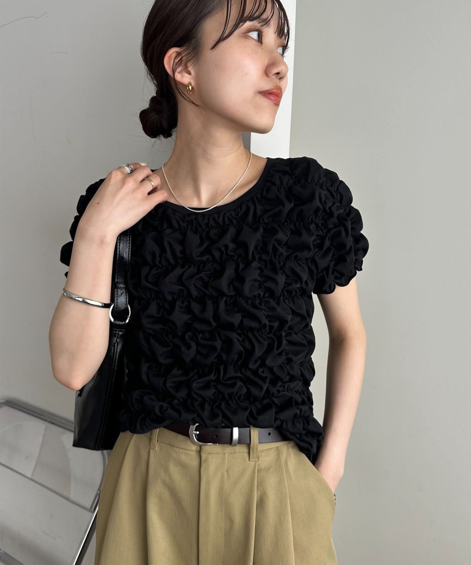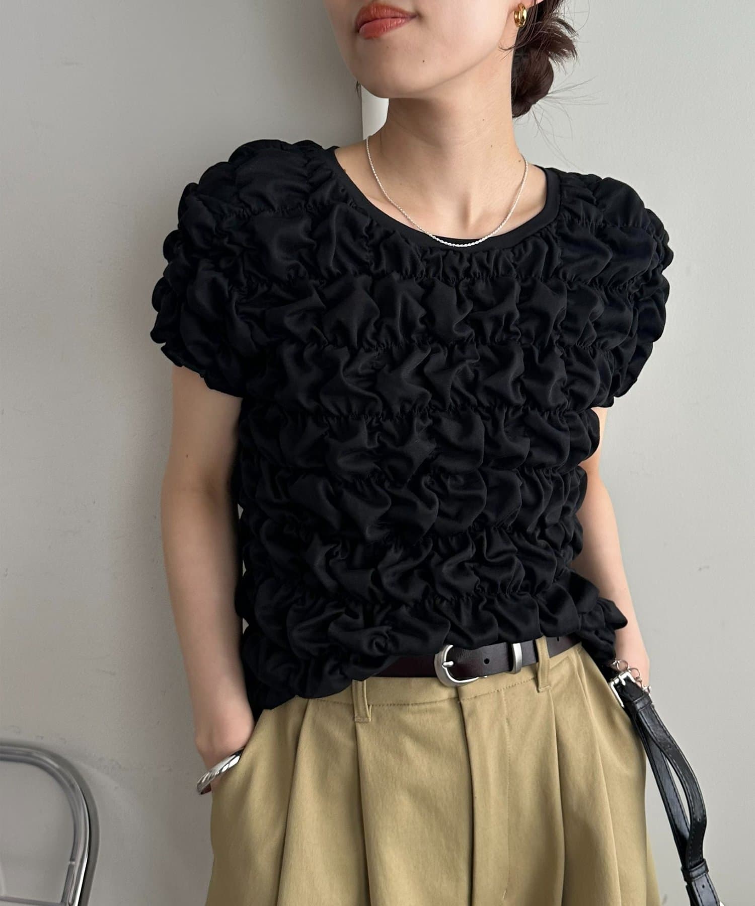 149cmスタッフ:伸縮性があるので、小柄な私でも体に程よくフィットし、すっきりと着こなせました◎ぽこぽことしたシャーリングが全身にあるので、着られている感が出ないのが嬉しいです♪