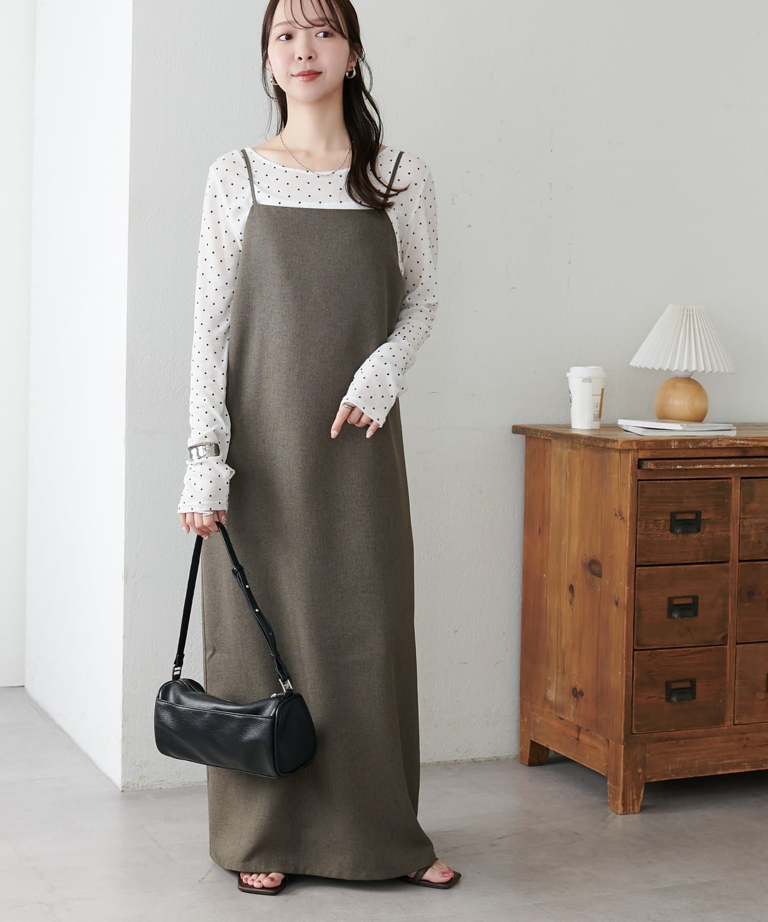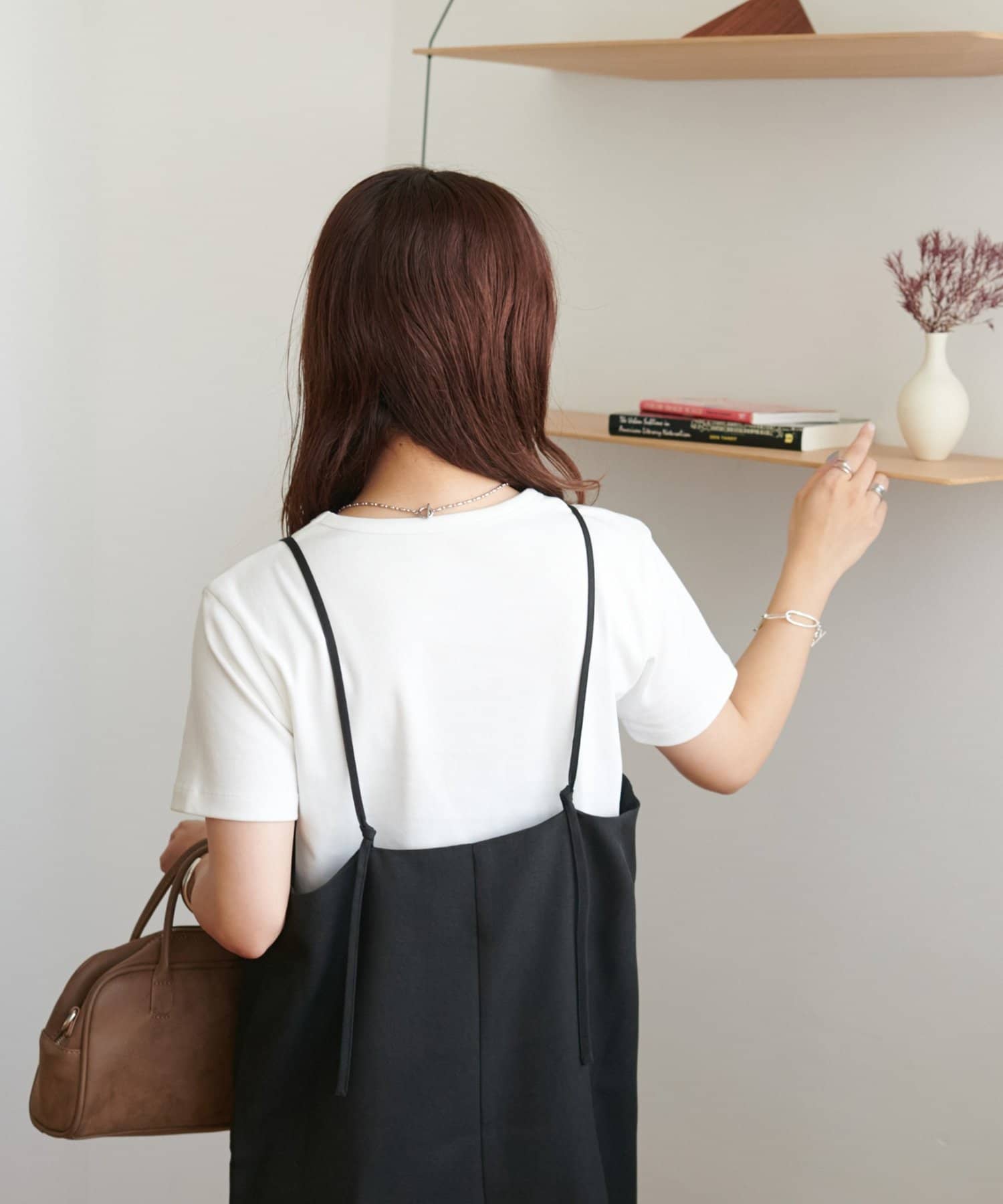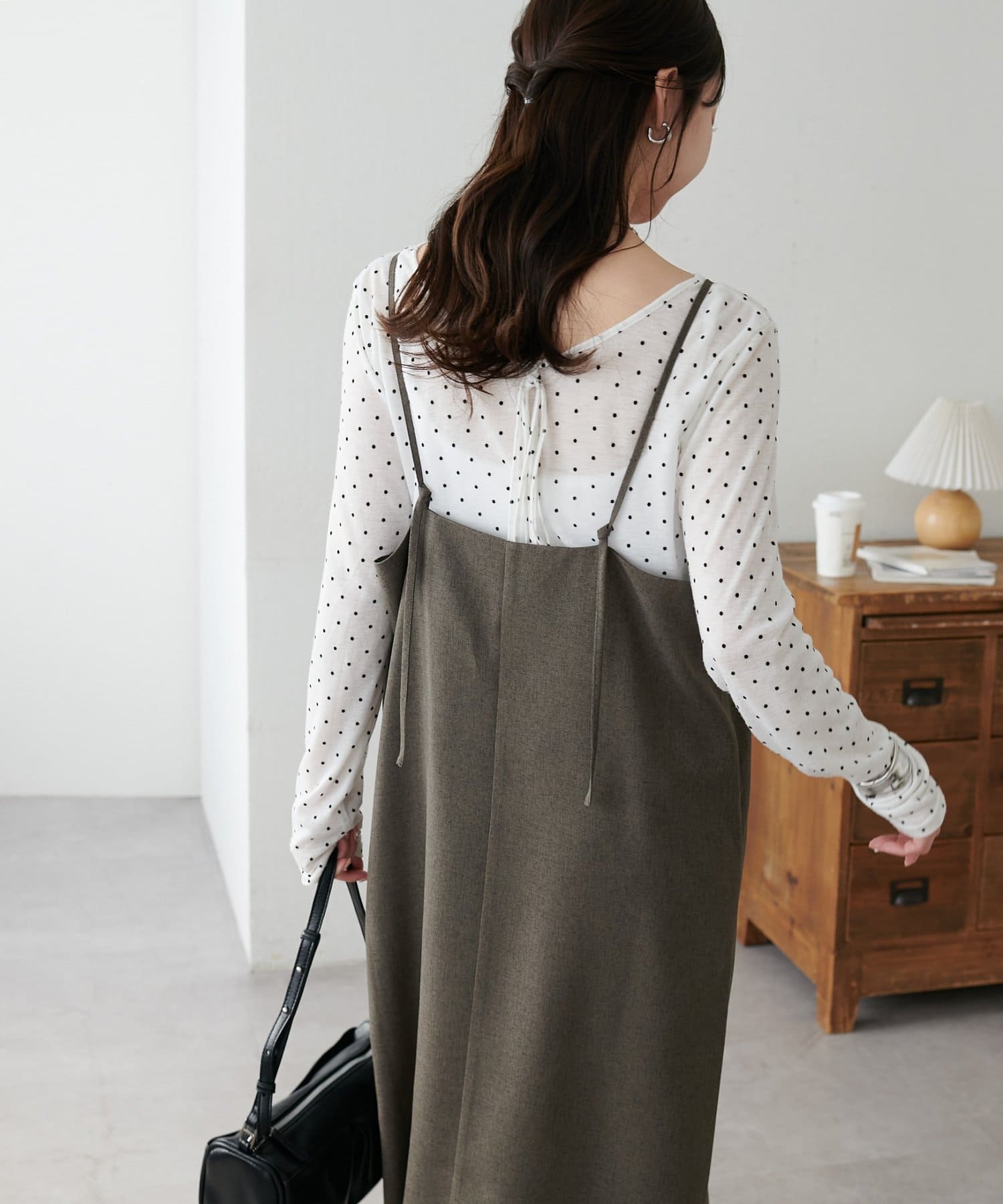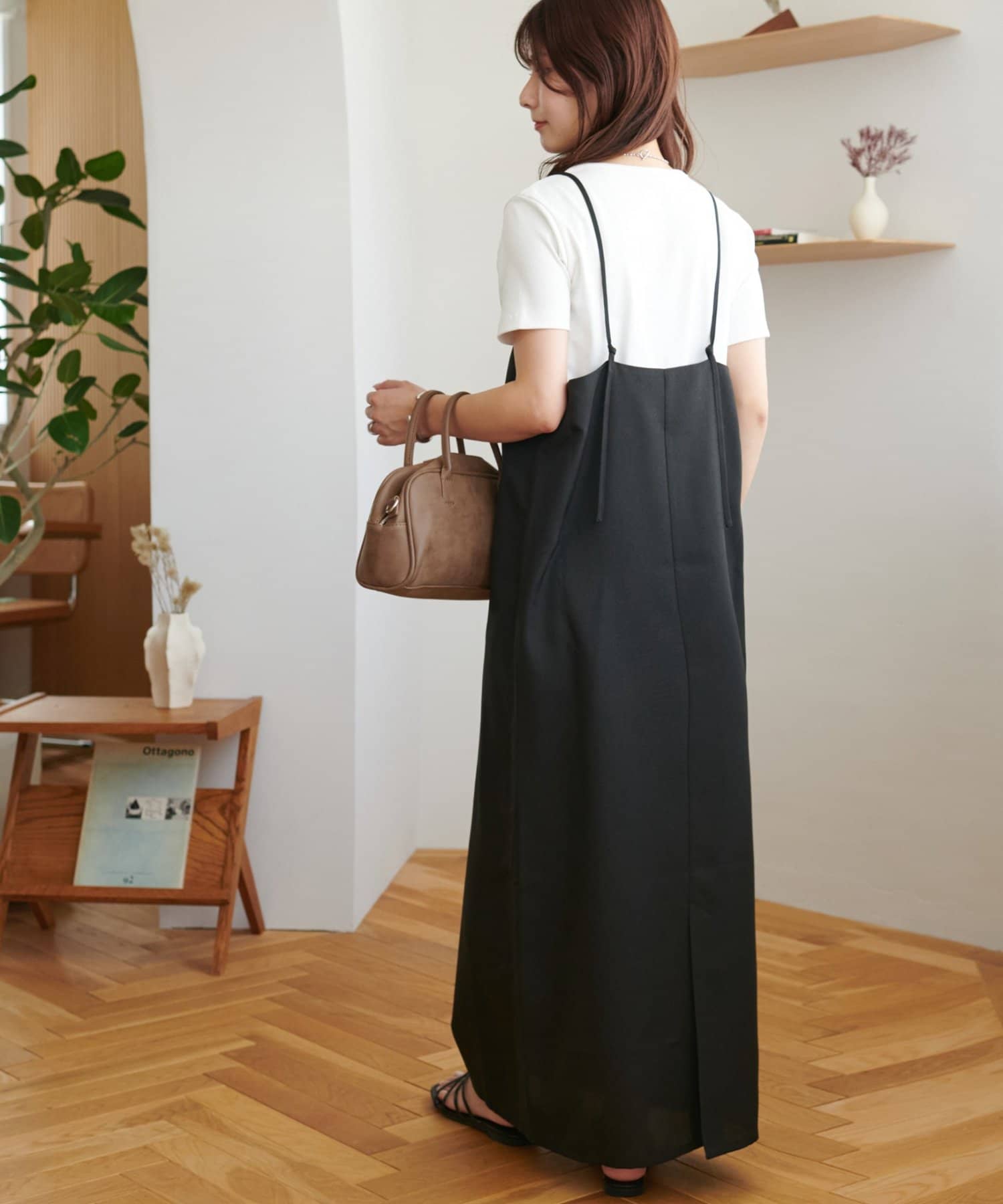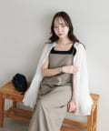 ・華奢なストラップとややスクエアなネックラインが上品な印象を与え、インナーとのレイヤードもバランスよく決まります!