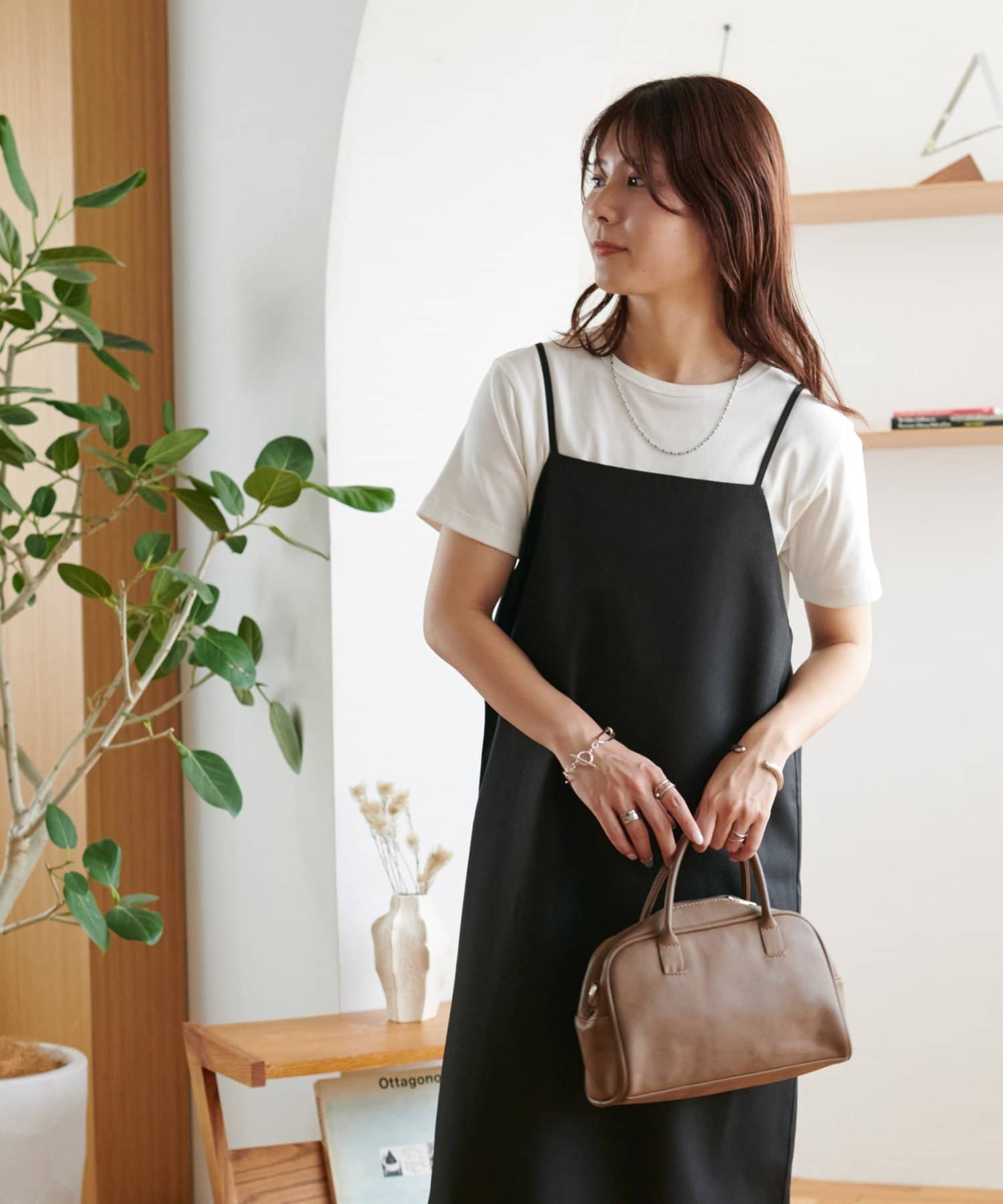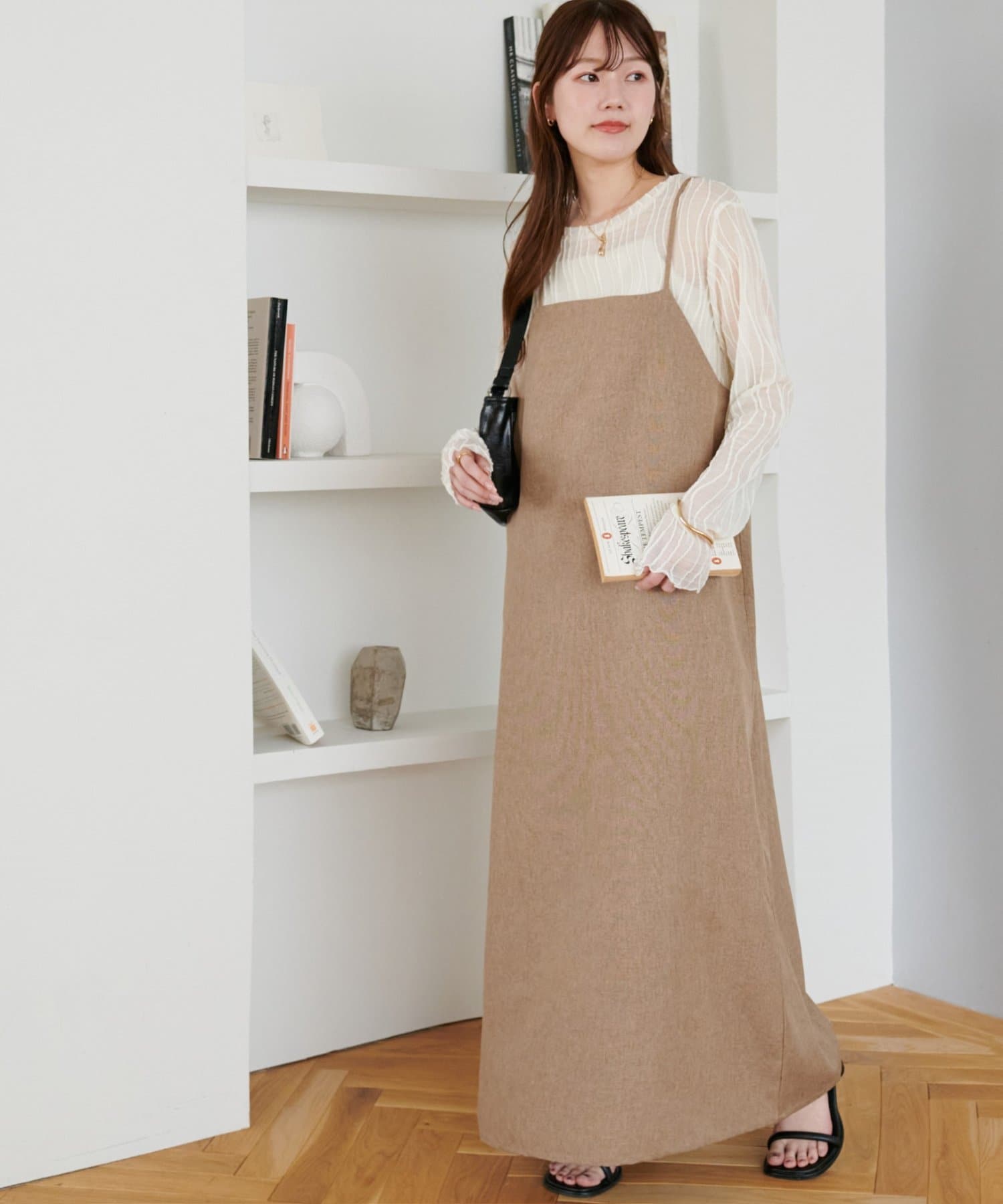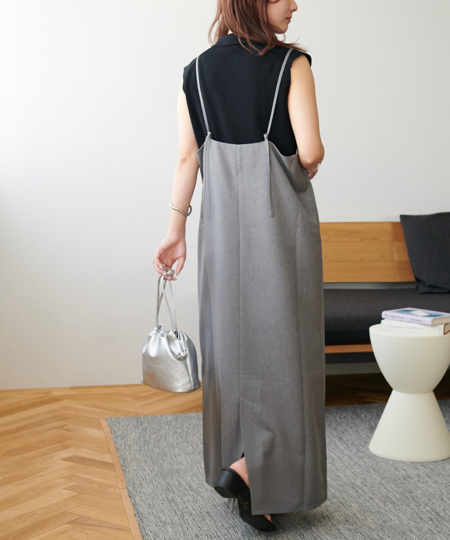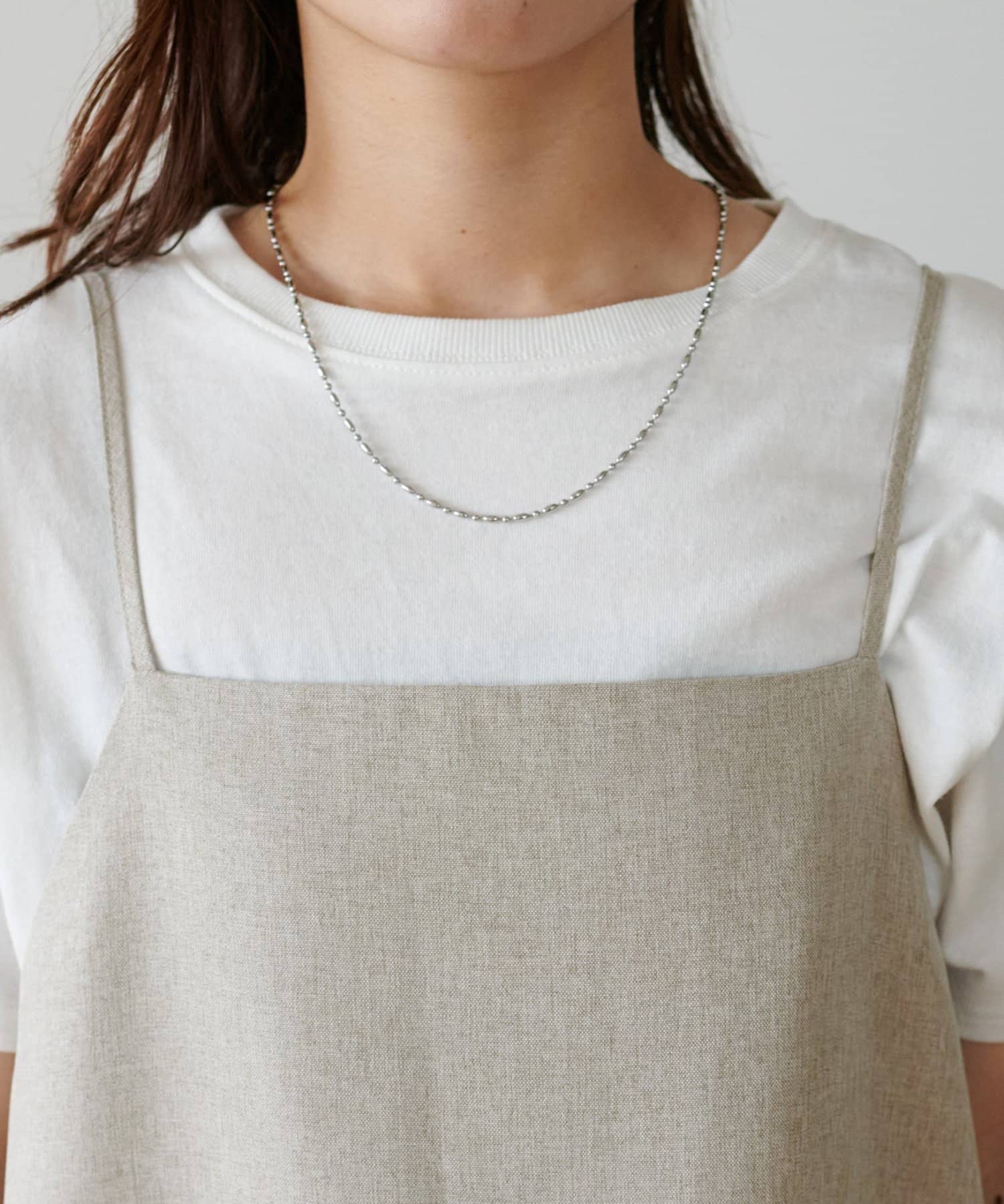 ・華奢なストラップとややスクエアなネックラインが上品な印象を与え、インナーとのレイヤードもバランスよく決まります!
