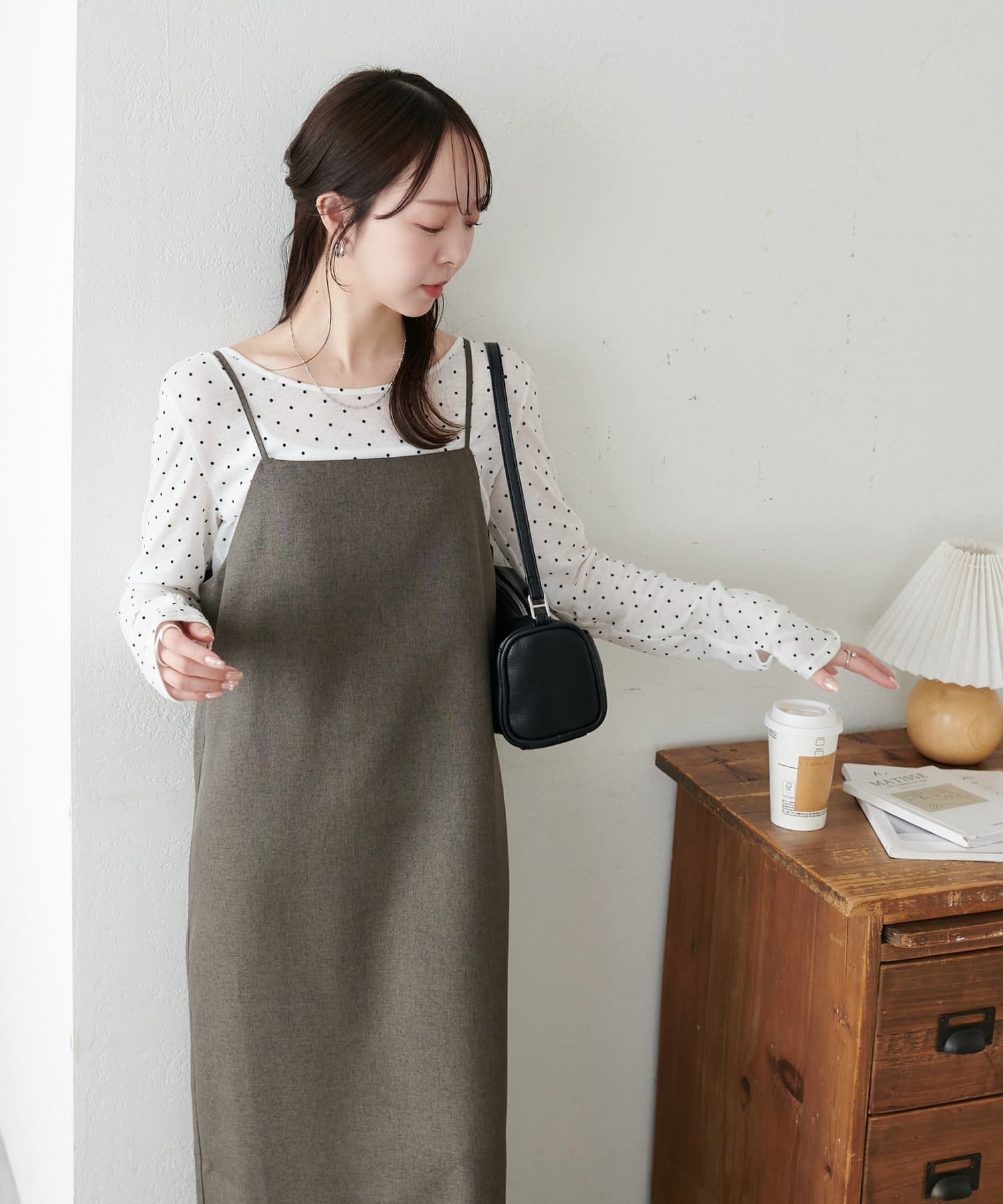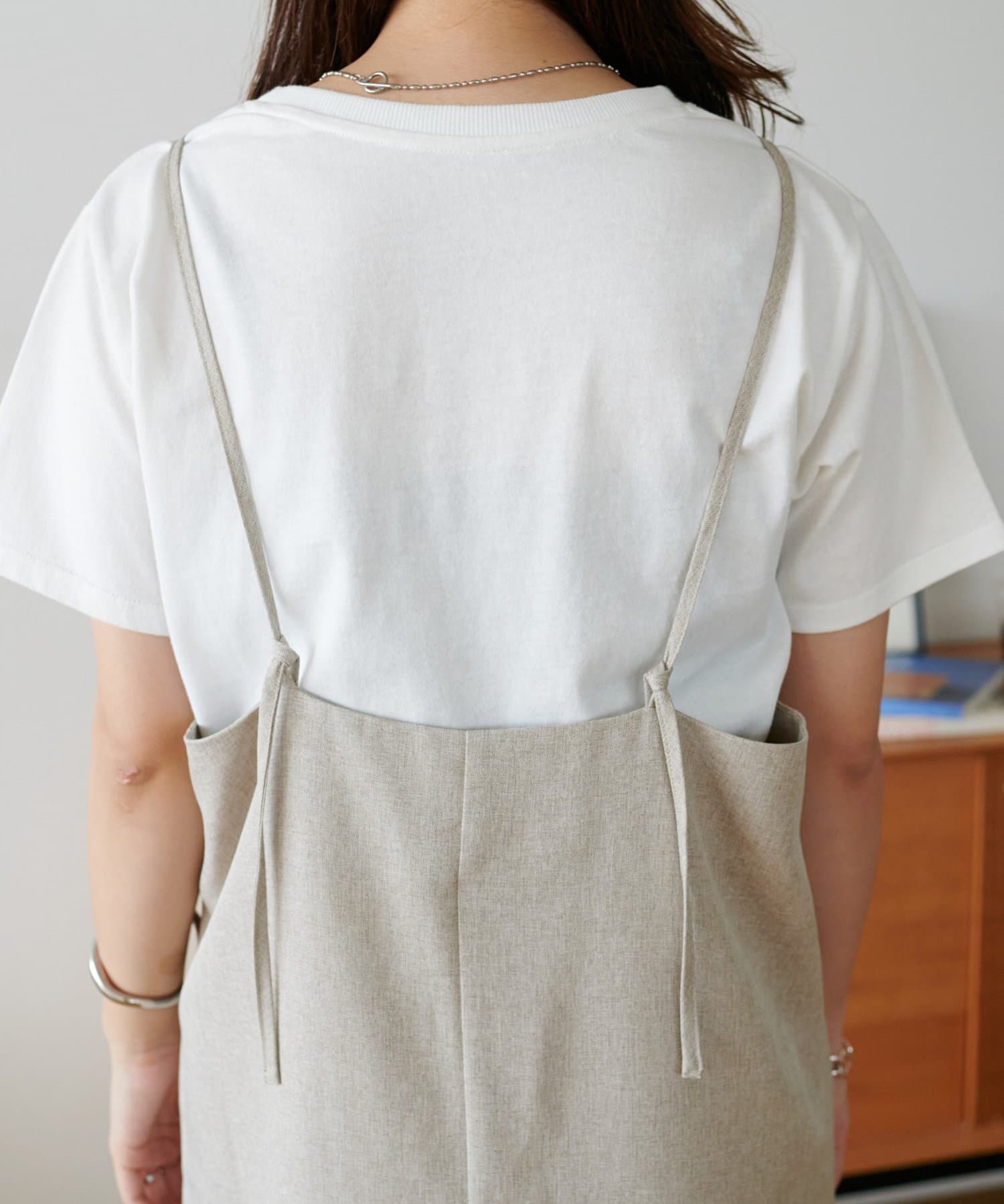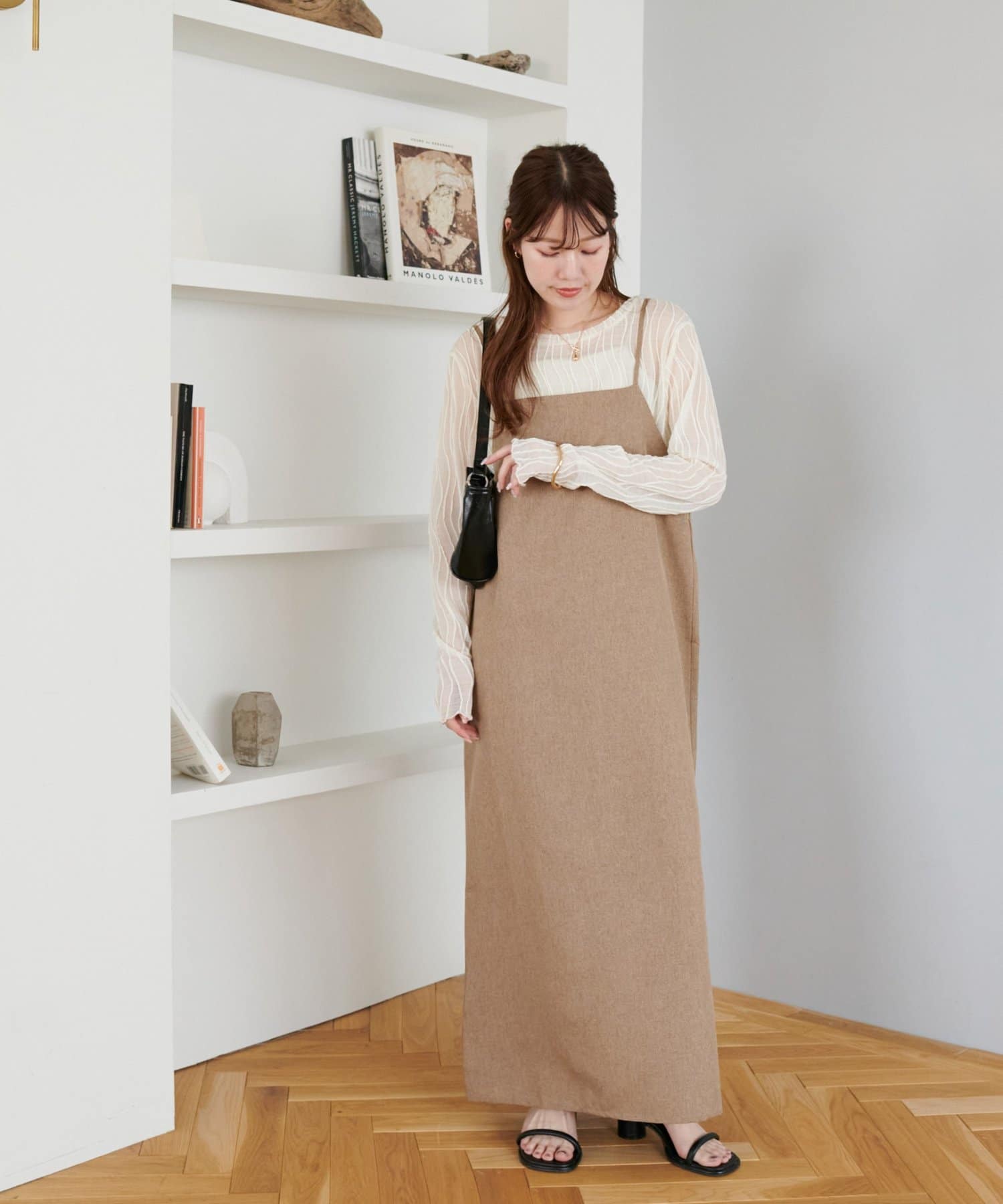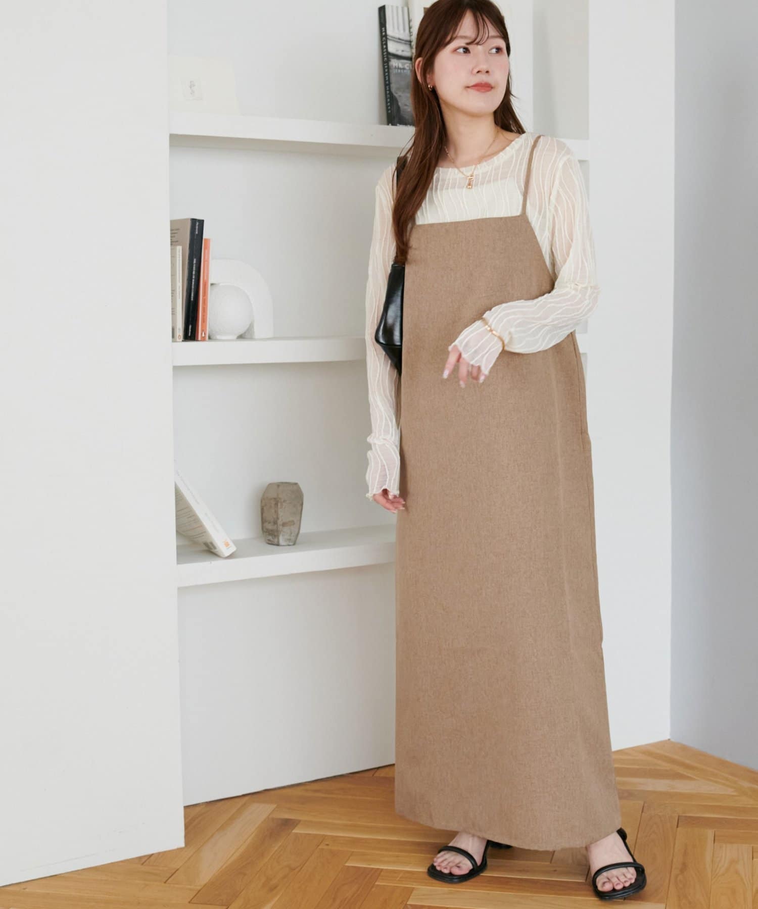 ・華奢なストラップとややスクエアなネックラインが上品な印象を与え、インナーとのレイヤードもバランスよく決まります!