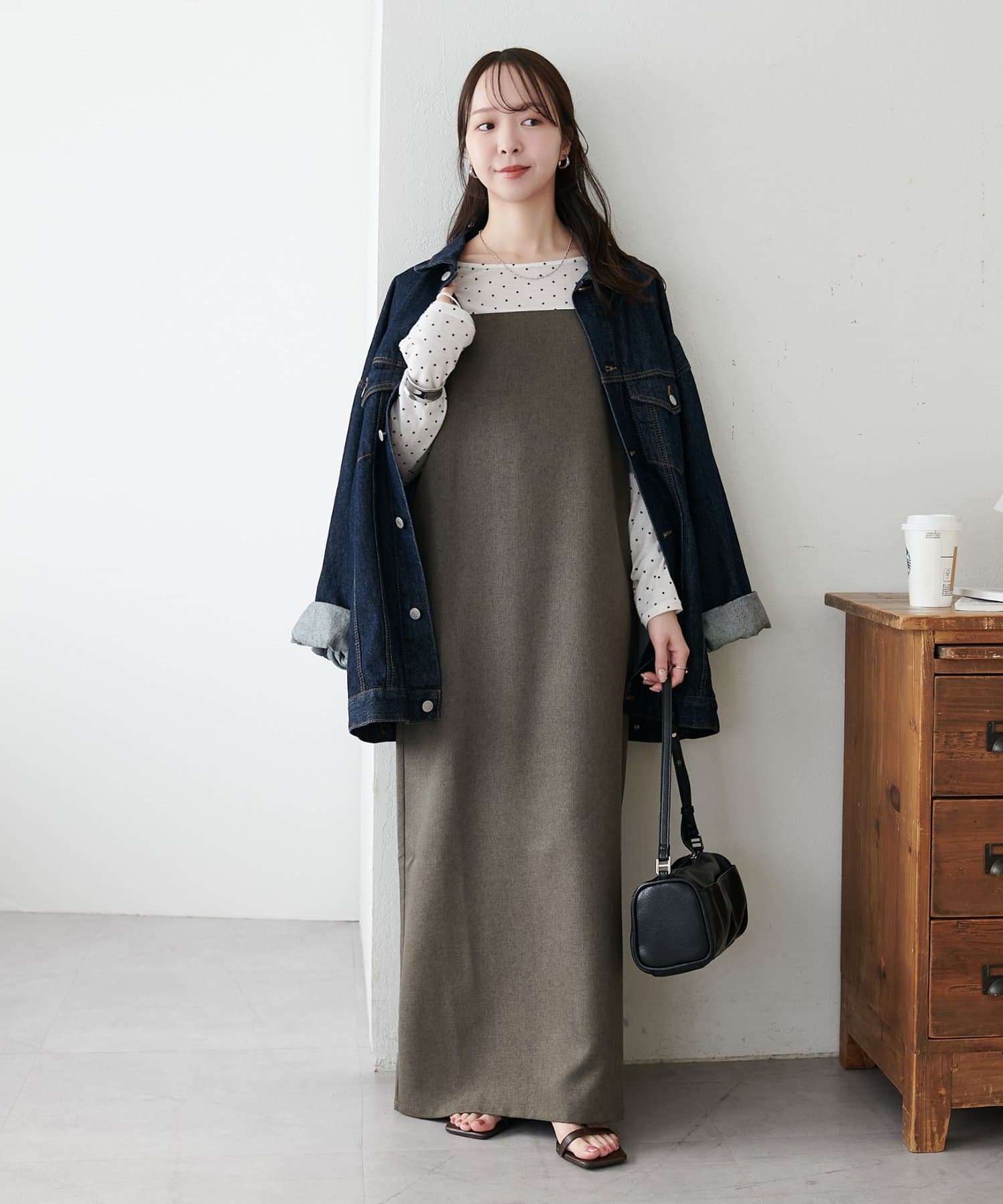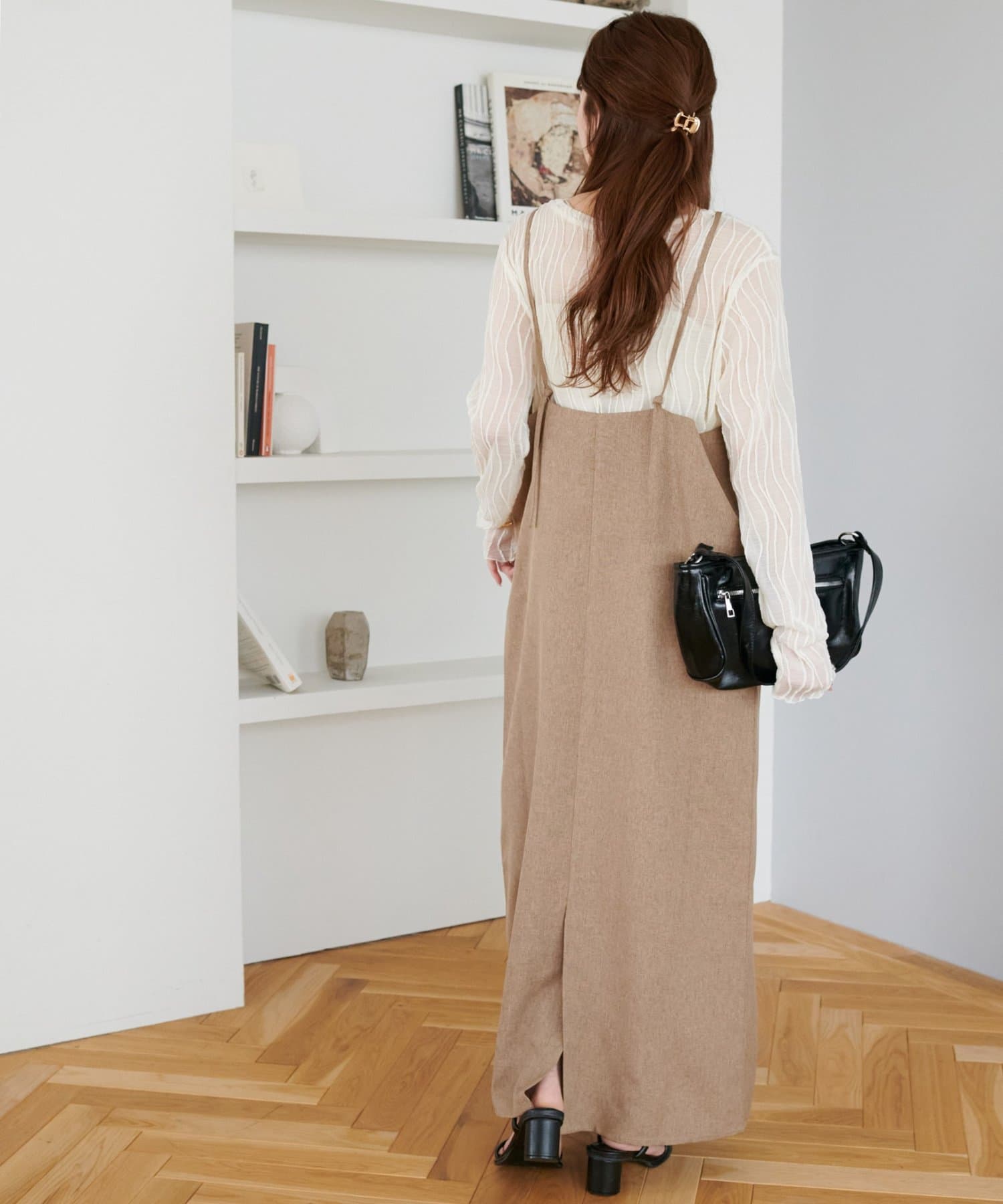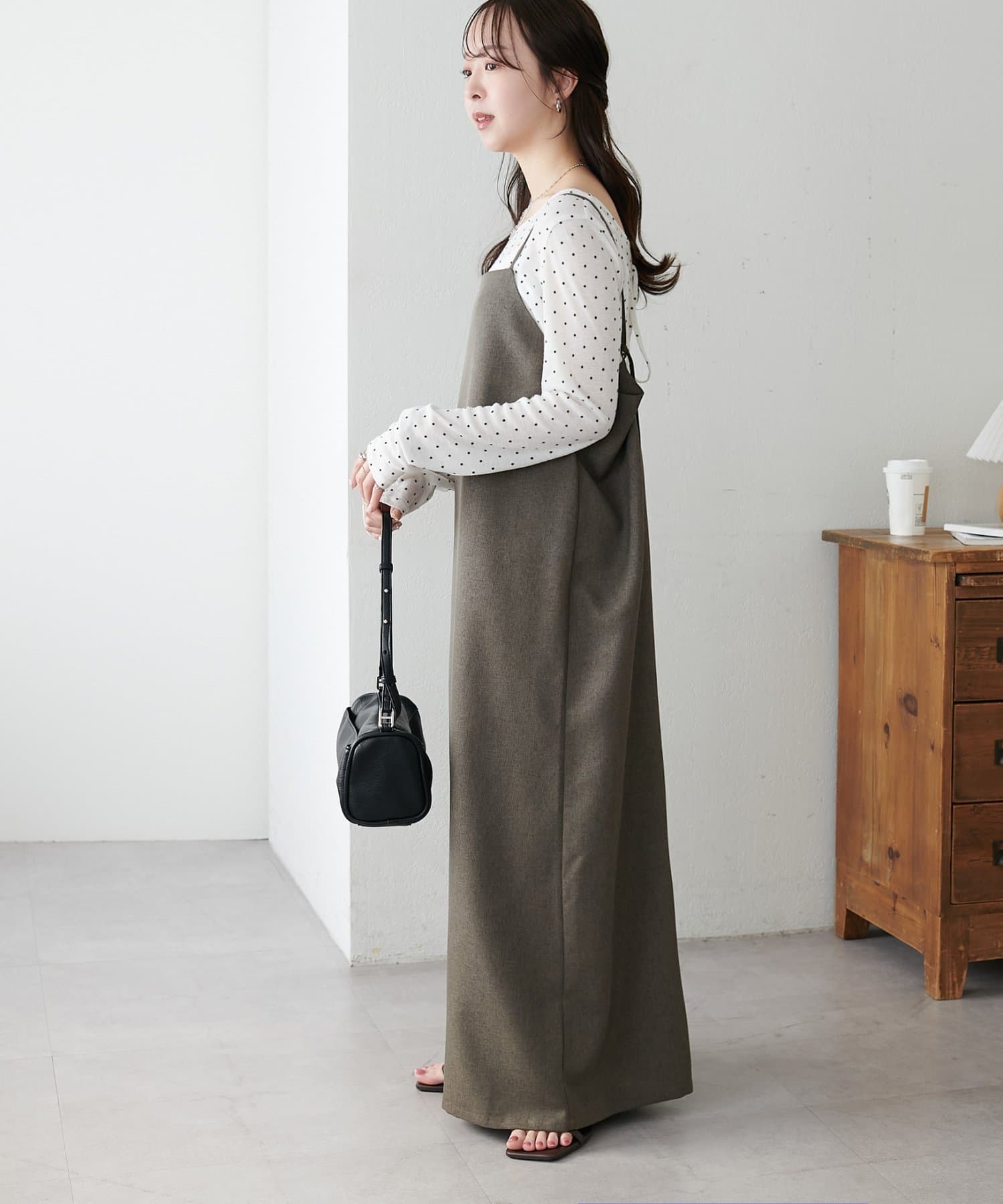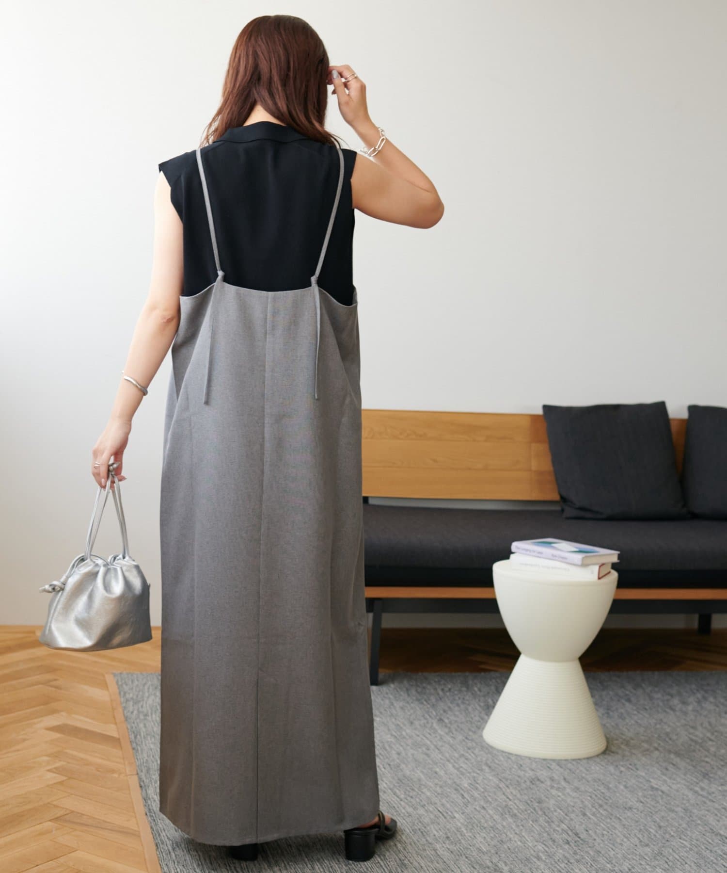 ・華奢なストラップとややスクエアなネックラインが上品な印象を与え、インナーとのレイヤードもバランスよく決まります!