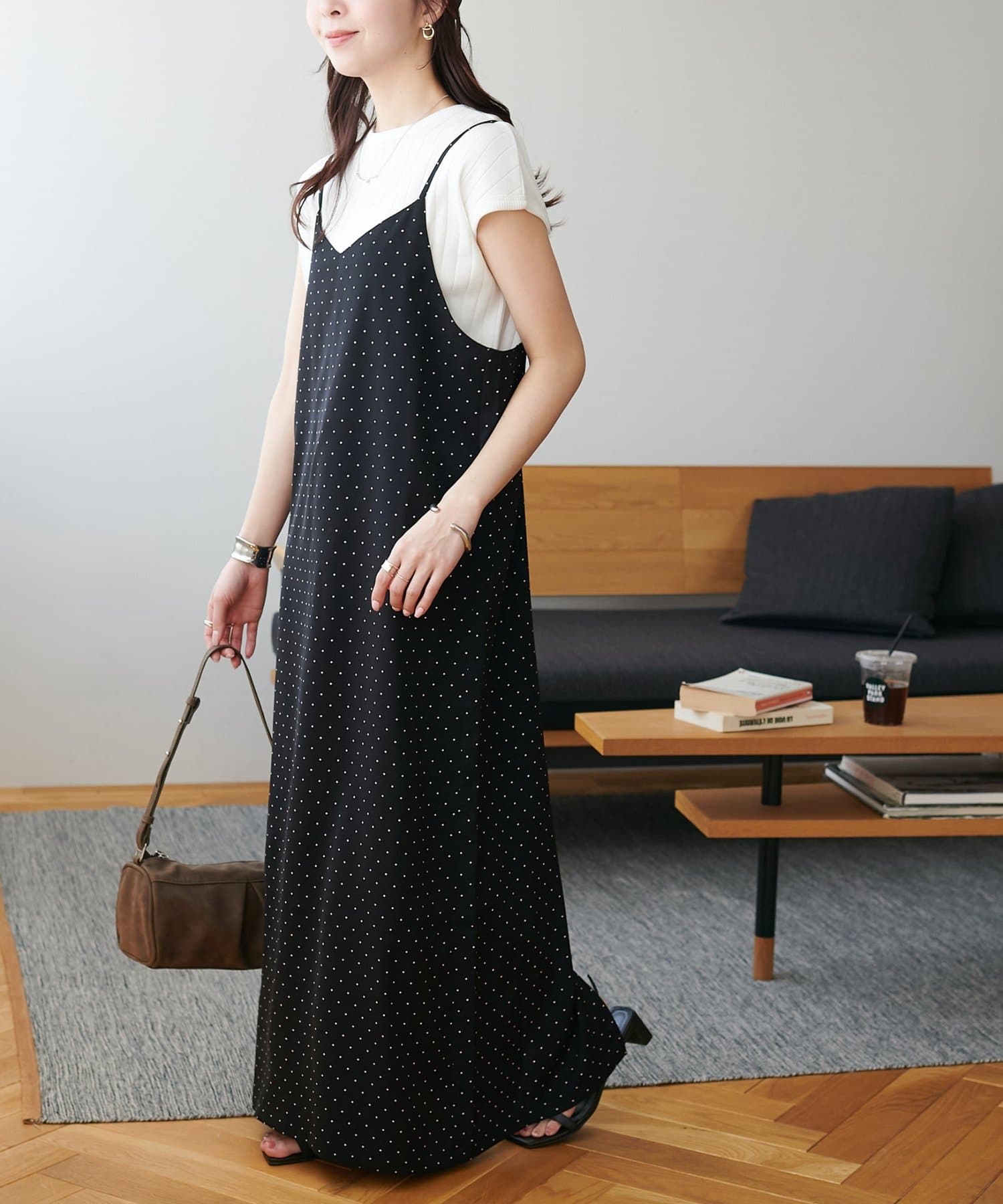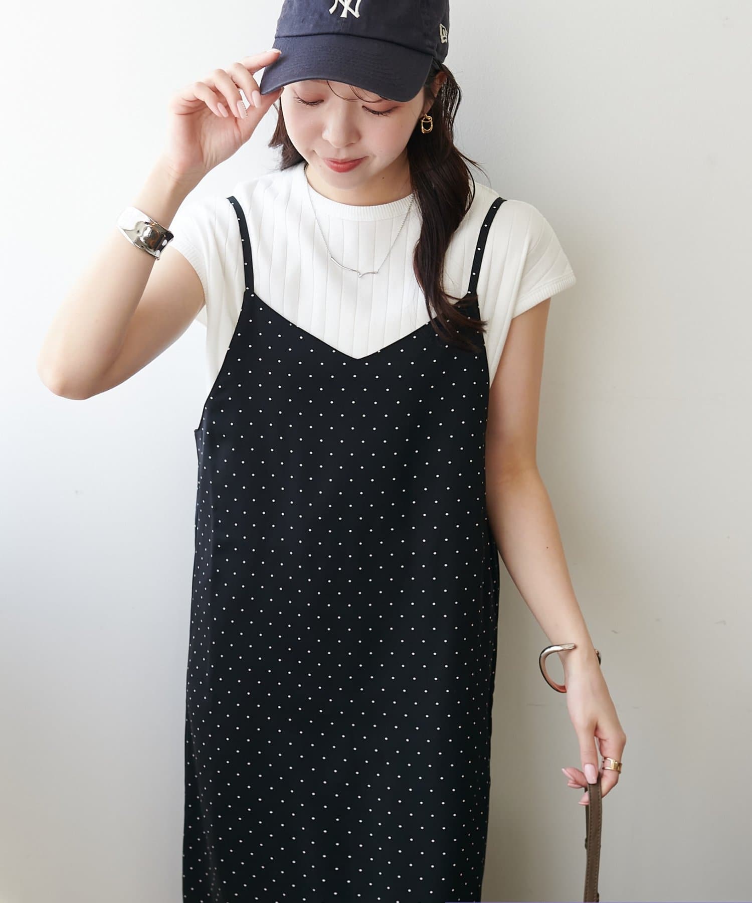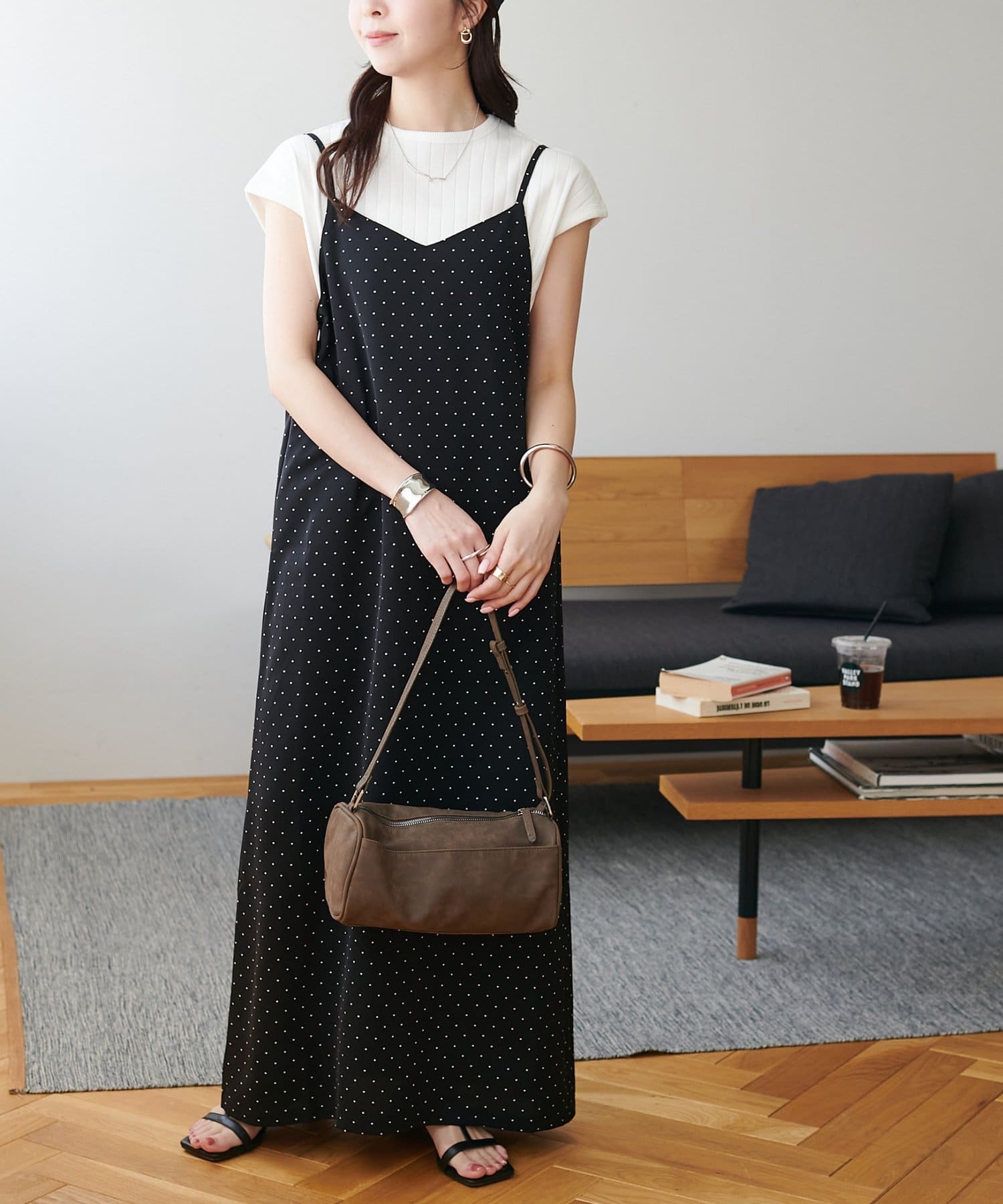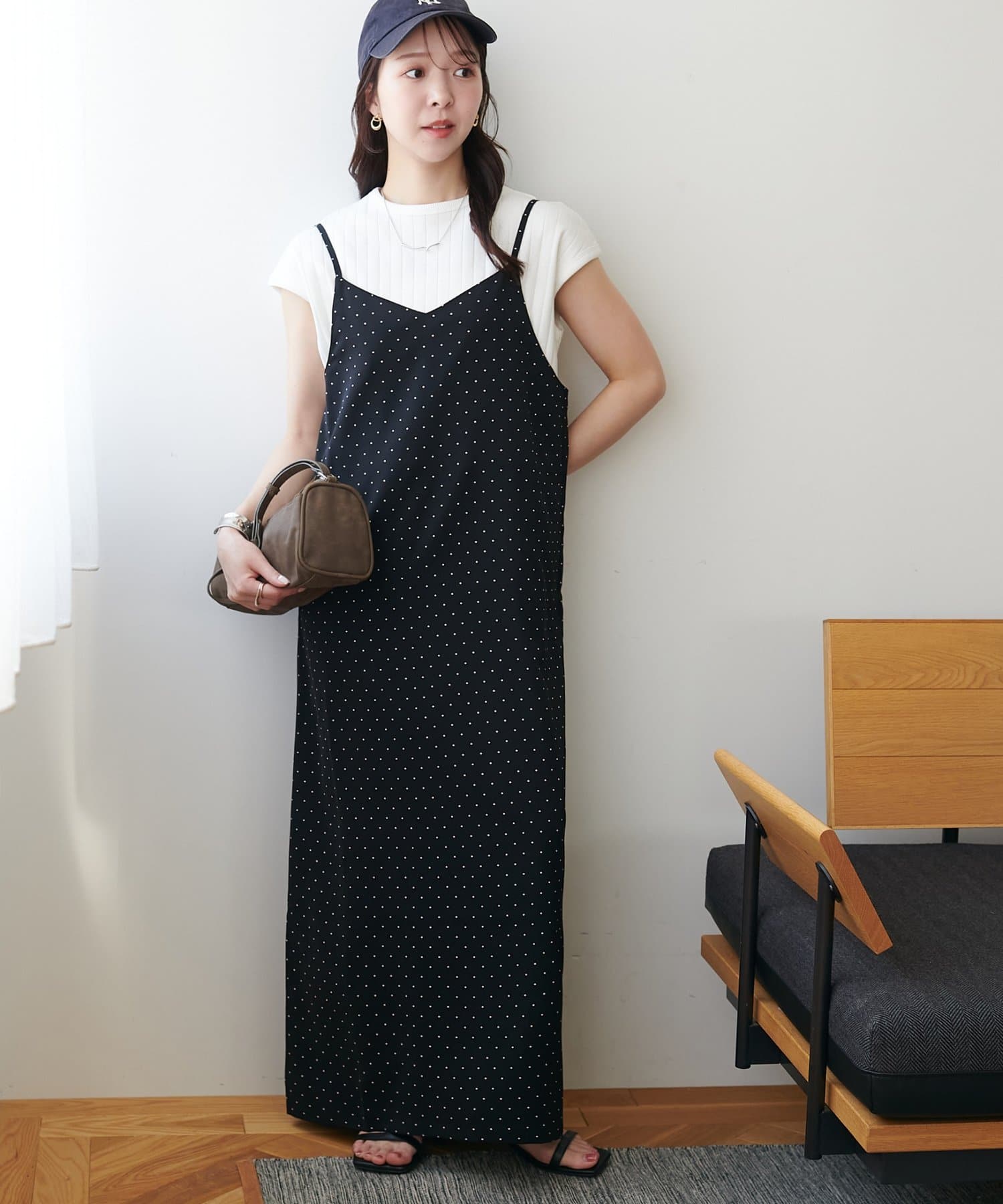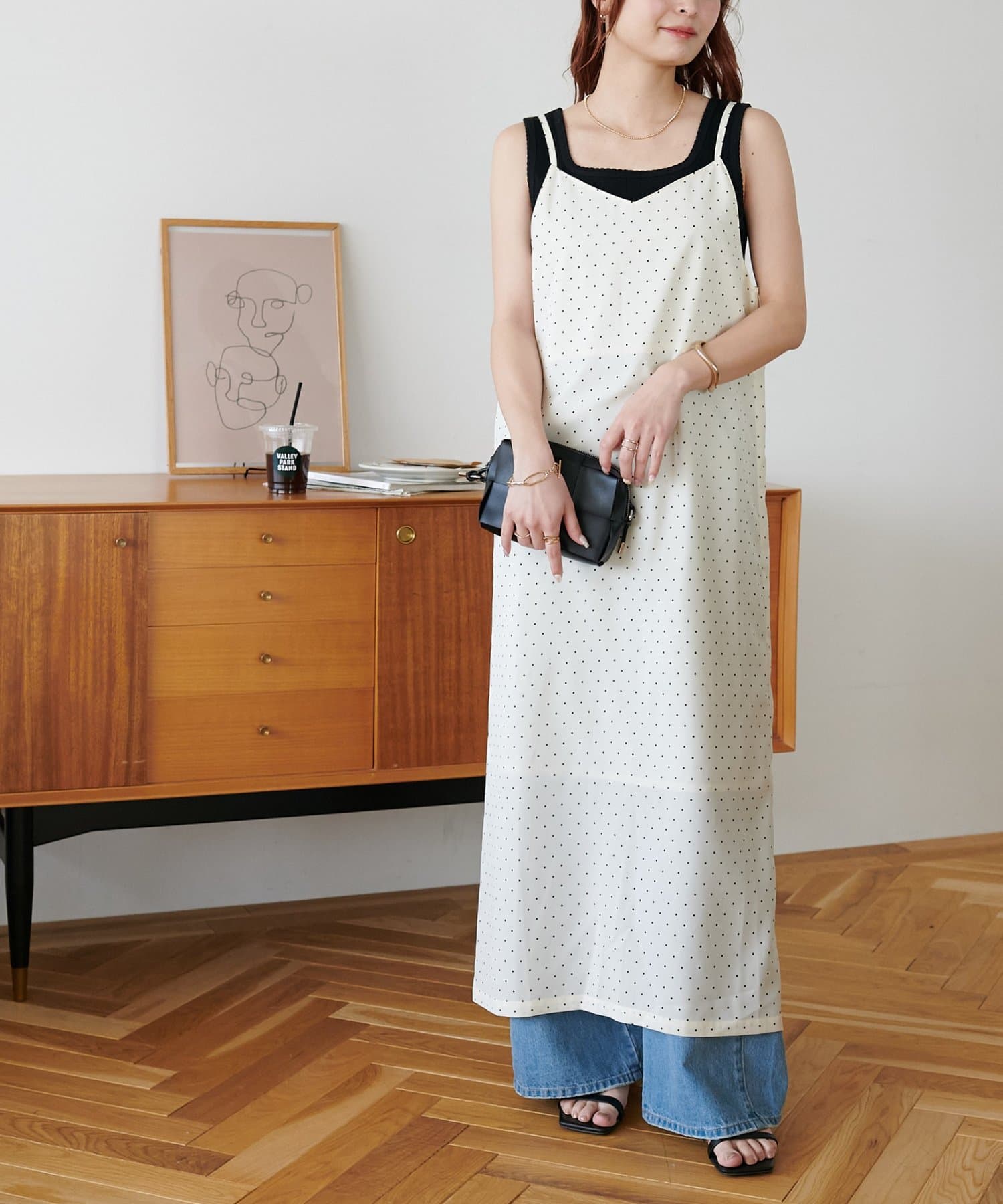 大人可愛い、ドット柄マキシキャミワンピース