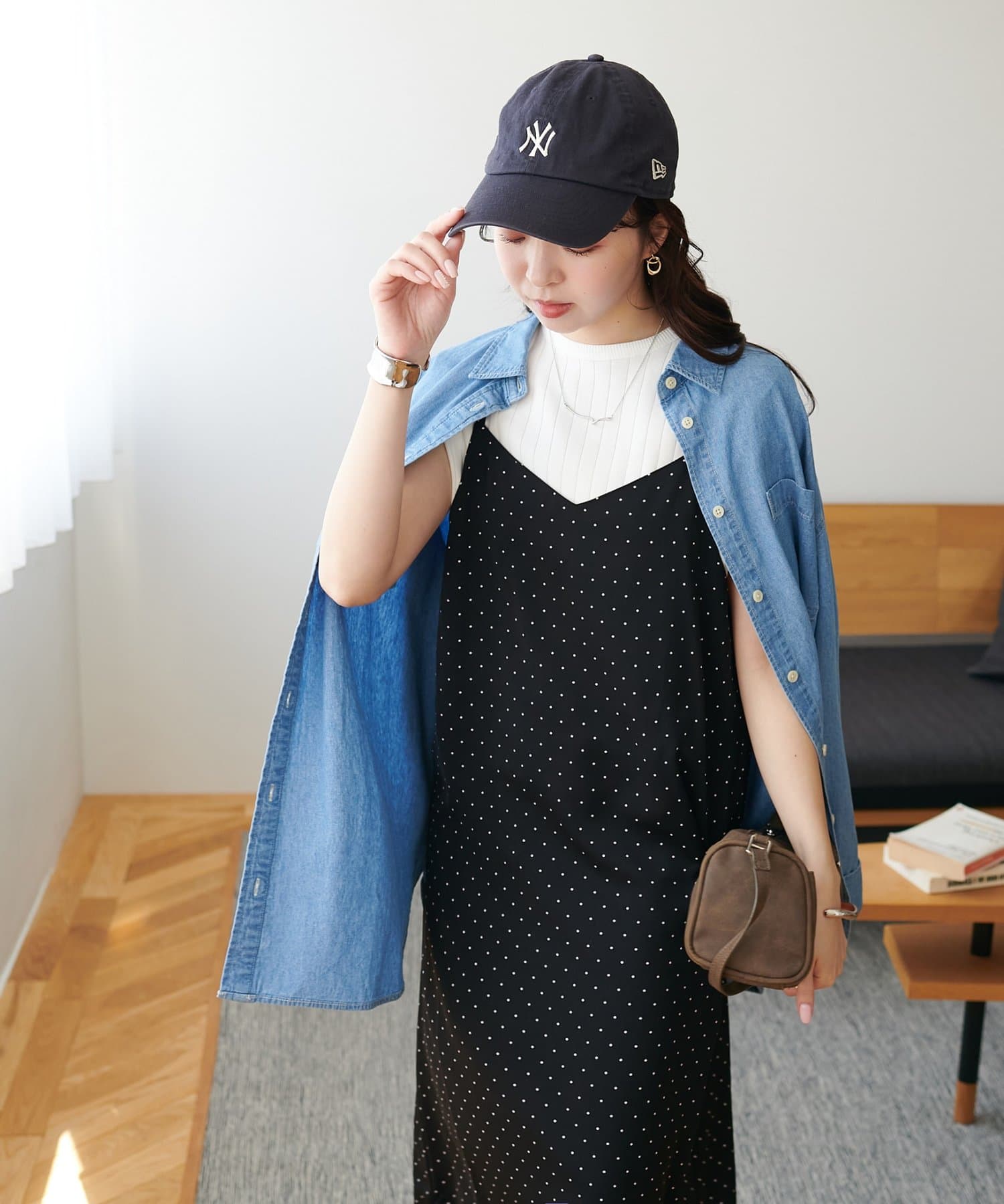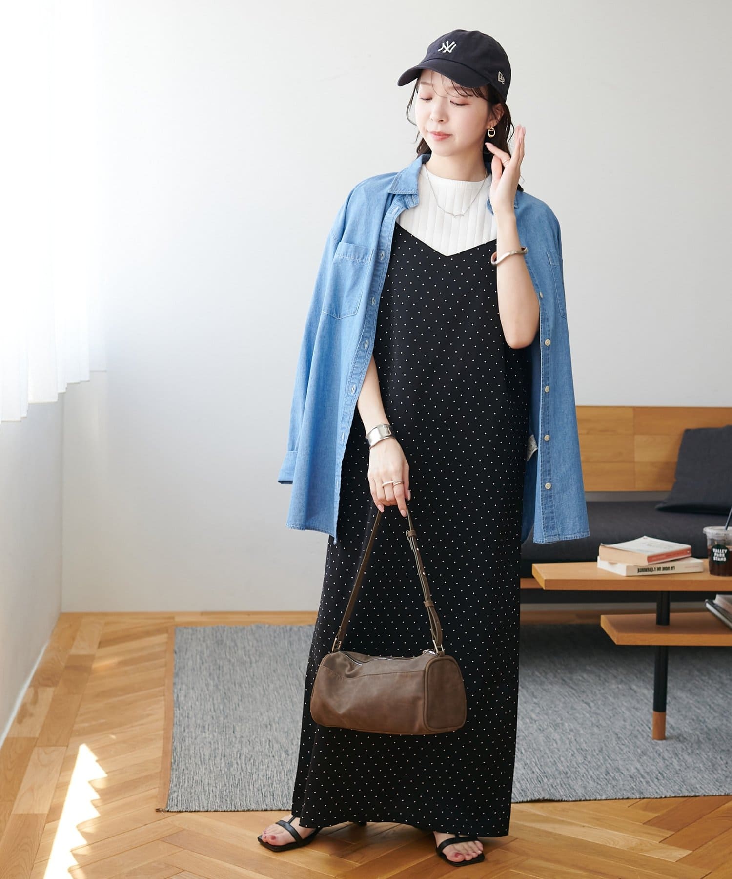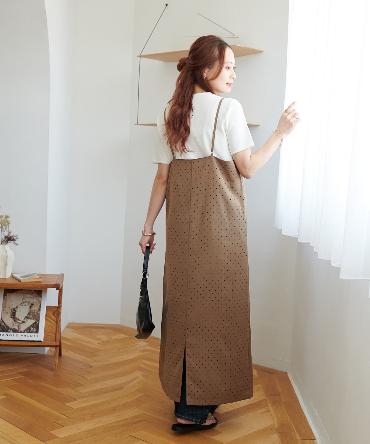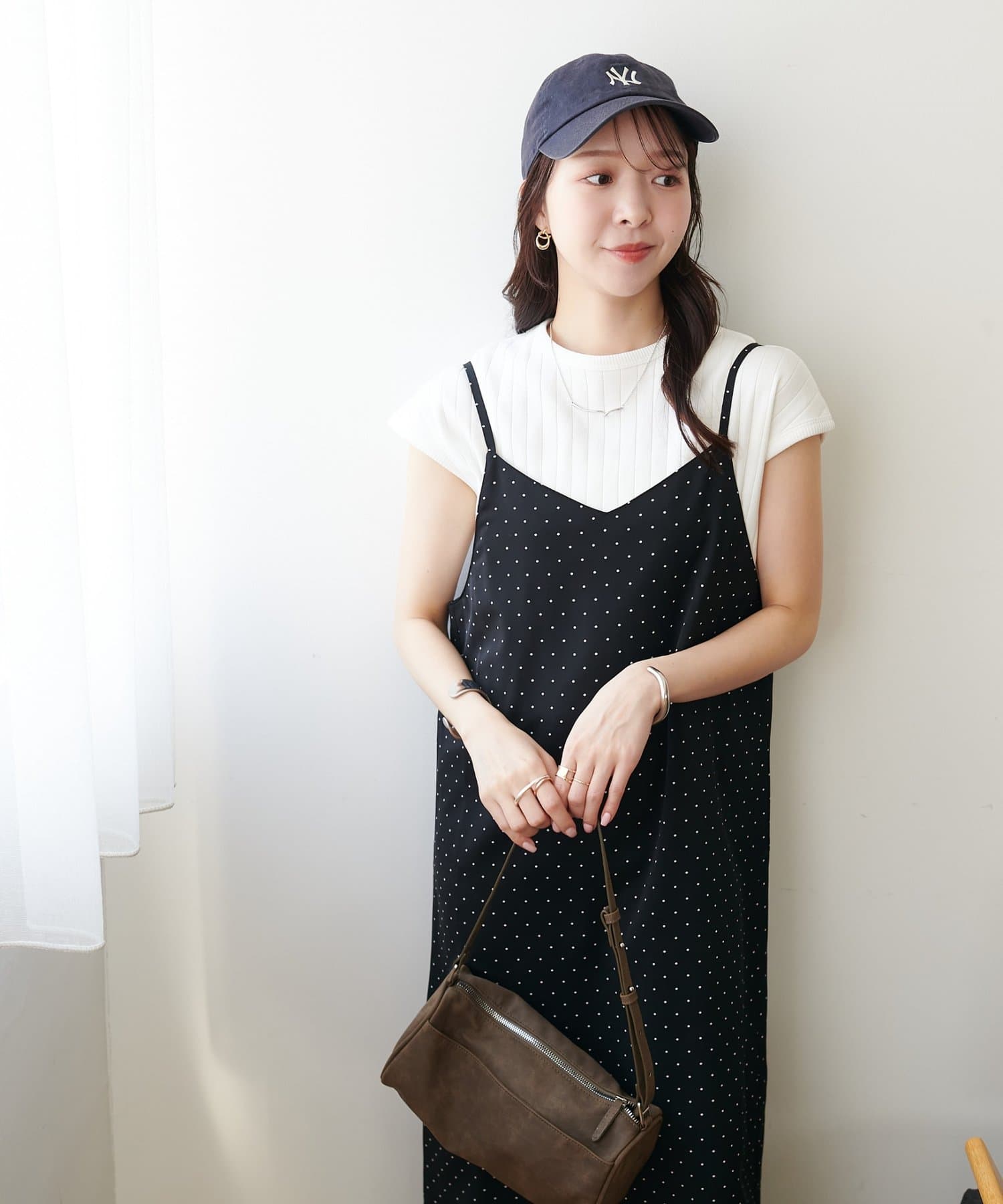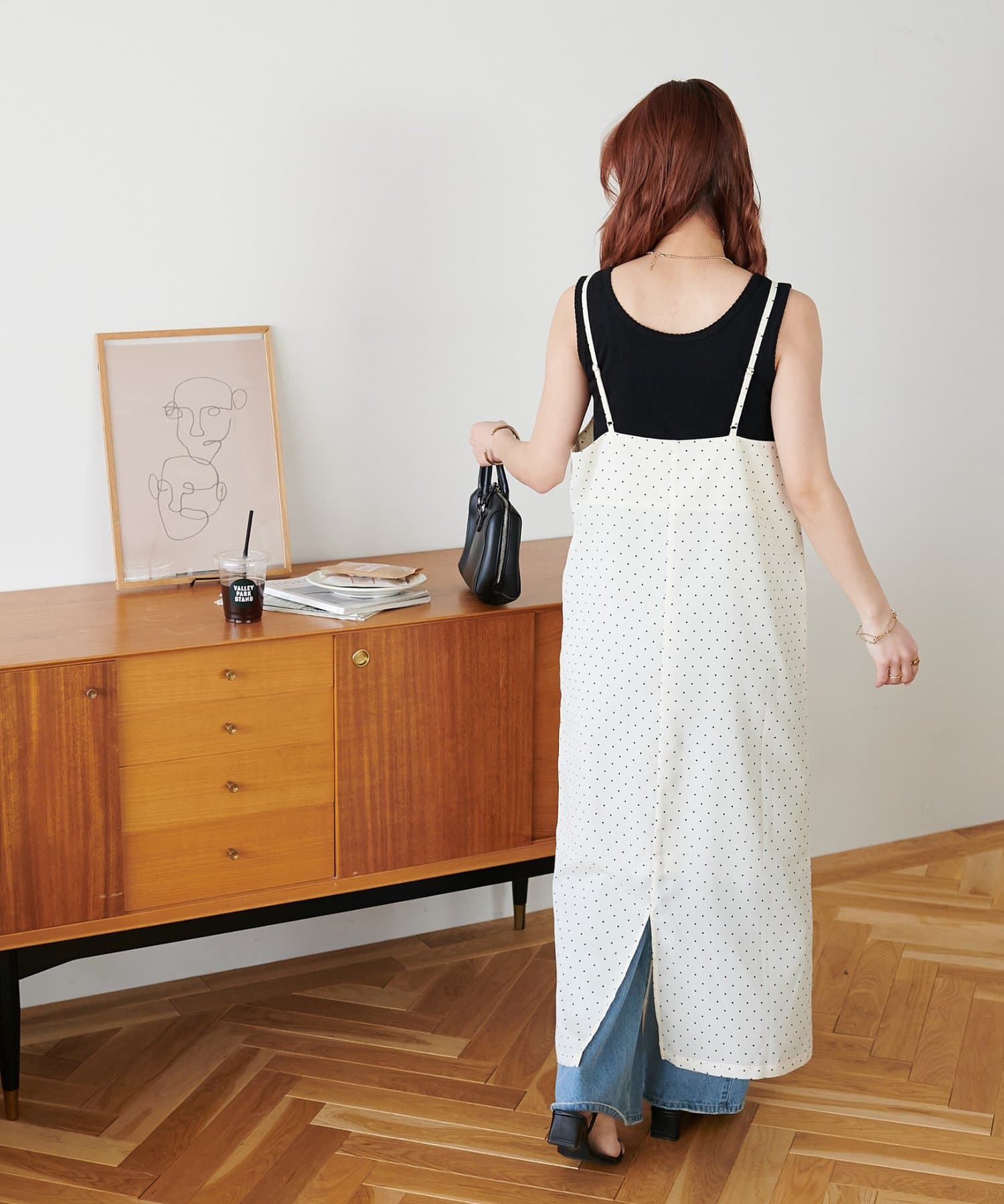 大人可愛い、ドット柄マキシキャミワンピース