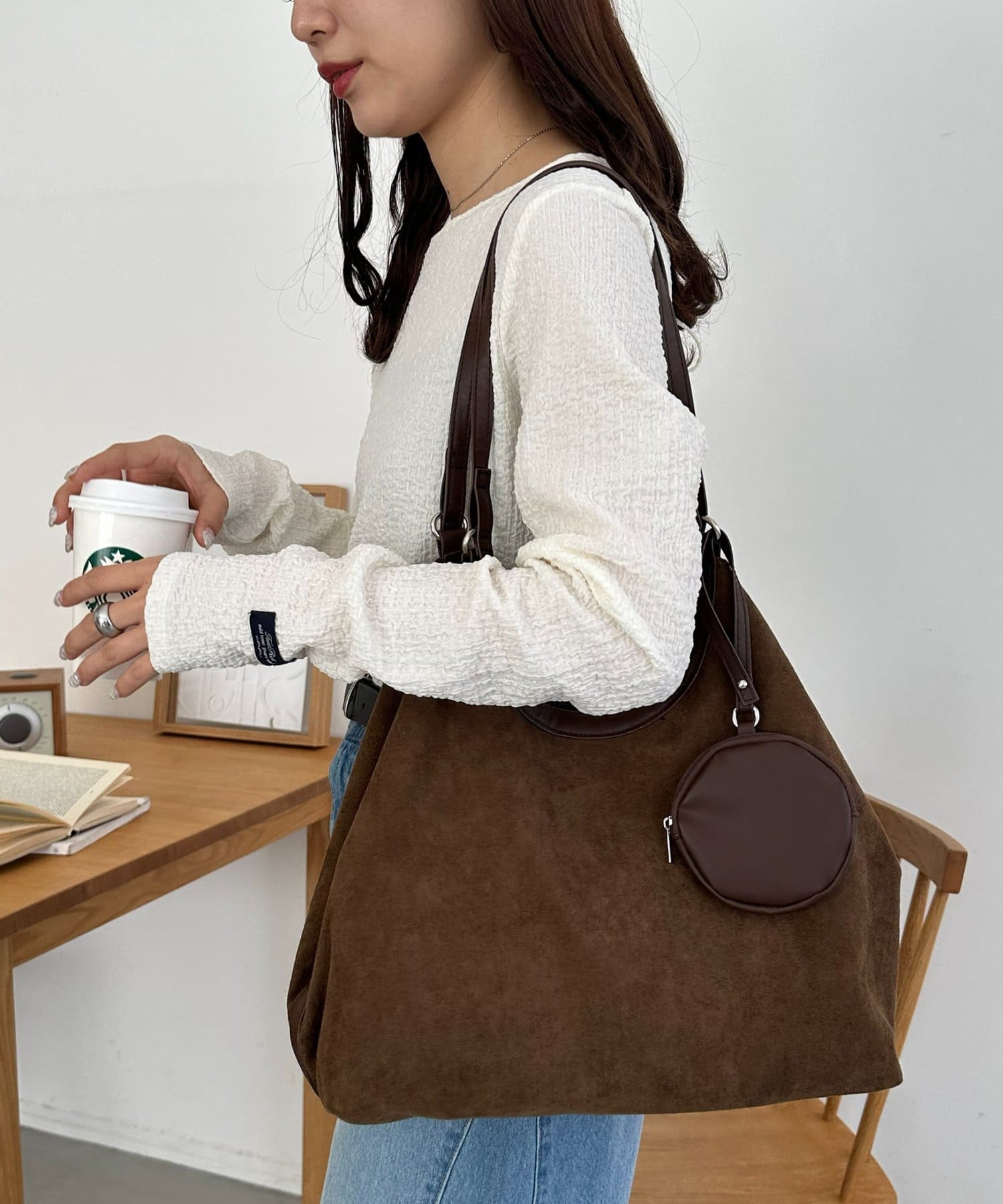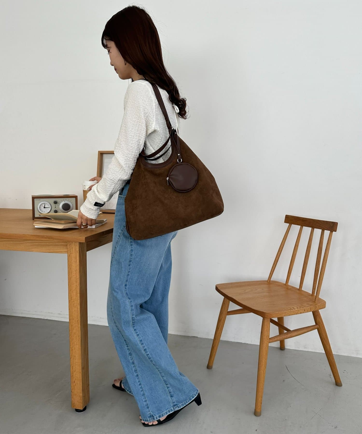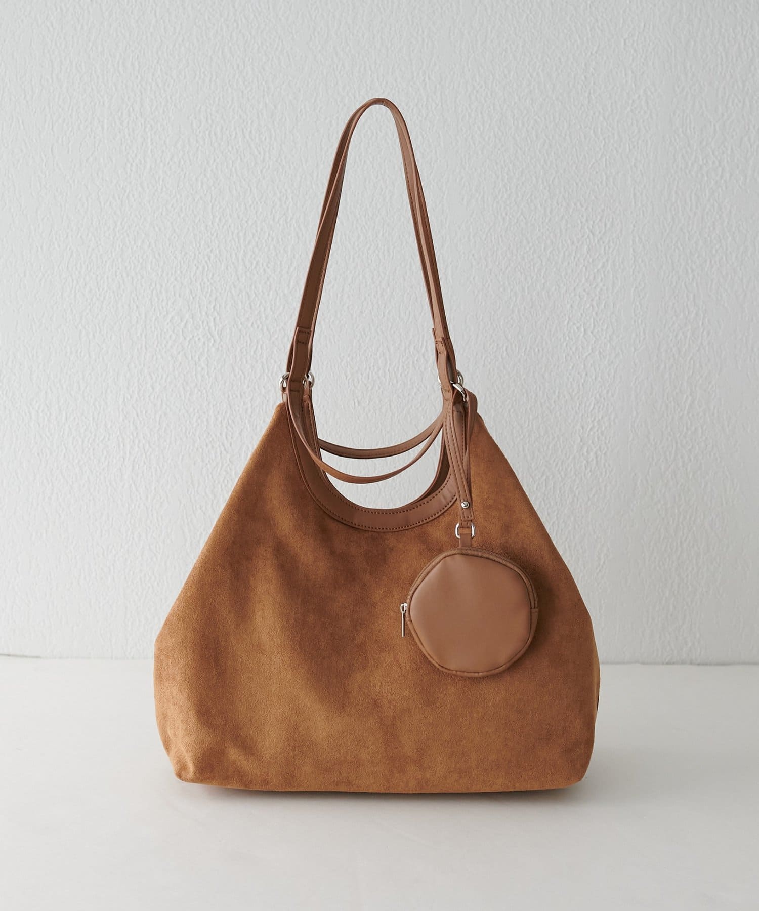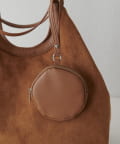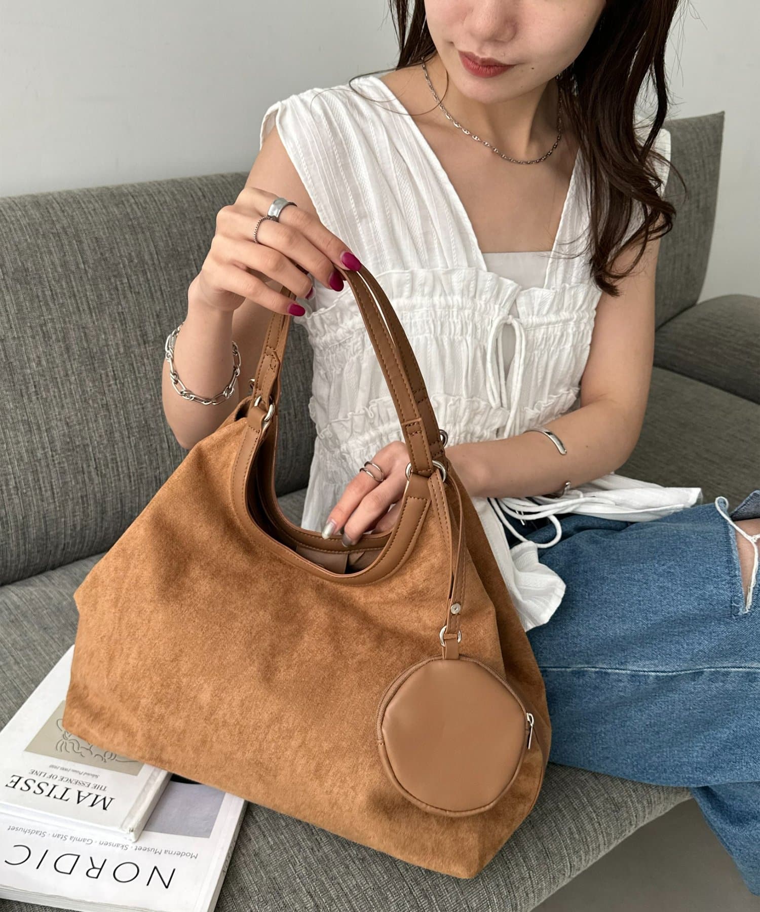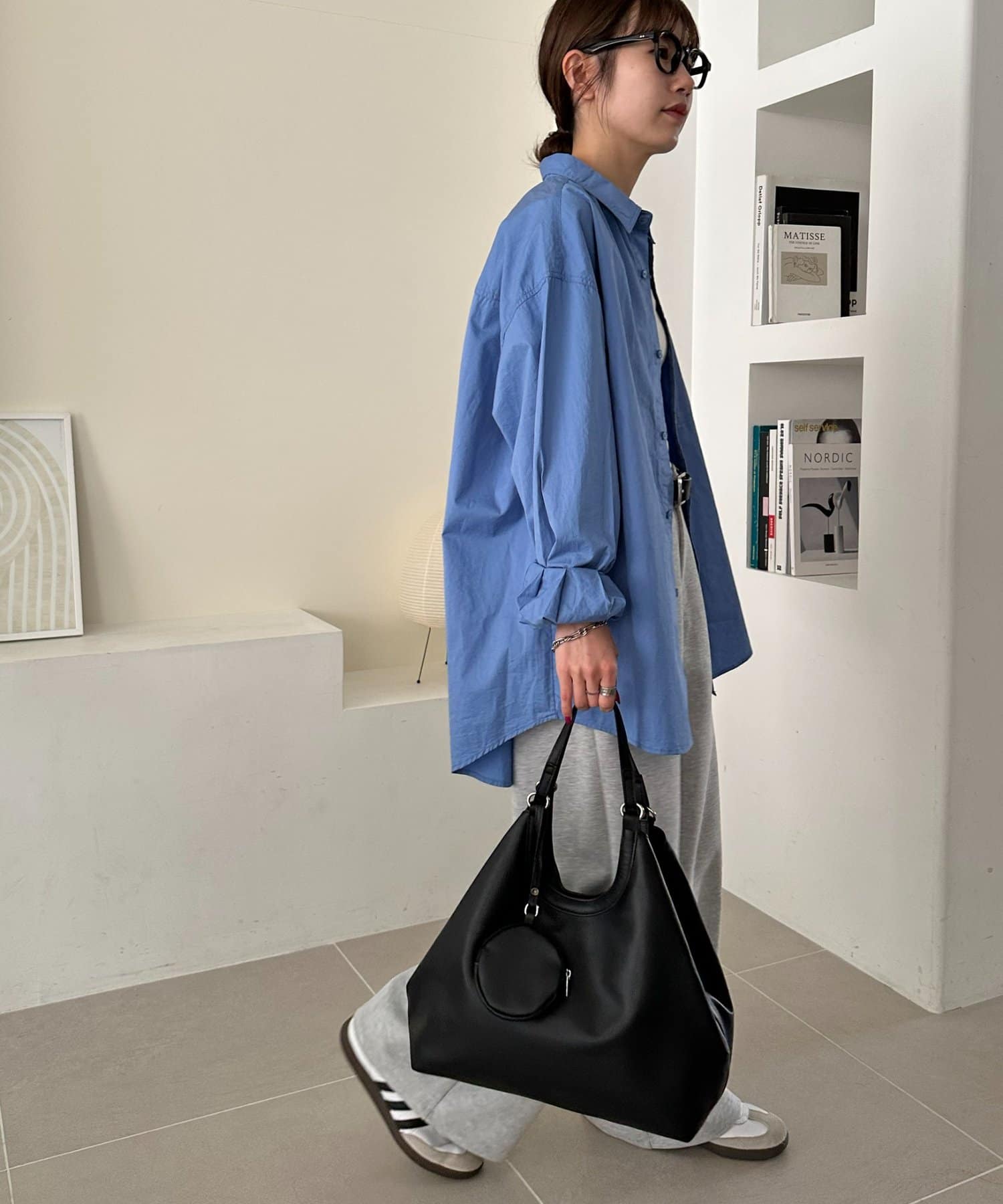 A4ファイルが横向きにすっぽりと収まるサイズ感で、デイリーユースはもちろん、通勤や通学用のバッグとしても最適◎持ち手が2つ付いているので、2WAYの持ち方ができます。また、ワイヤレスイヤホンやリップクリームなどの小物収納に重宝する、取り外し可能な丸型ミニポーチが付属しているのも魅力!