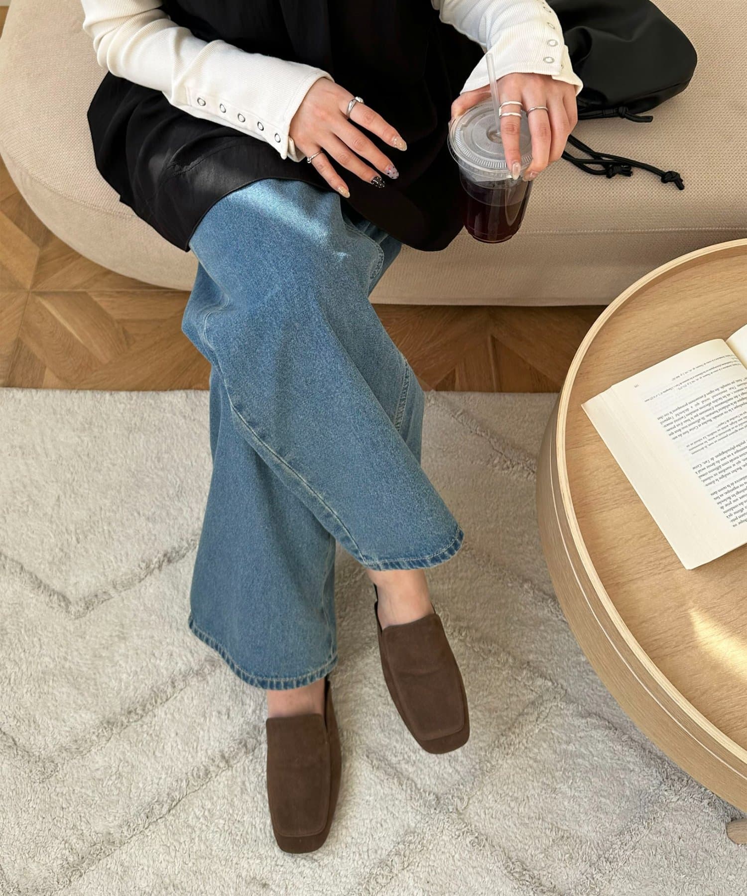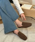 忙しい朝もさっと履ける、スリッパのように気軽に足入れできる手軽さが最大の魅力!甲をすっきり見せるカッティングとスクエアトゥは、パンツスタイルからスカート、ワンピースまで幅広くマッチ。クッション性のある中敷きが、足裏への衝撃を和らげ、長時間歩いても疲れにくい安定感を叶えます。さらに、甲をしっかりとホールドするデザインなので、かかとがなくても脱げにくいのもポイントの一つ。スウェード調のカラーは靴下にスウェード特有の素材が付かないように内側は合皮にしました!素足ではもちろん、靴下を合わせをすればロングシーズンお楽しみいただけま♪